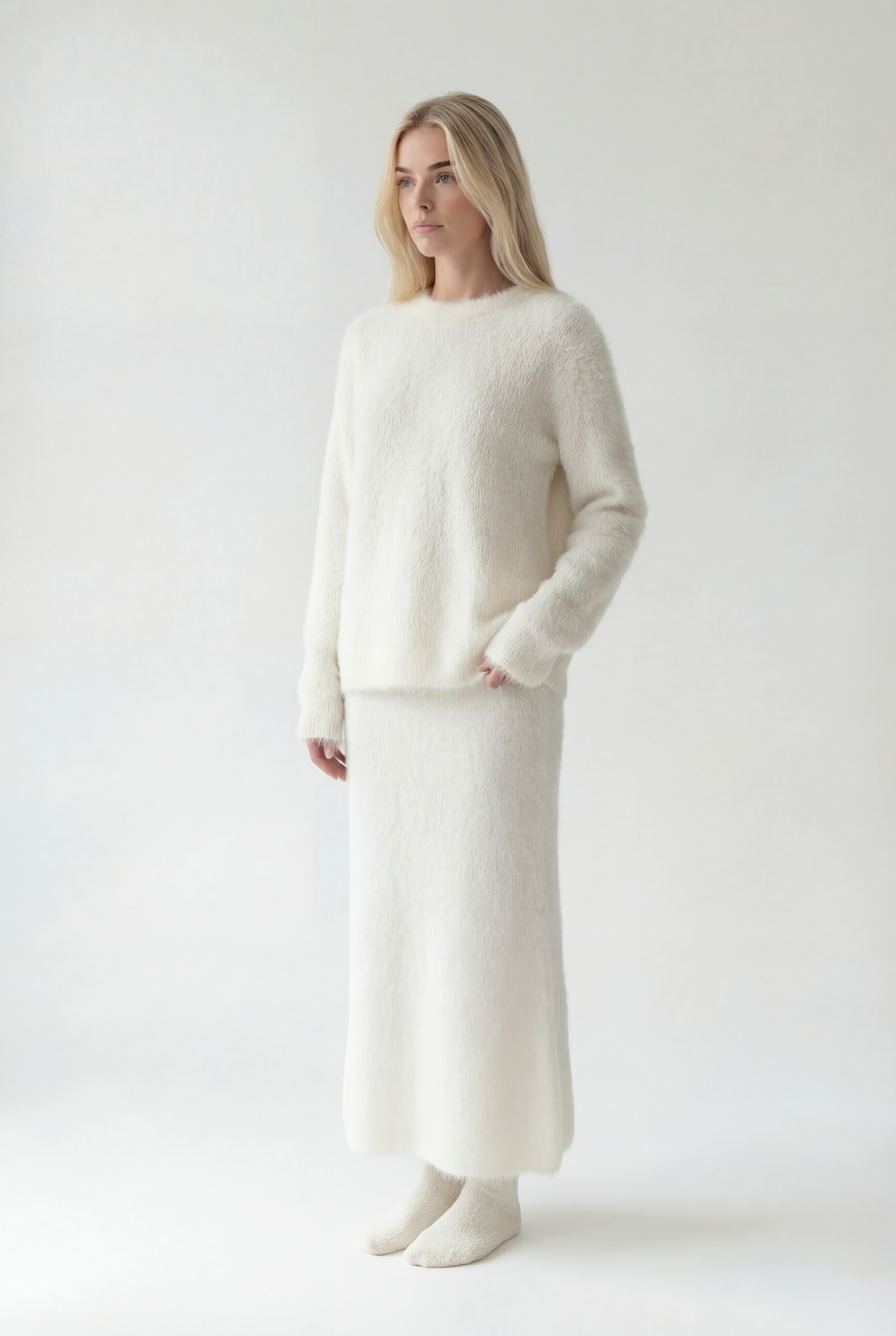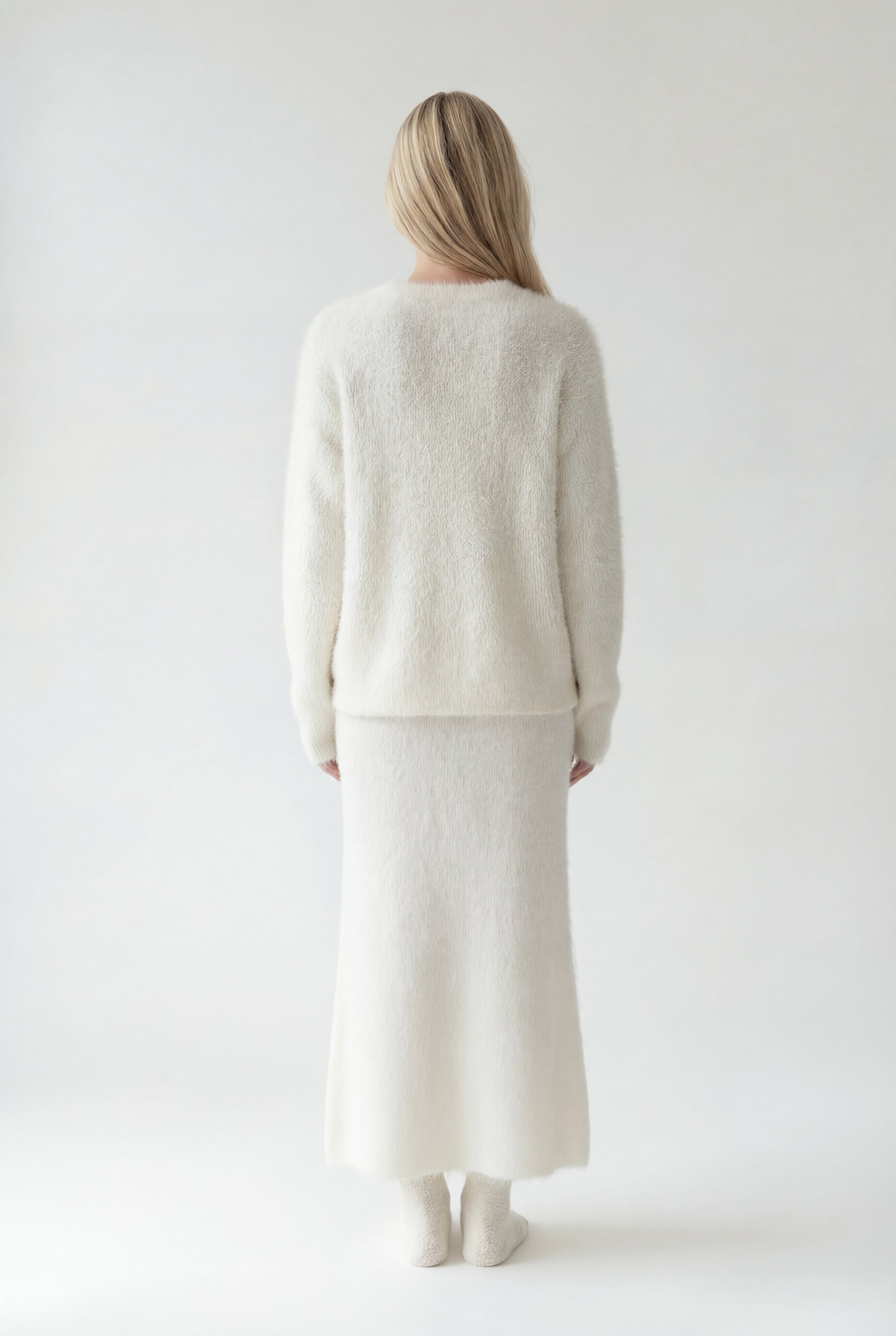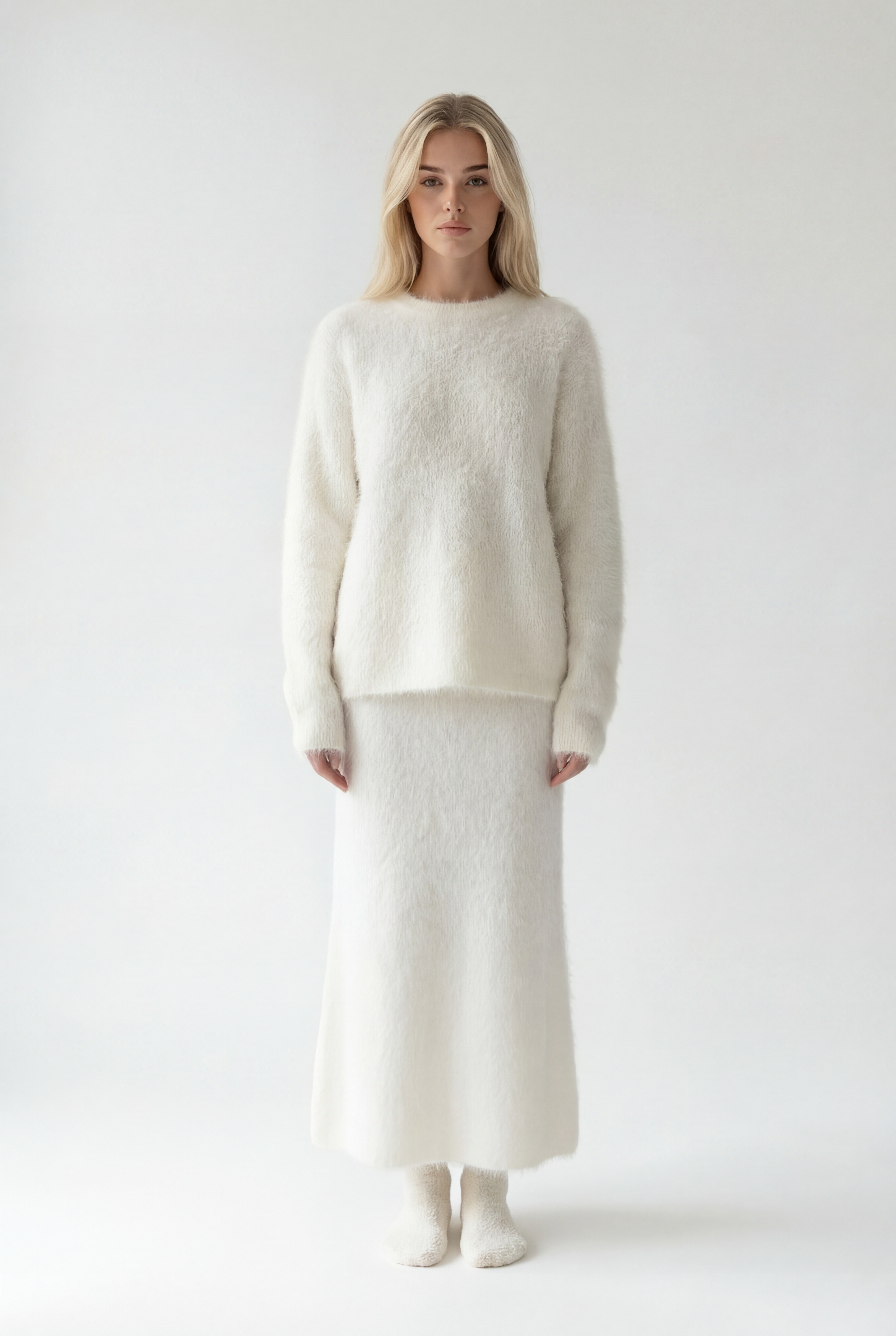 Komplektas sukurtas toms dienoms, kai norisi šilumos, jaukumo ir subtilaus išskirtinumo. Pūkuotas megztas audinys suteikia švelnią tekstūrą, o derinys su sijonu sukuria modernų, lengvai elegantišką siluetą.