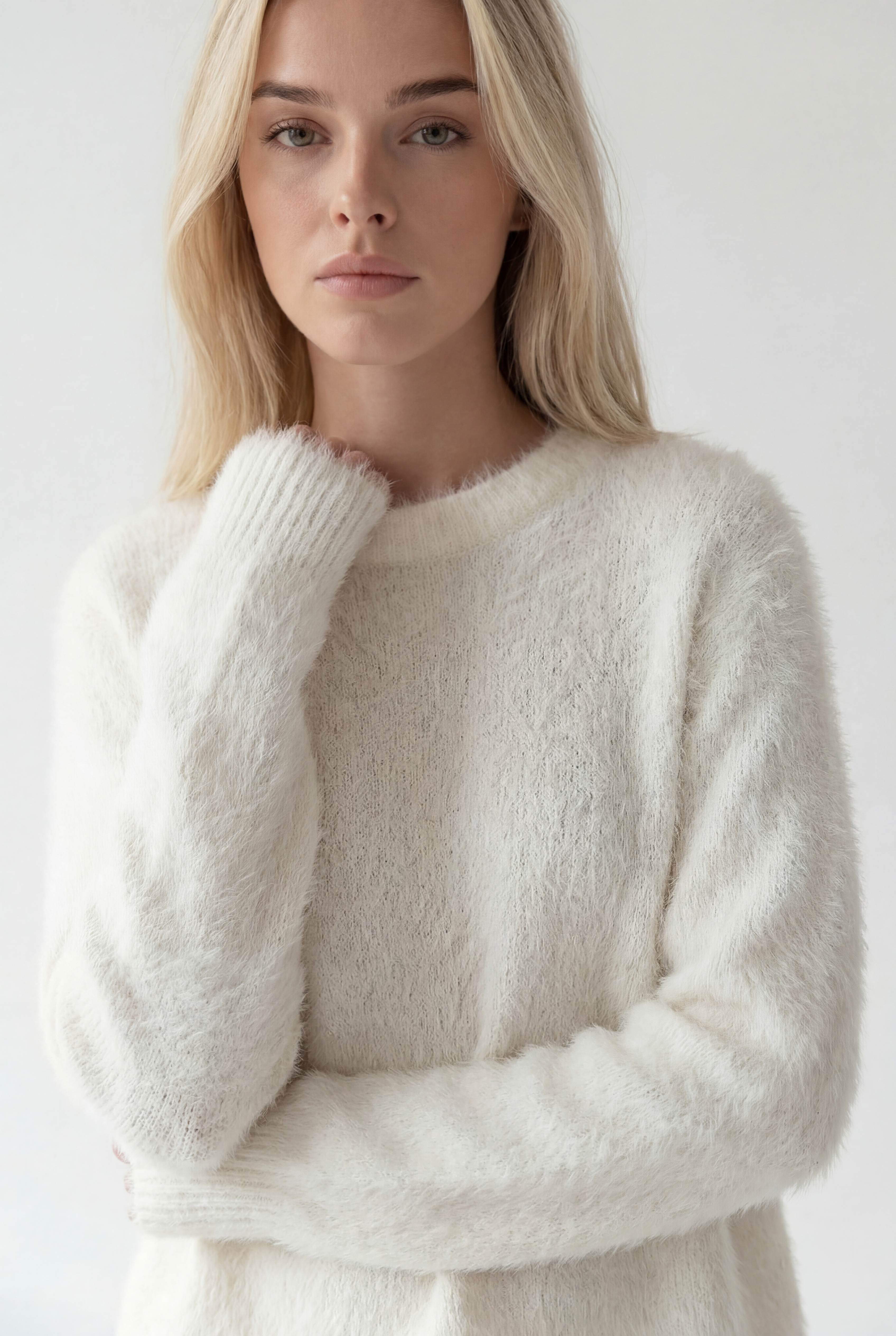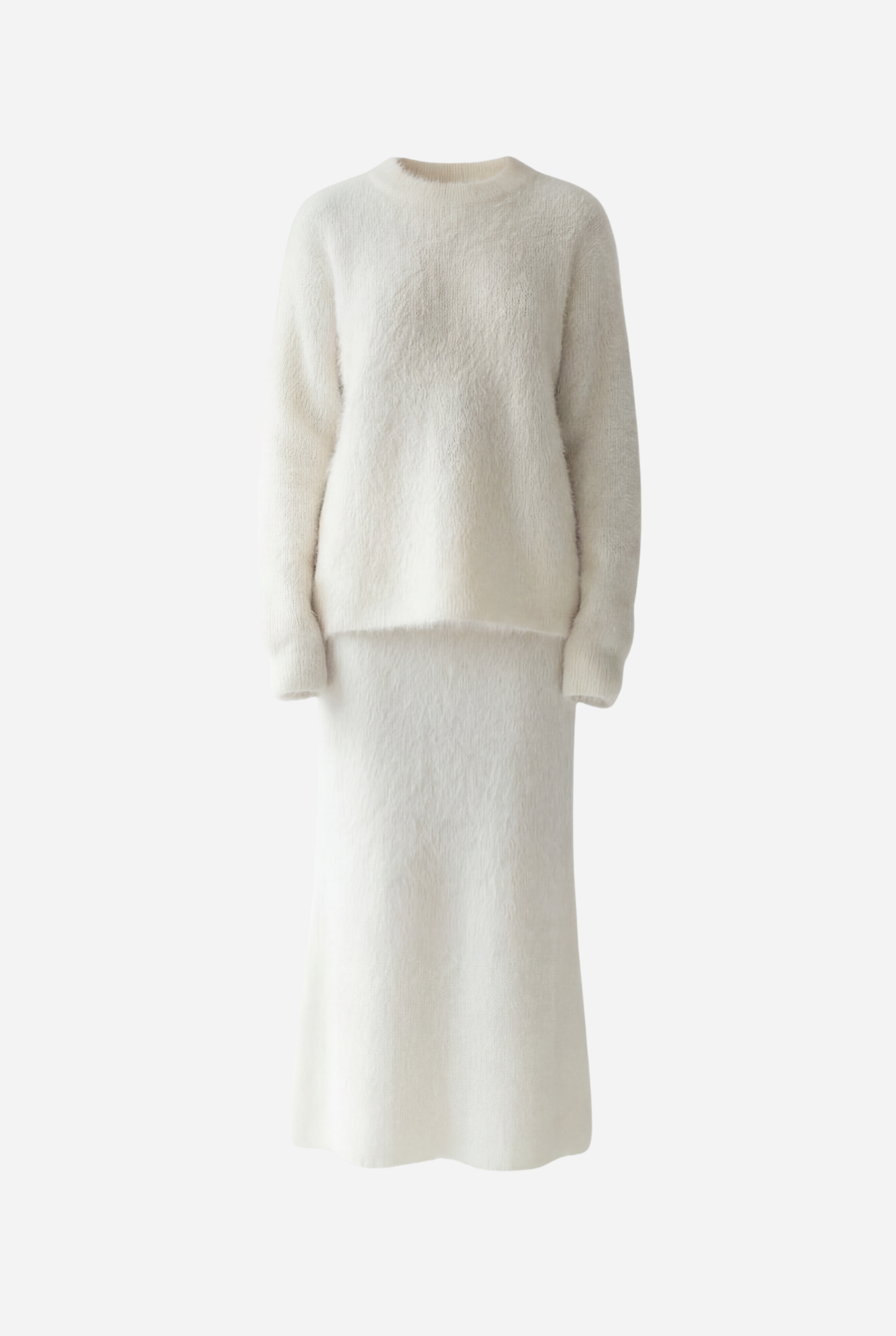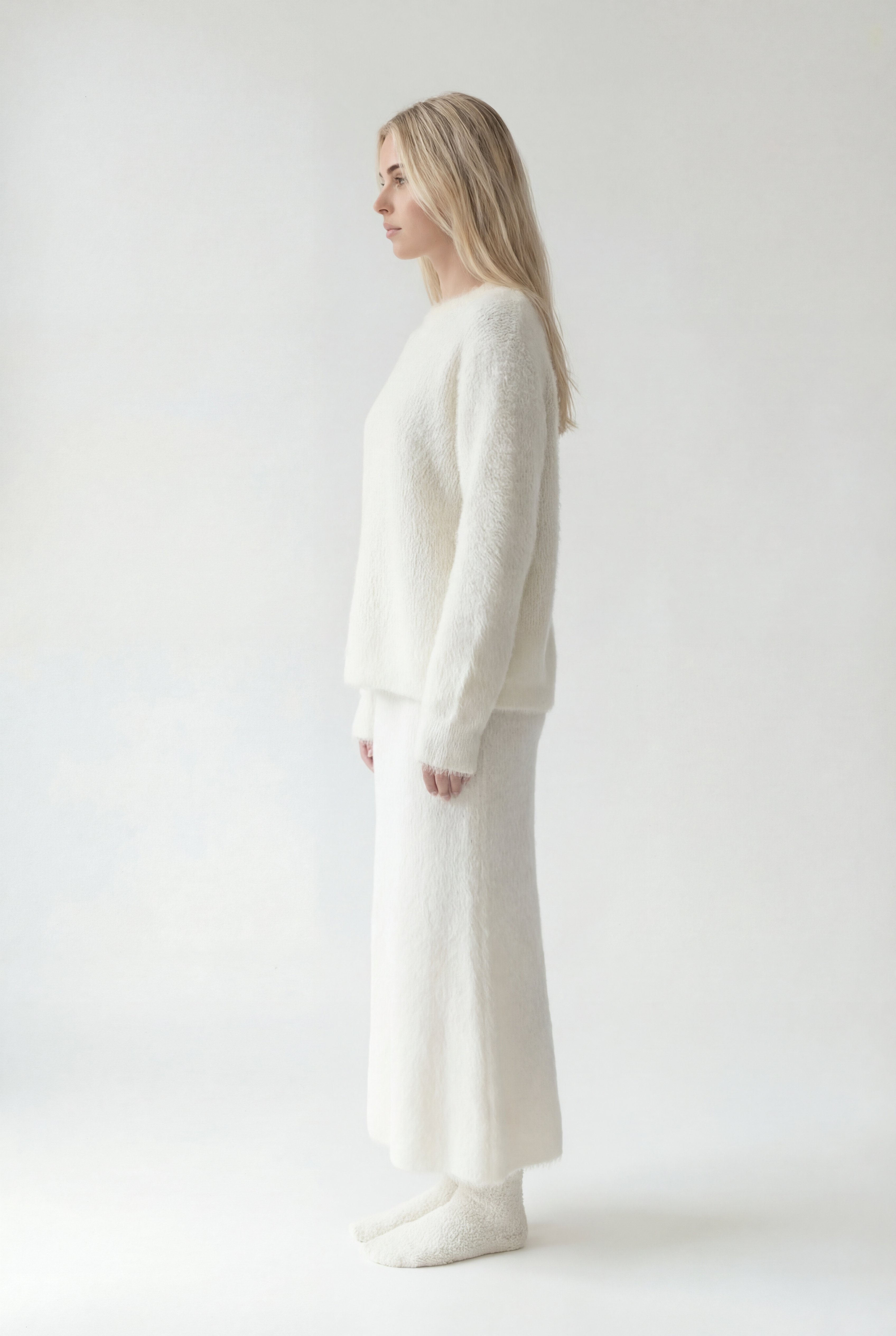 Komplektas sukurtas toms dienoms, kai norisi šilumos, jaukumo ir subtilaus išskirtinumo. Pūkuotas megztas audinys suteikia švelnią tekstūrą, o derinys su sijonu sukuria modernų, lengvai elegantišką siluetą.