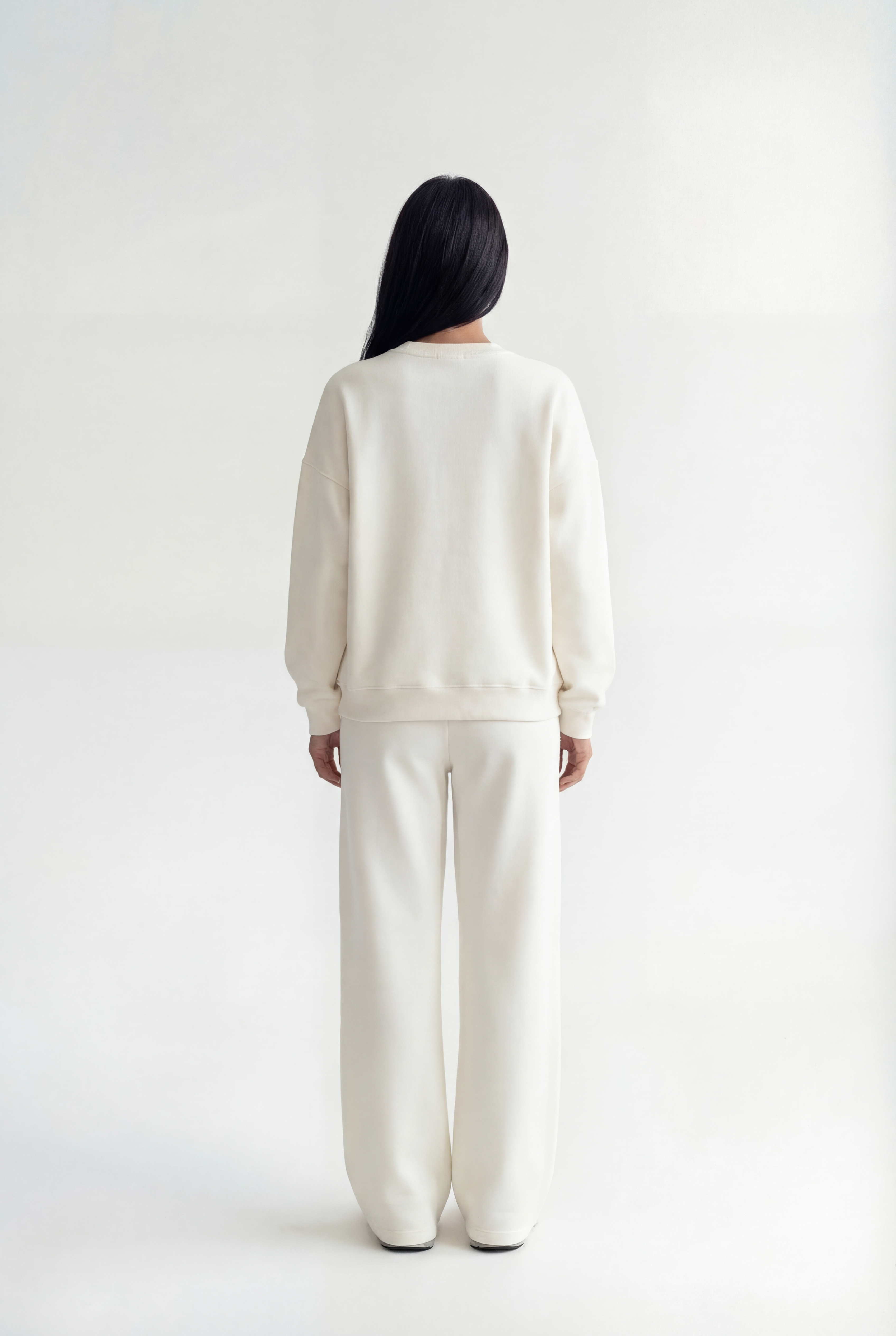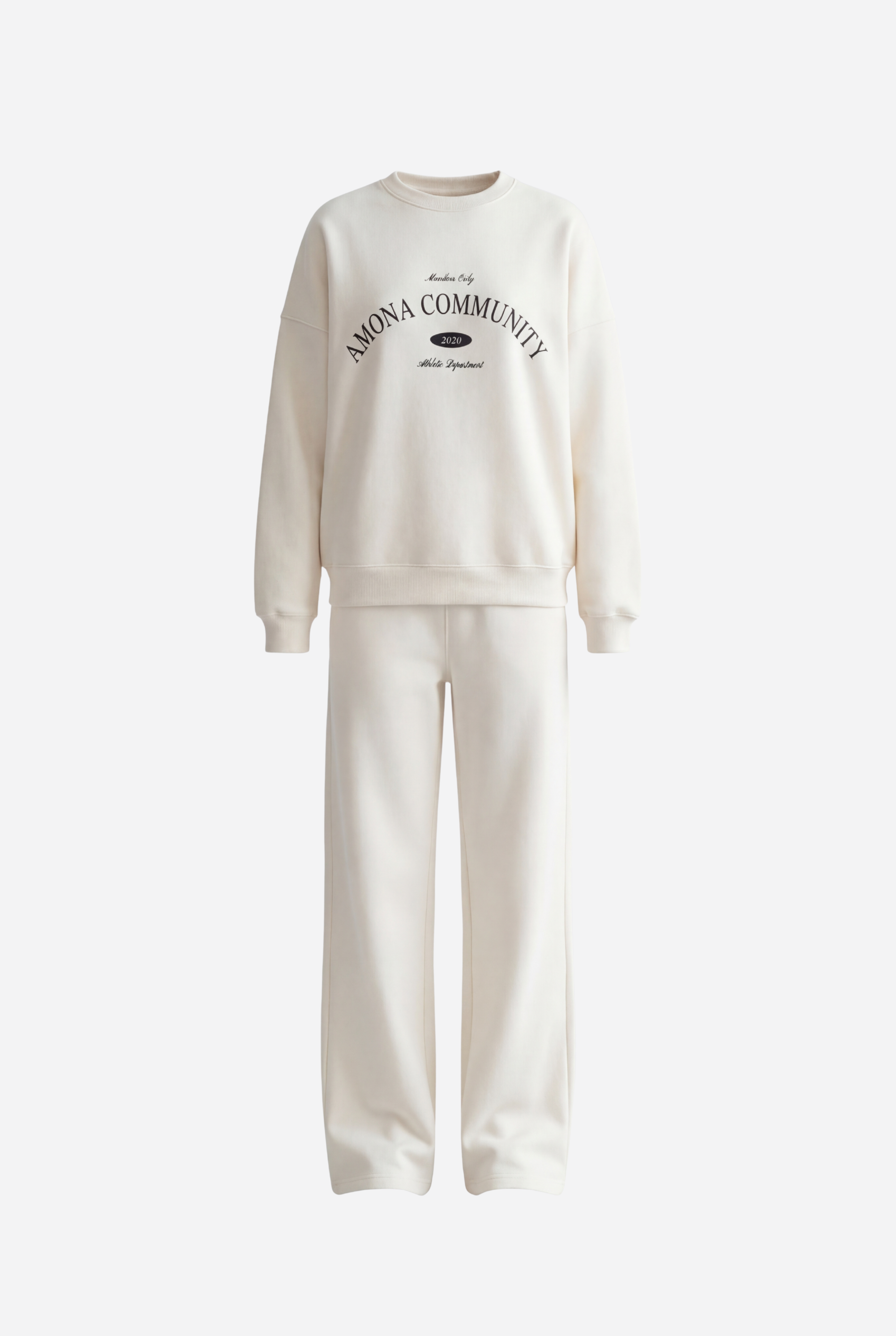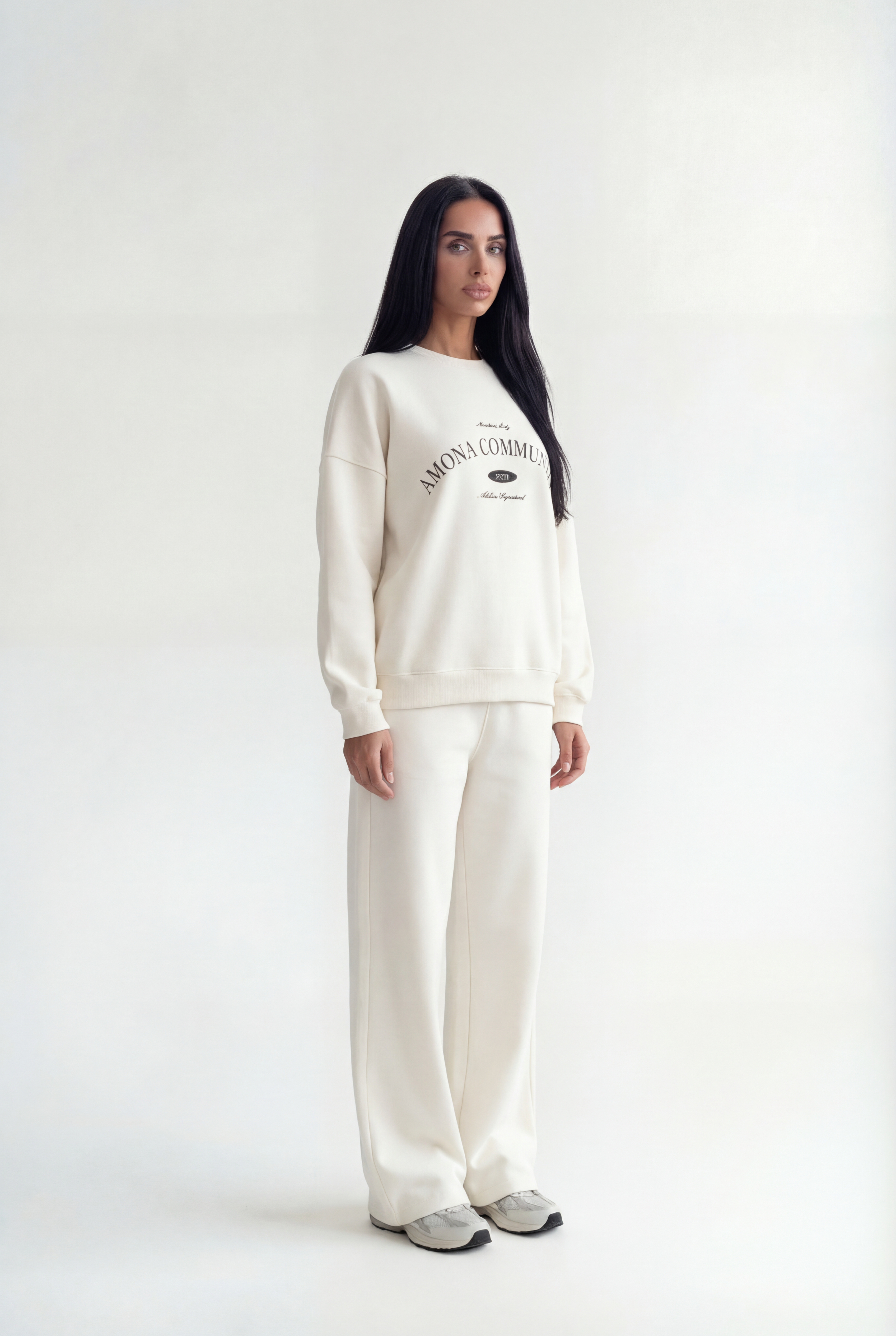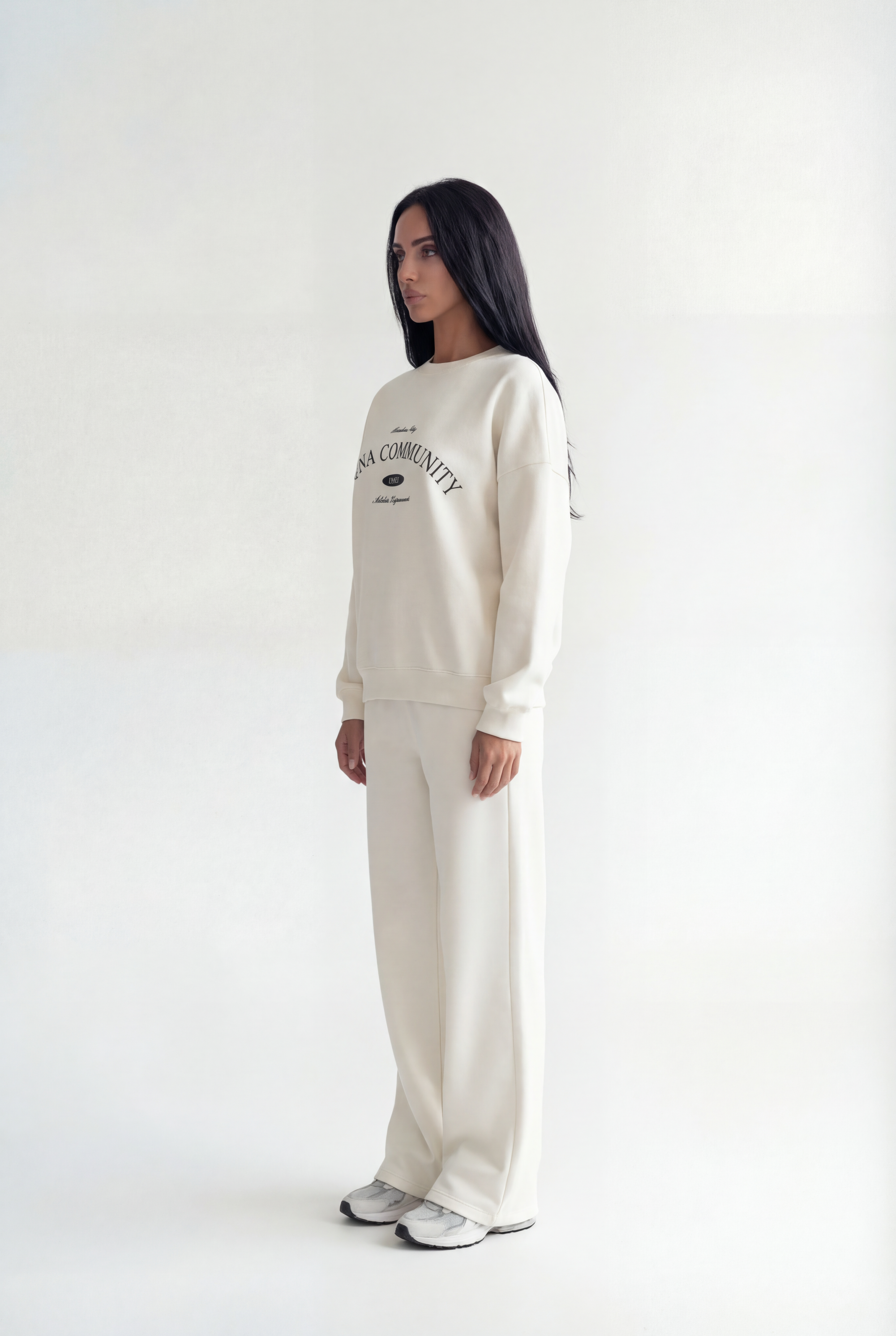 Stilingas komplektas, įkvėptas retro miesto mados: laisvas džemperio kirpimas su užrašu derinamas su tiesaus silueto ilgomis kelnėmis, kad suteiktų komfortą be kompromisų.