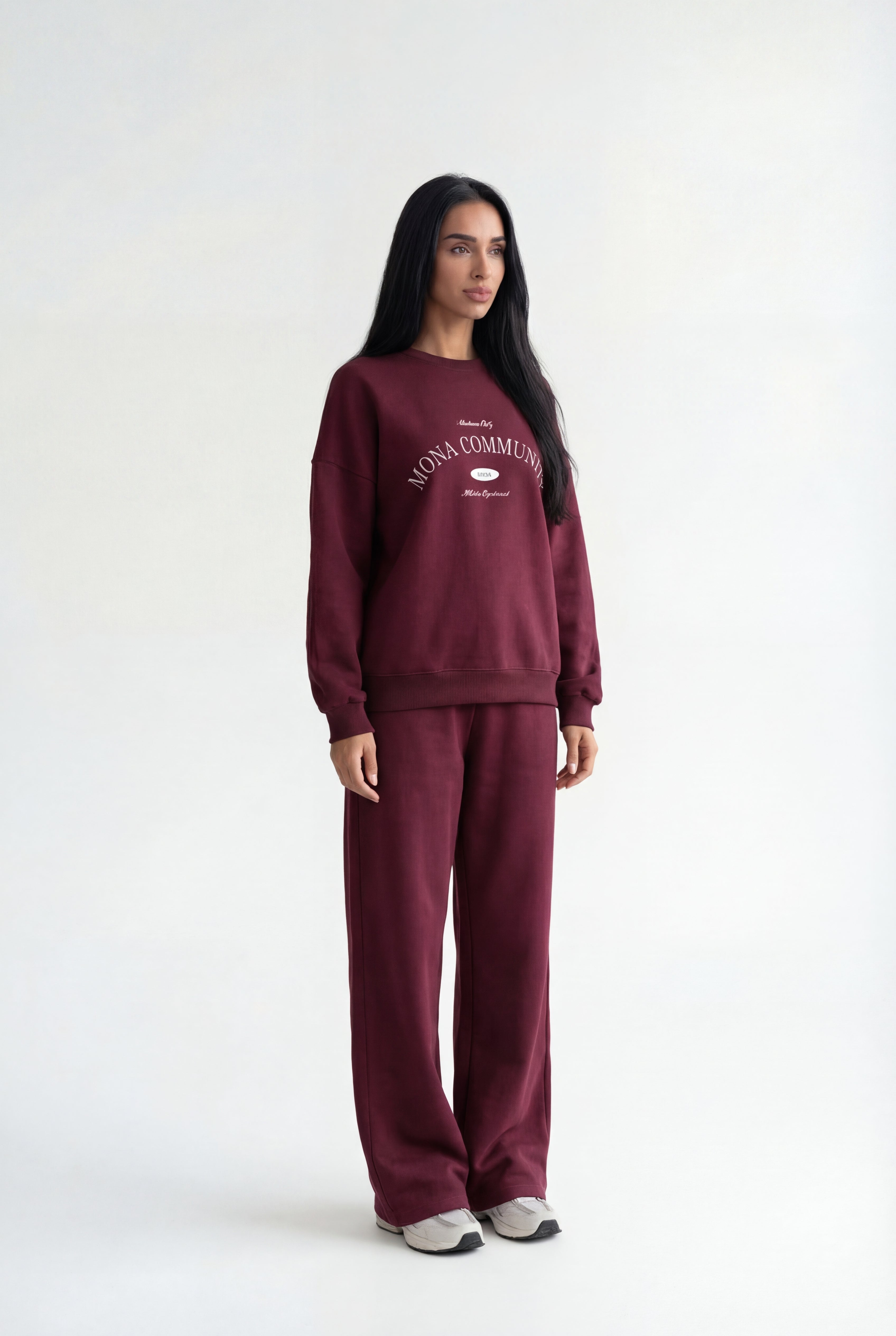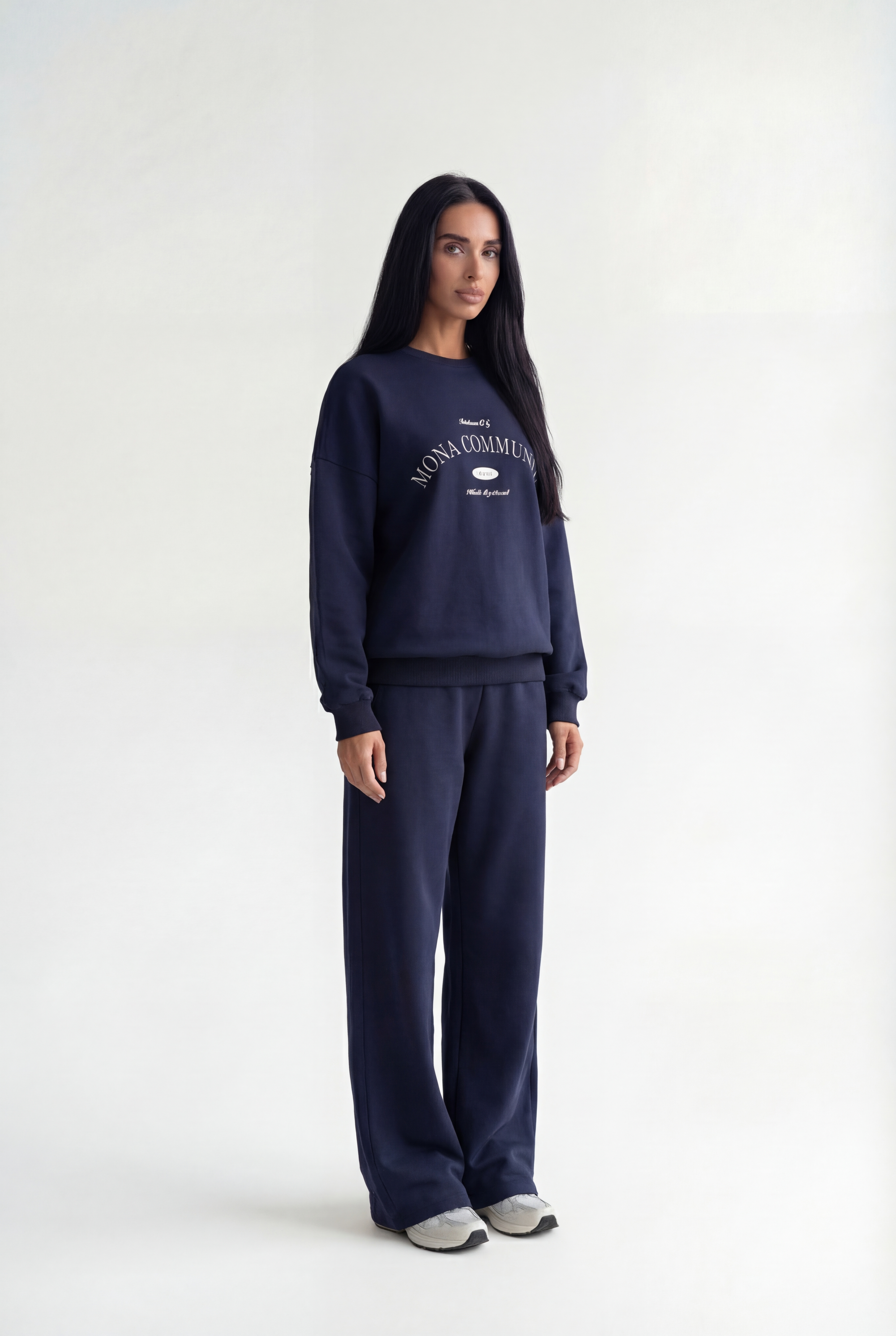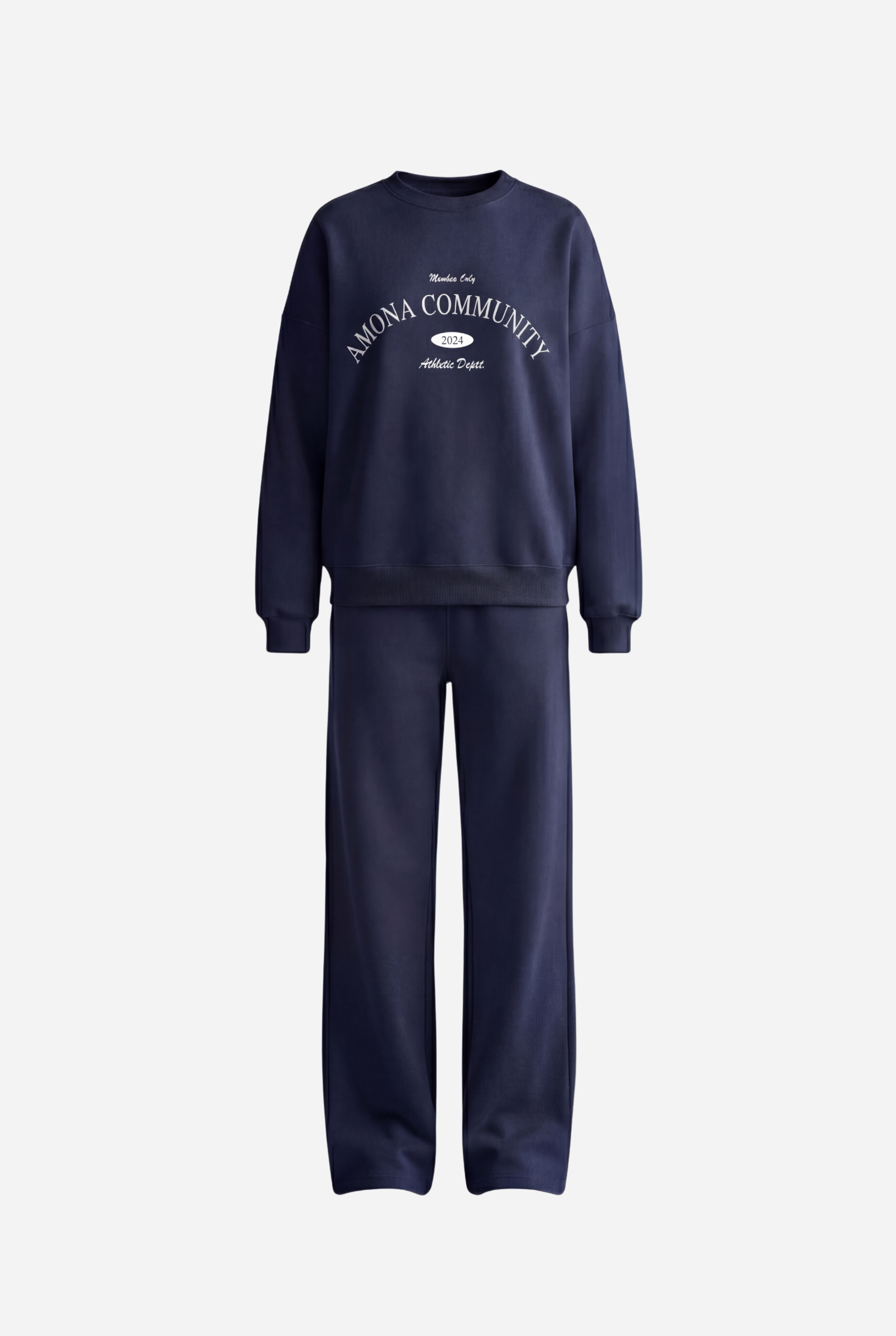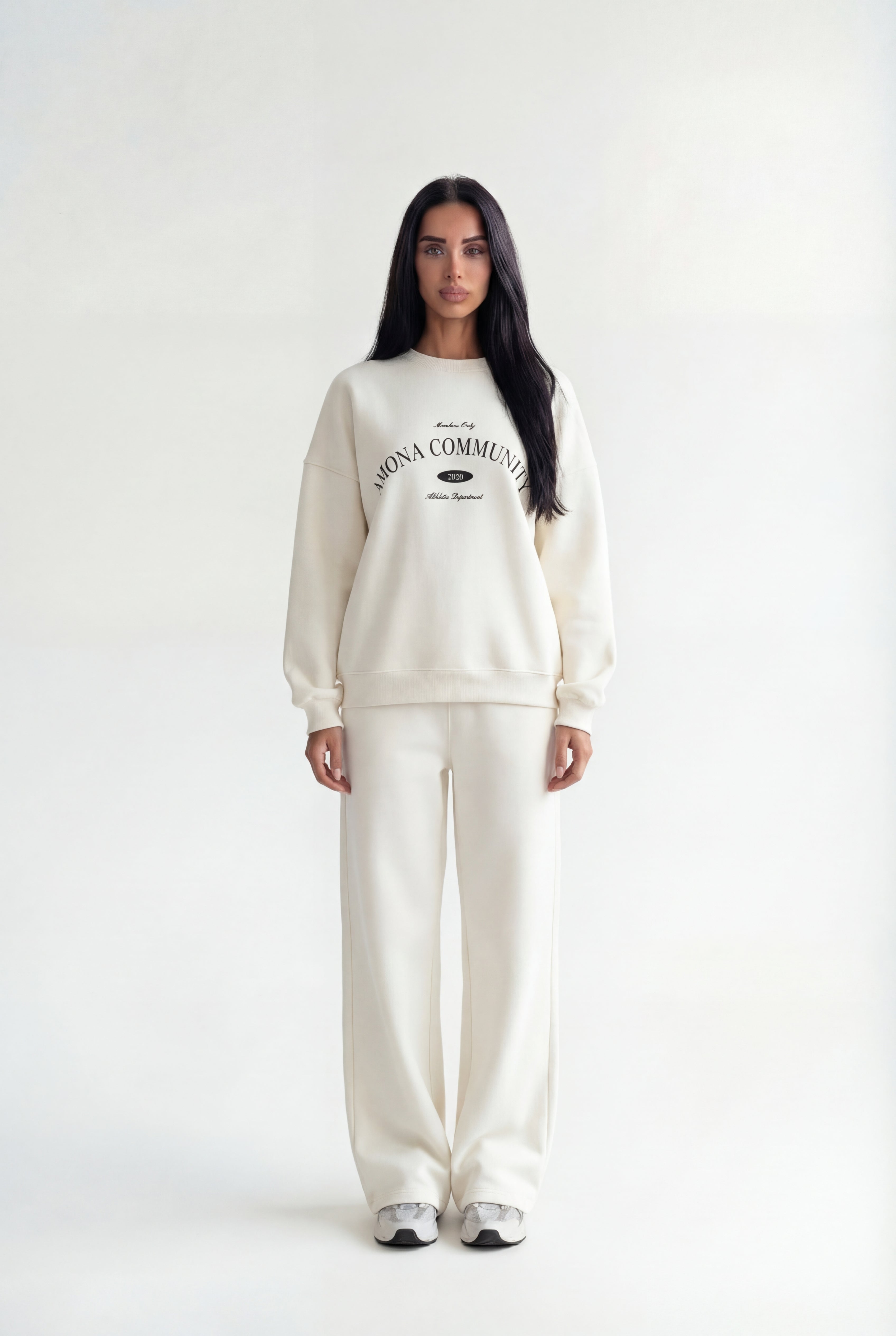 Stilingas komplektas, įkvėptas retro miesto mados: laisvas džemperio kirpimas su užrašu derinamas su tiesaus silueto ilgomis kelnėmis, kad suteiktų komfortą be kompromisų.