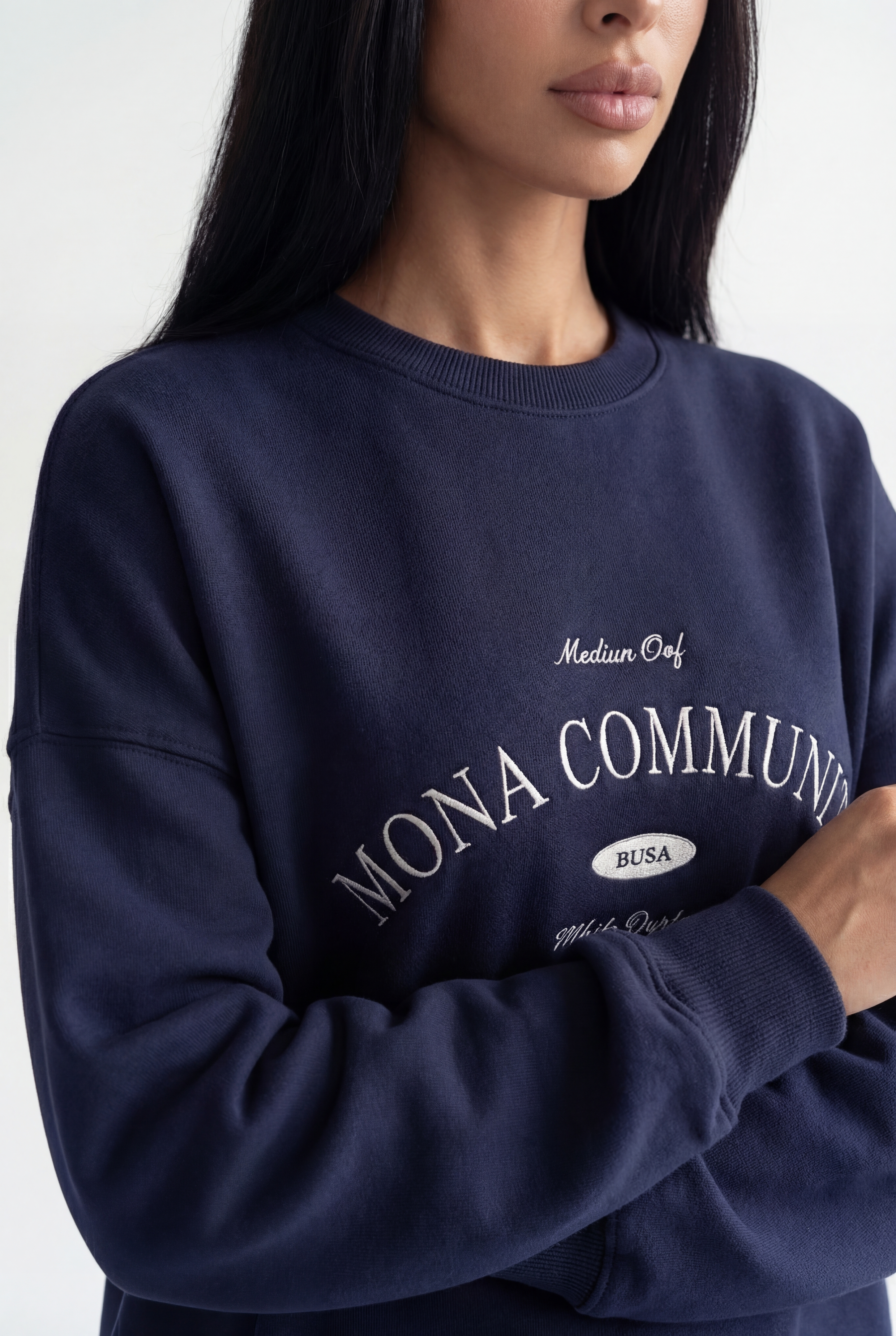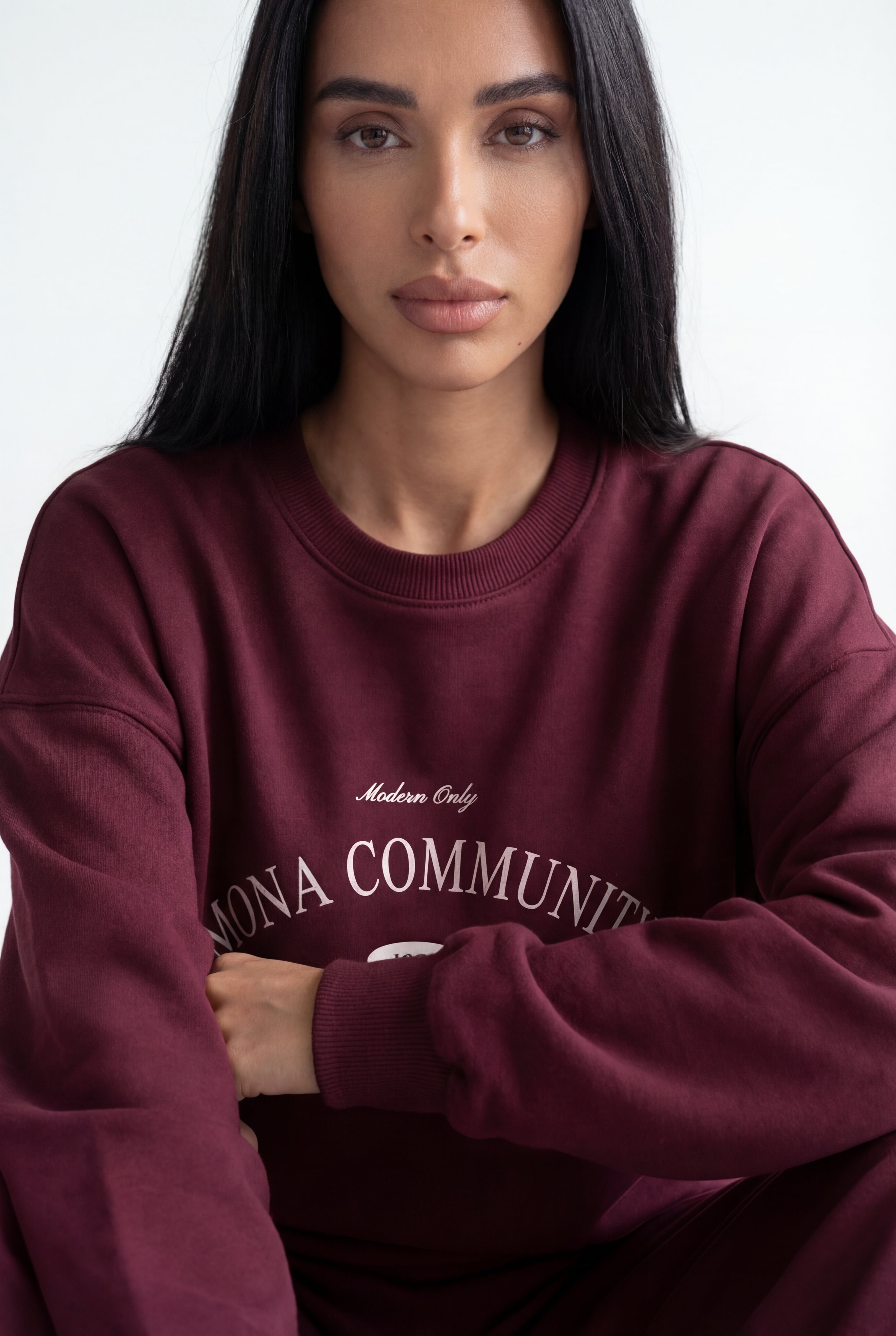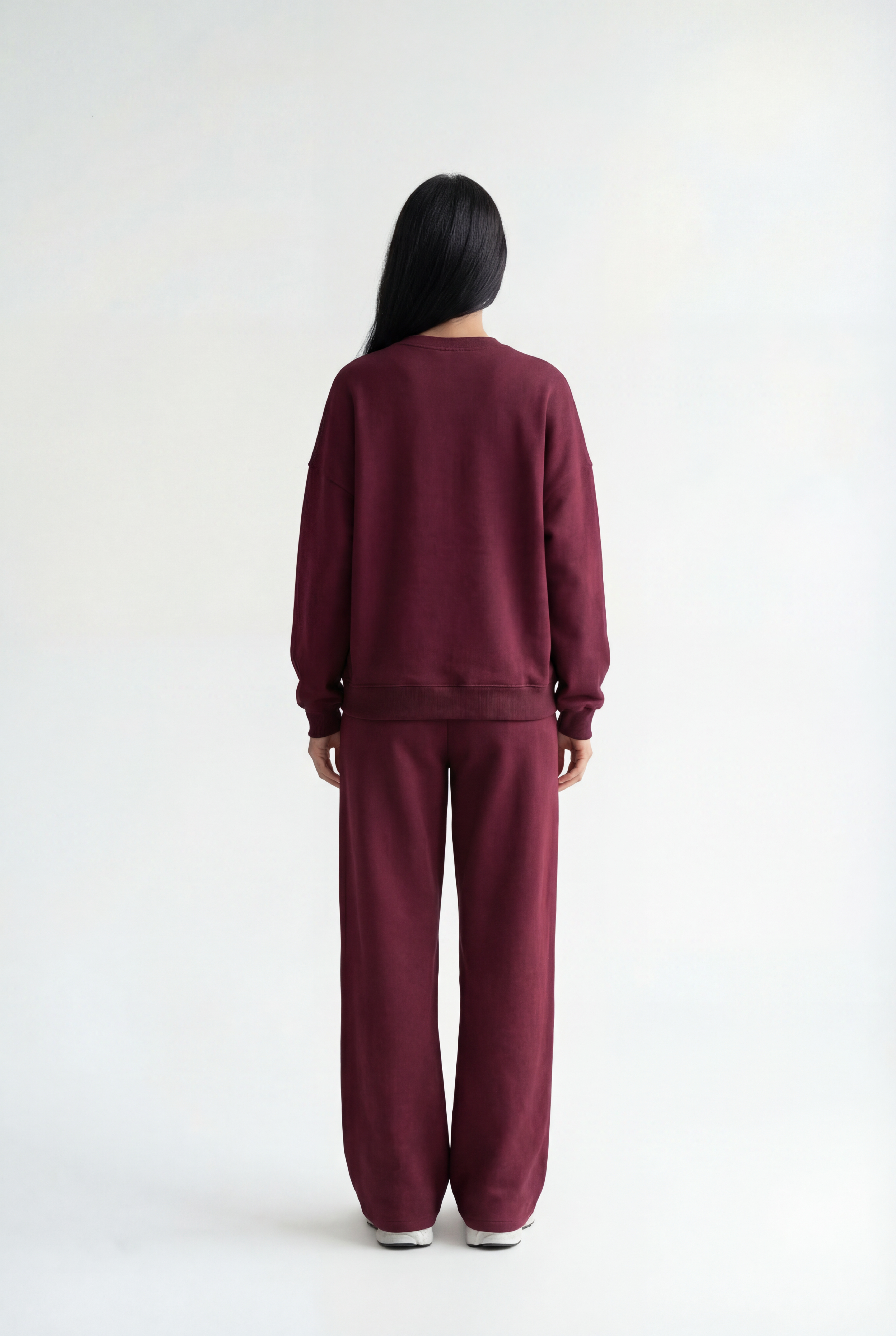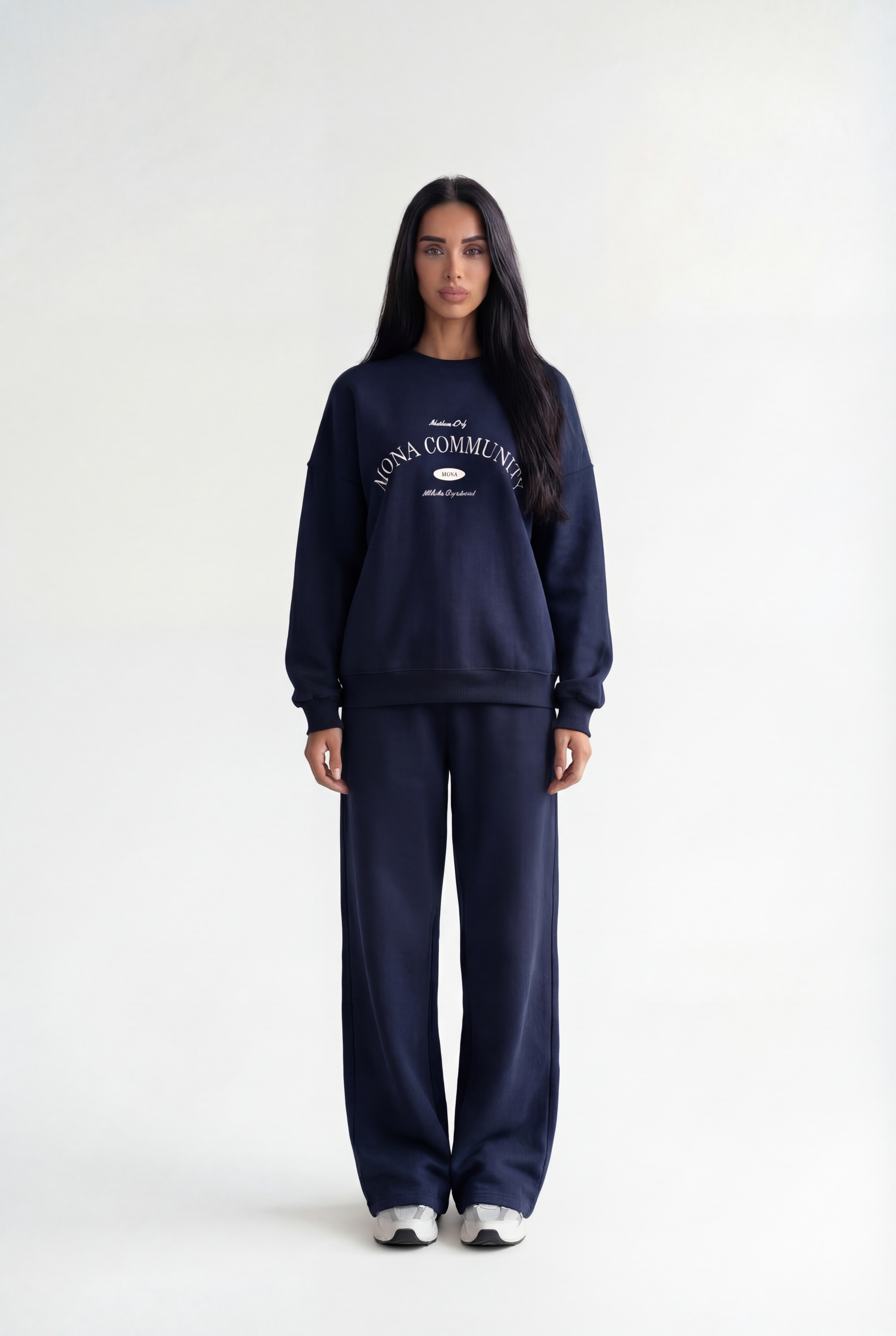 Stilingas komplektas, įkvėptas retro miesto mados: laisvas džemperio kirpimas su užrašu derinamas su tiesaus silueto ilgomis kelnėmis, kad suteiktų komfortą be kompromisų.