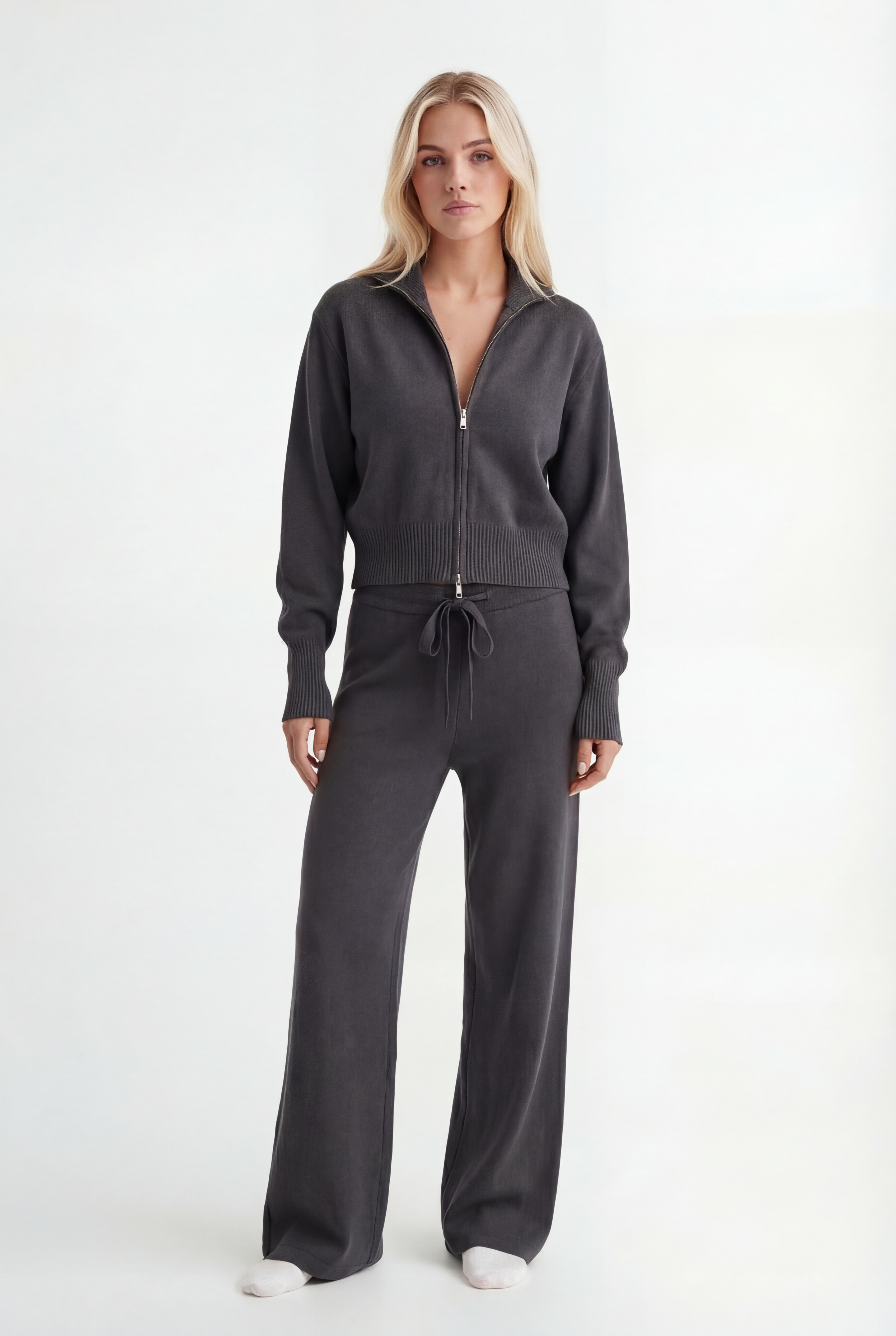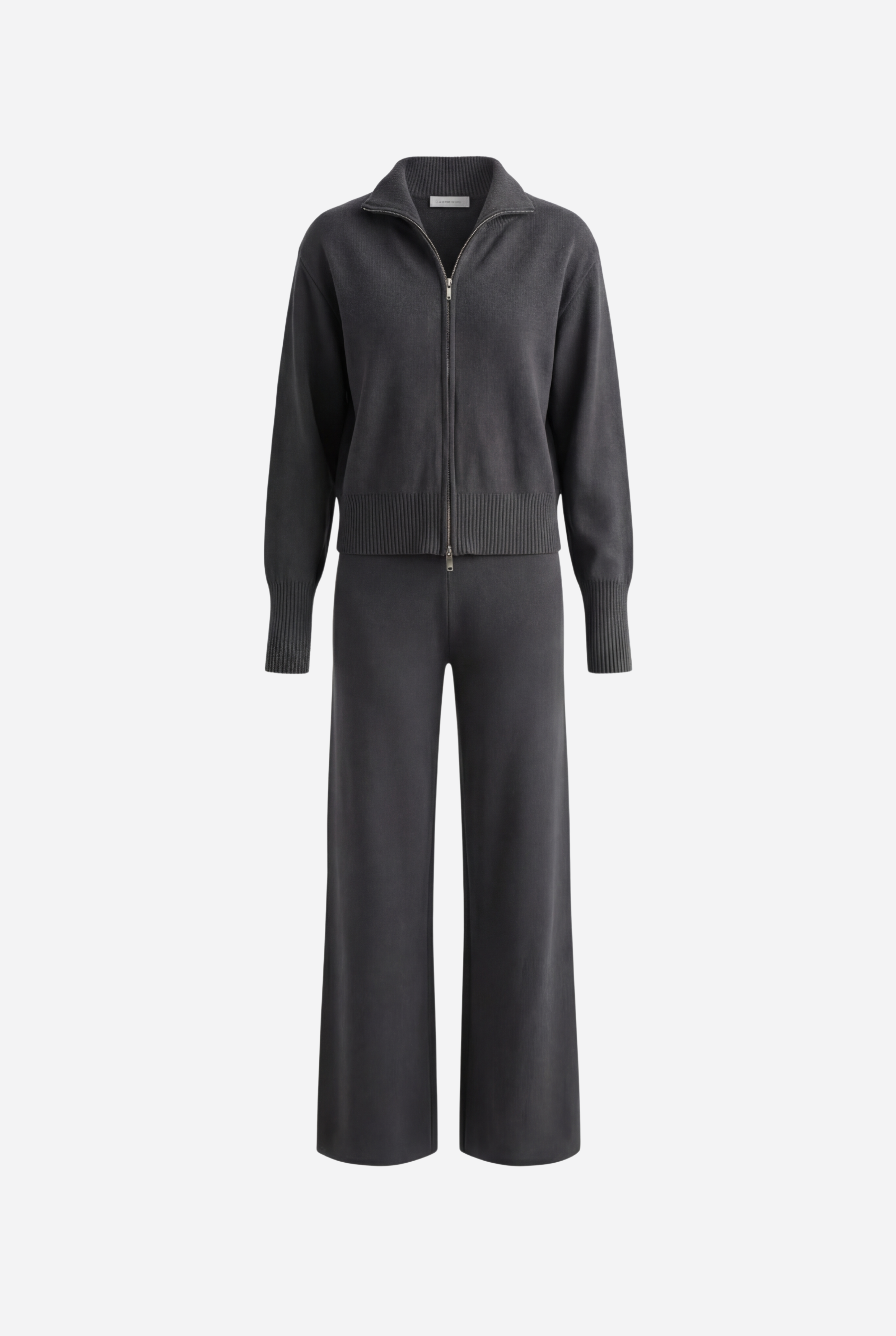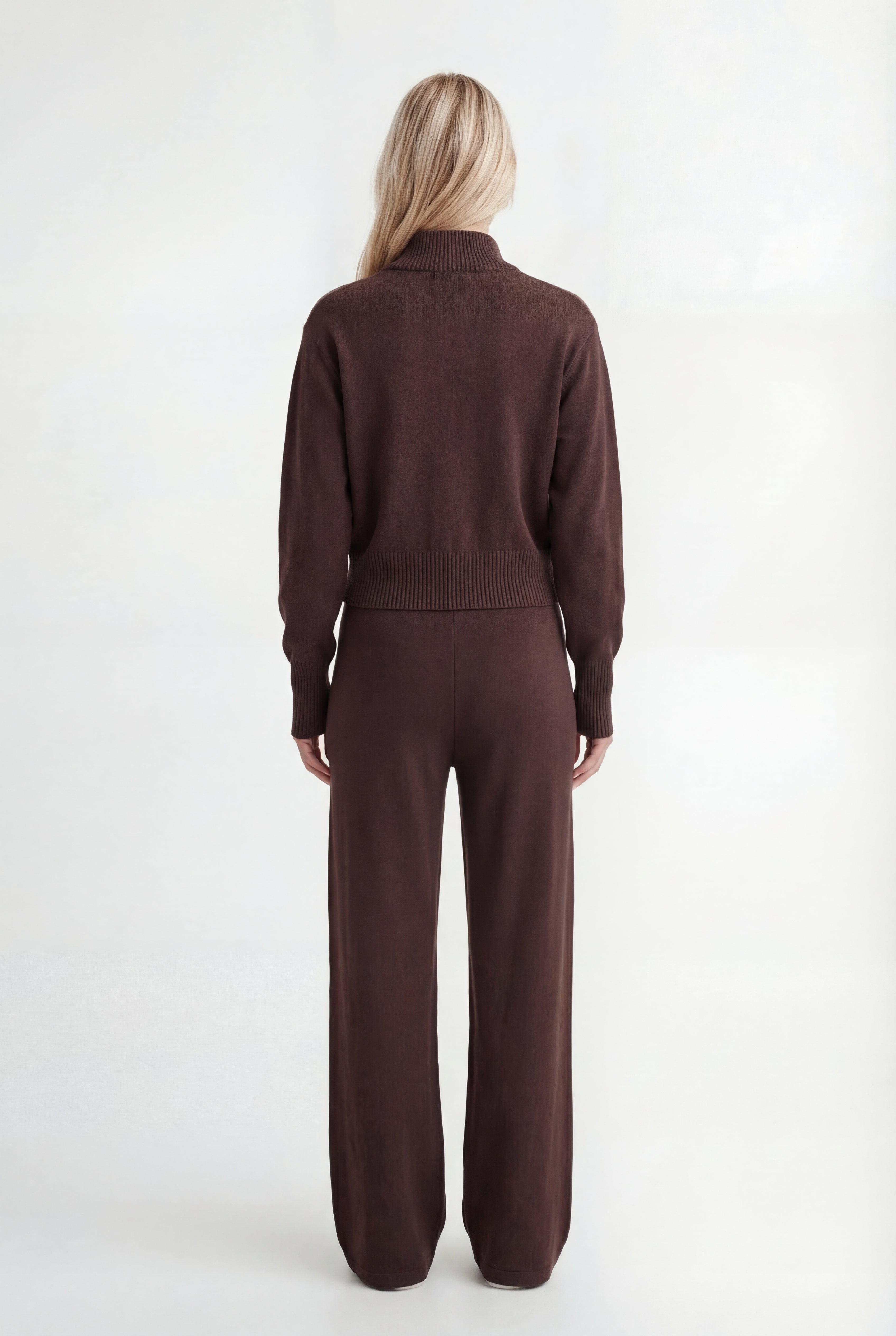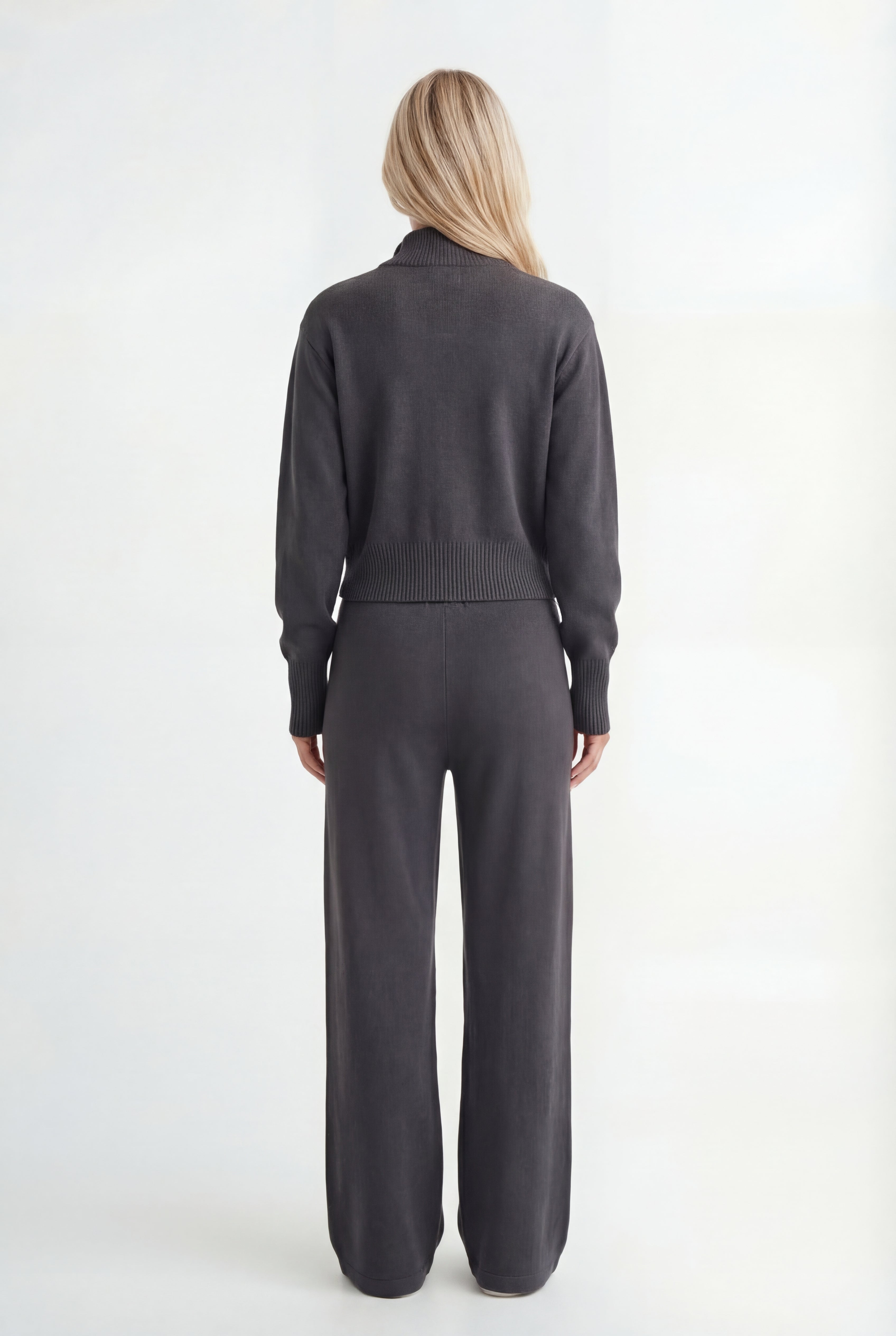 Išskirtinis atnaujinimas kasdienei aprangai. Pagamintas iš tekstūruoto mezgimo, rinkinys sudaro minimalistinę pusiau užtraukiamą megztinio dalį ir laisvus tiesius kelnes – suteikia šiuolaikinės komforto elegancijos.