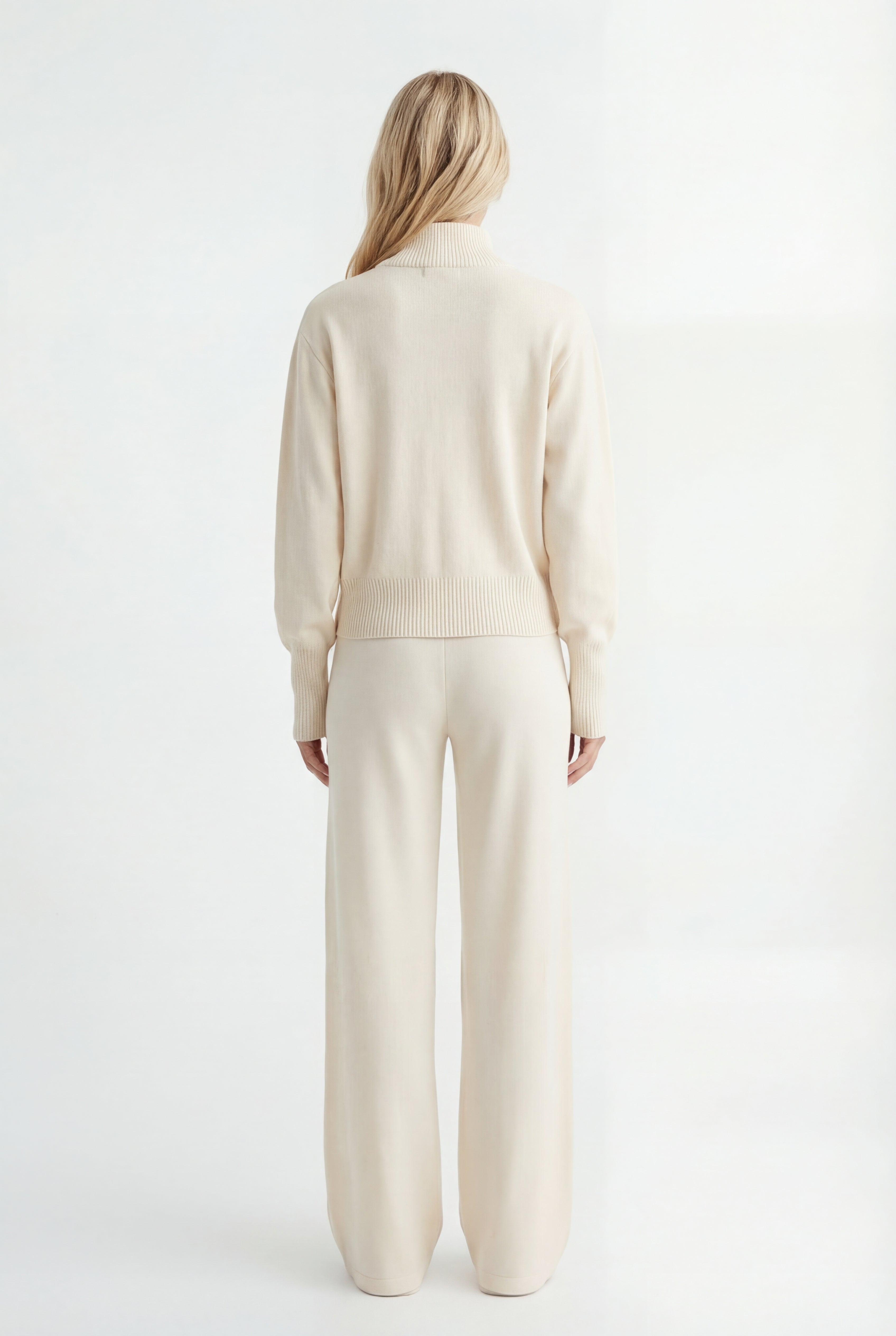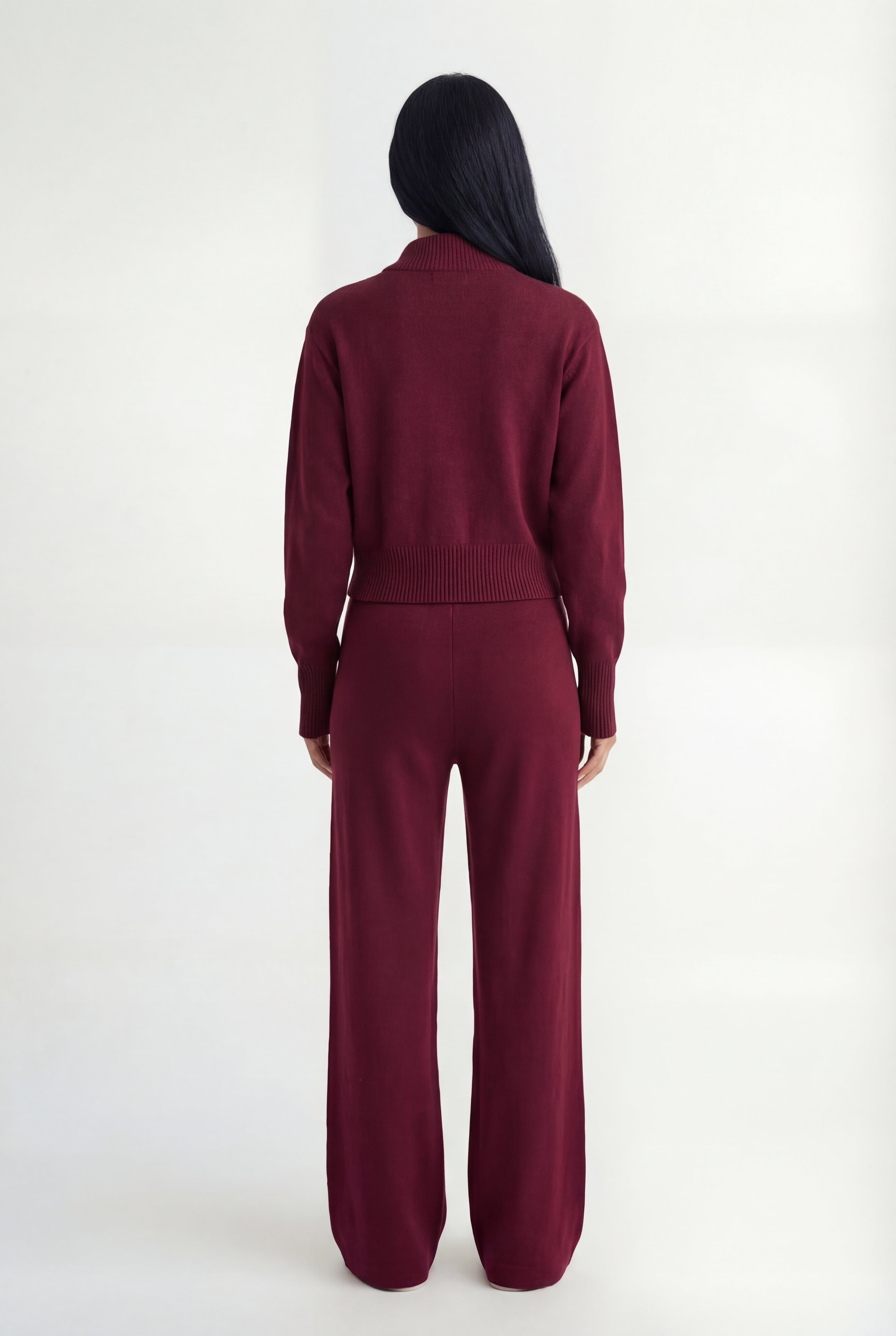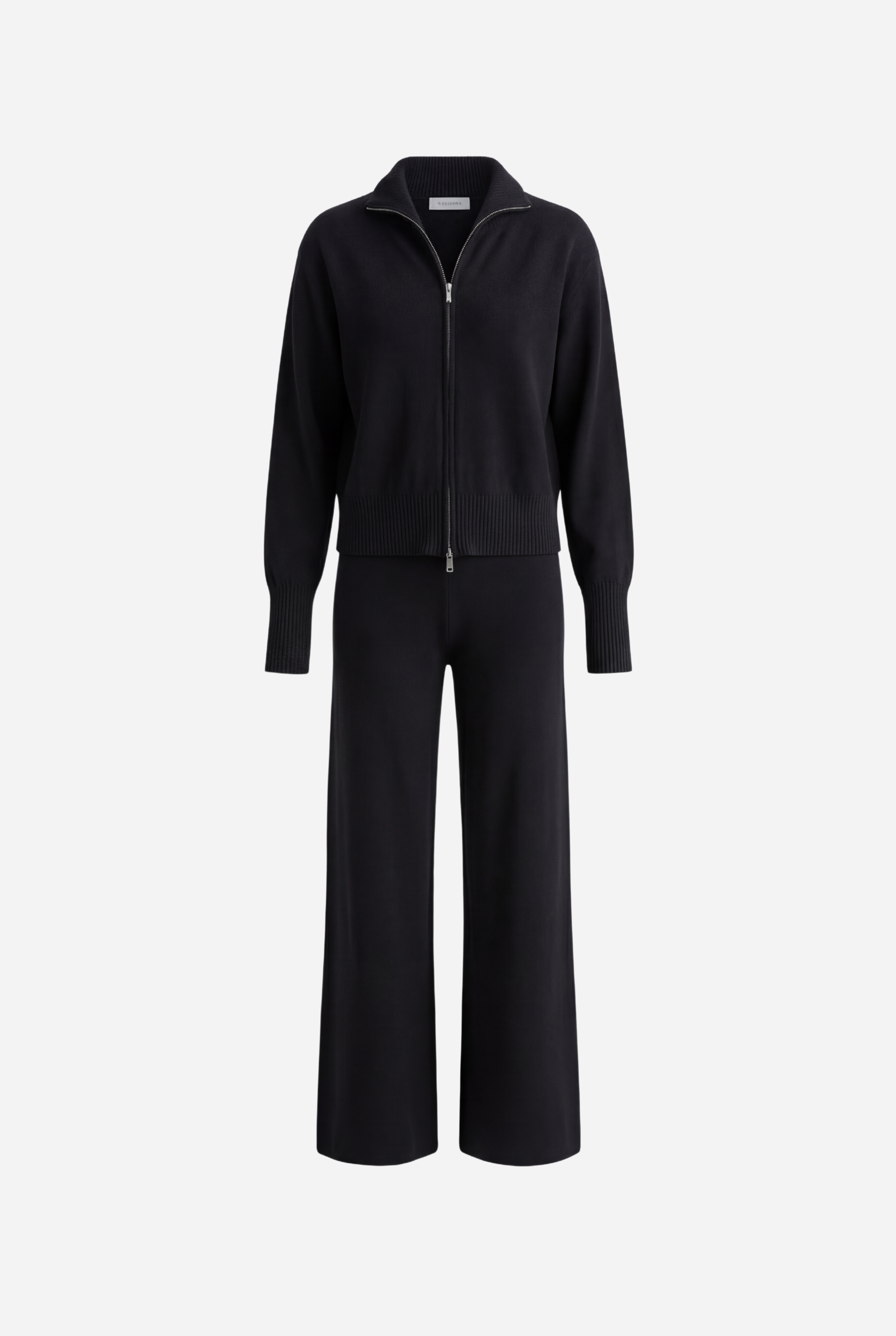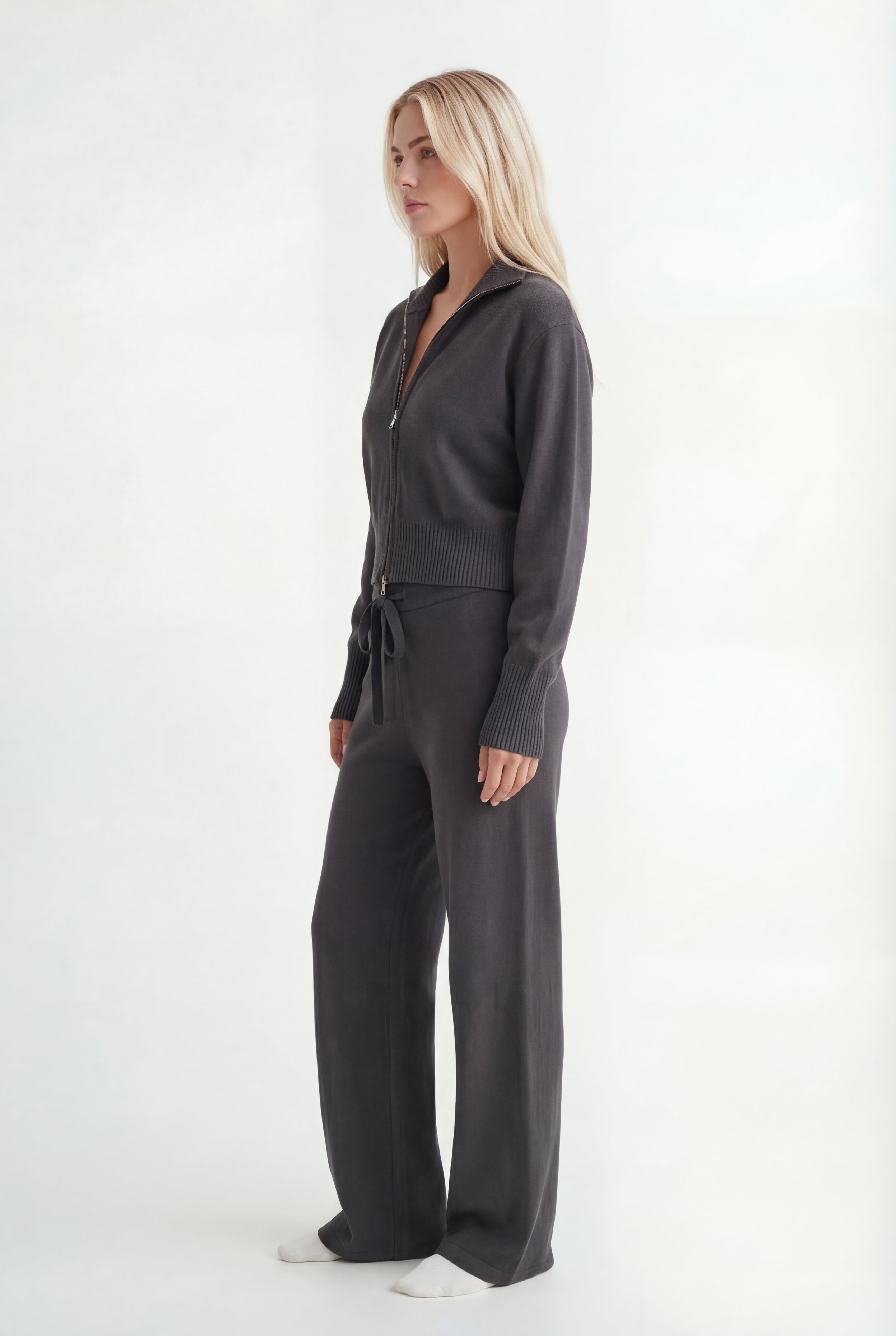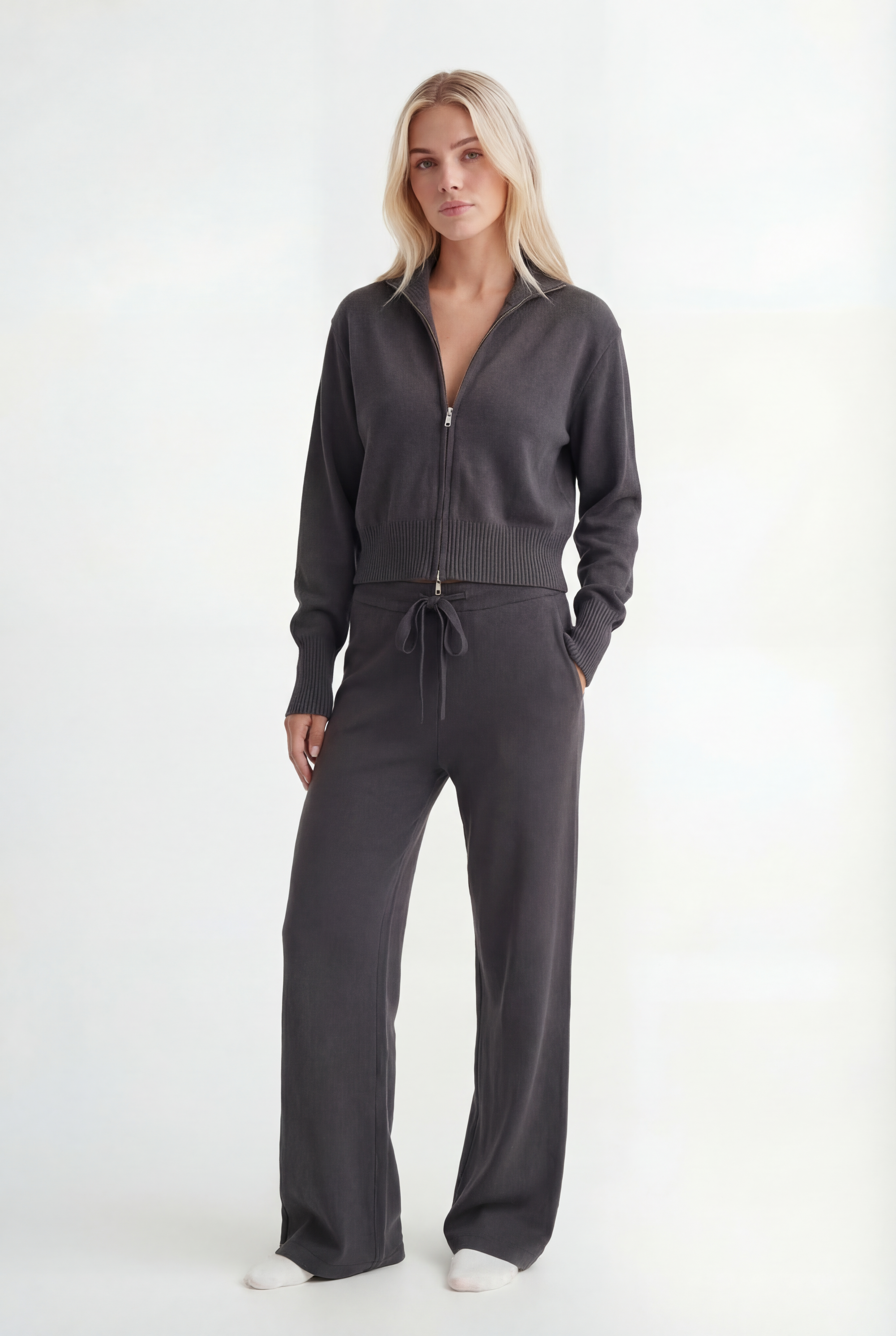 Išskirtinis atnaujinimas kasdienei aprangai. Pagamintas iš tekstūruoto mezgimo, rinkinys sudaro minimalistinę pusiau užtraukiamą megztinio dalį ir laisvus tiesius kelnes – suteikia šiuolaikinės komforto elegancijos.