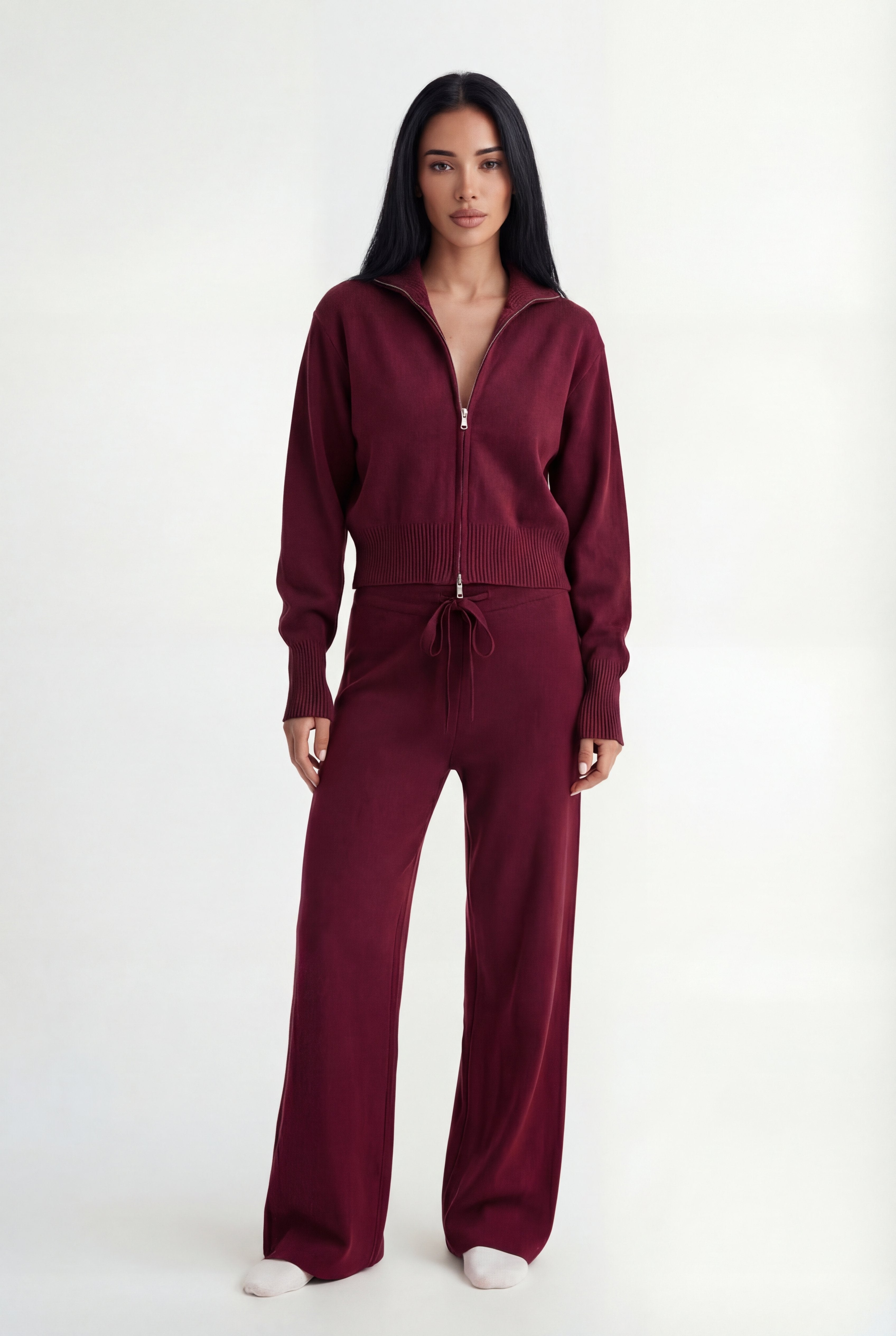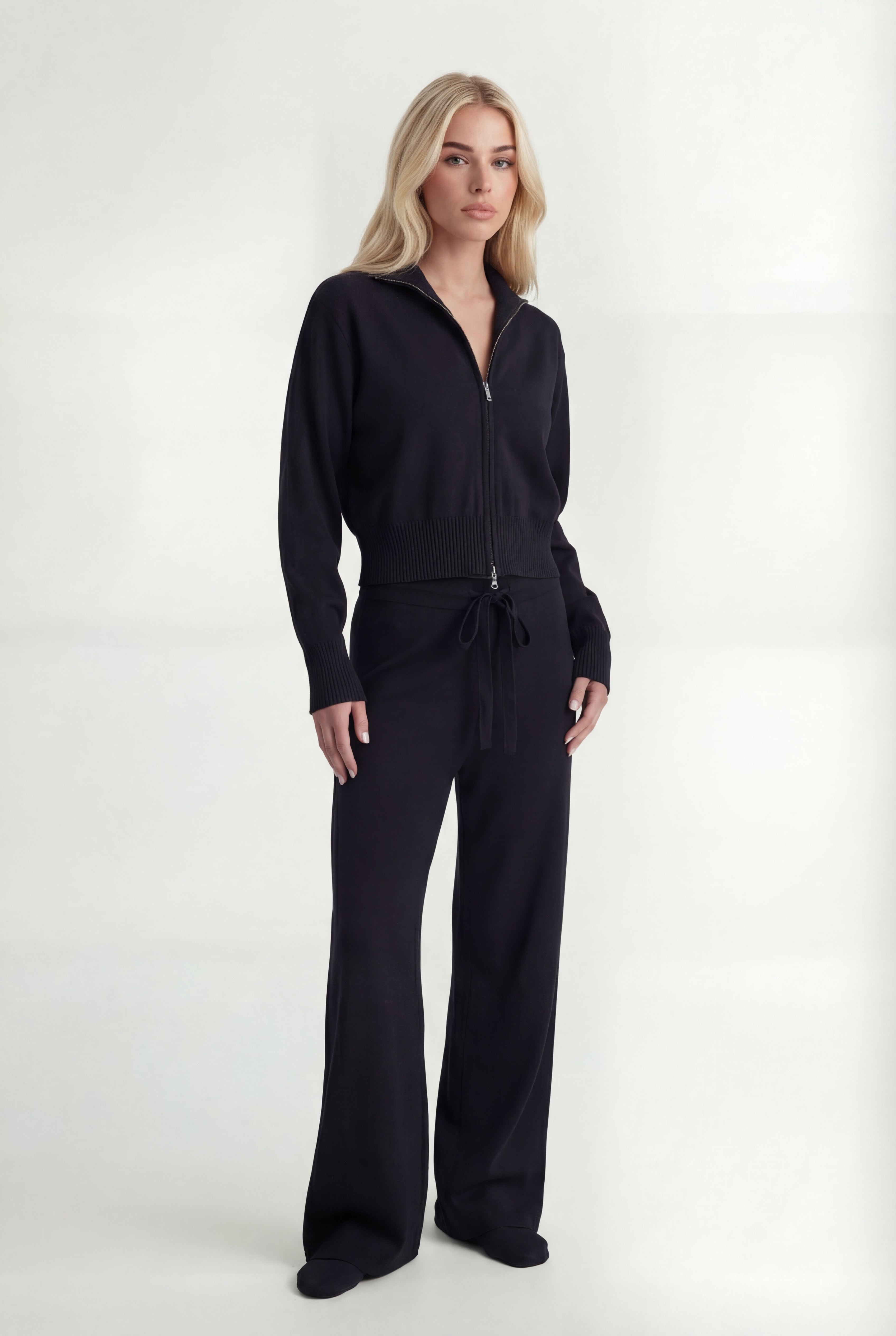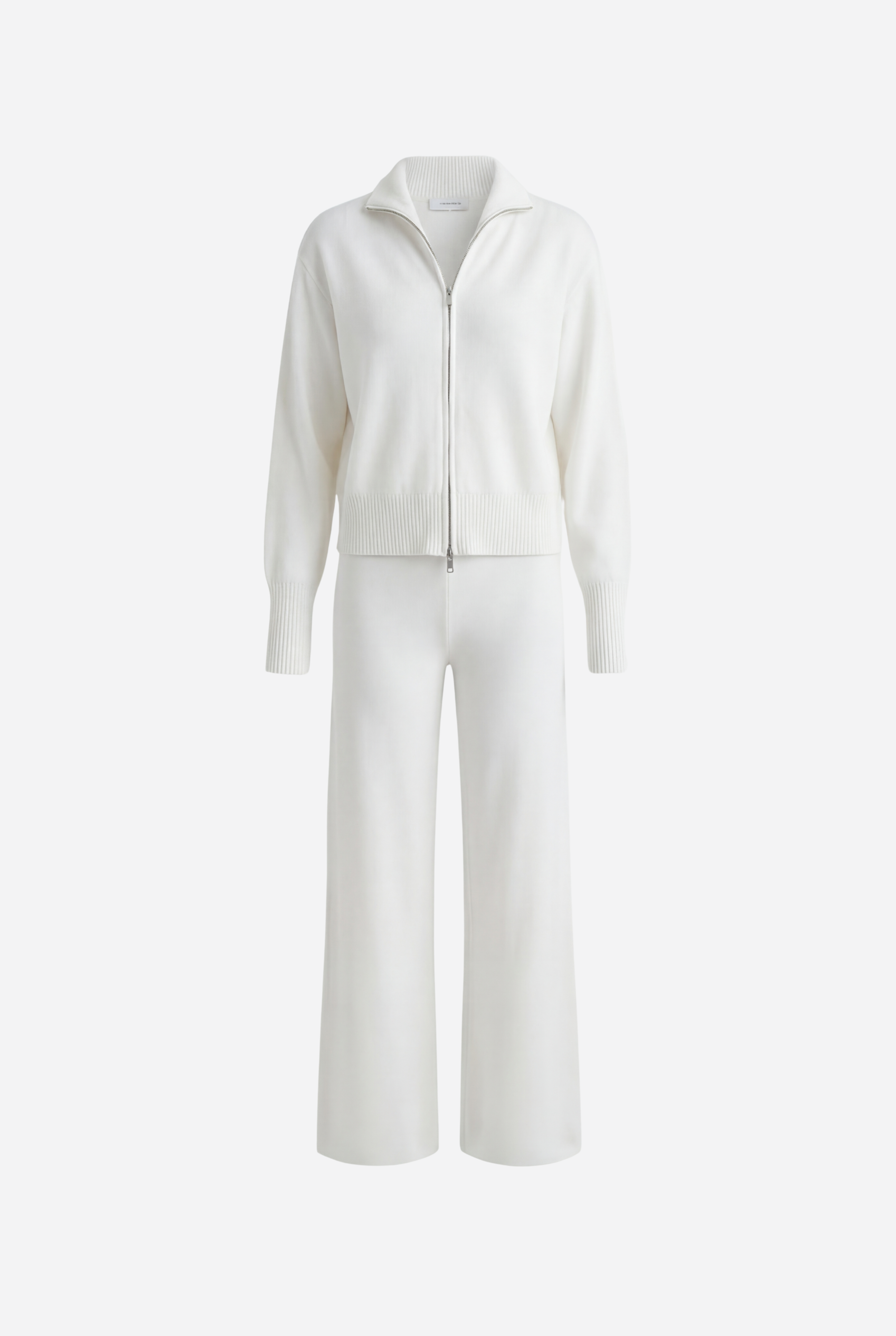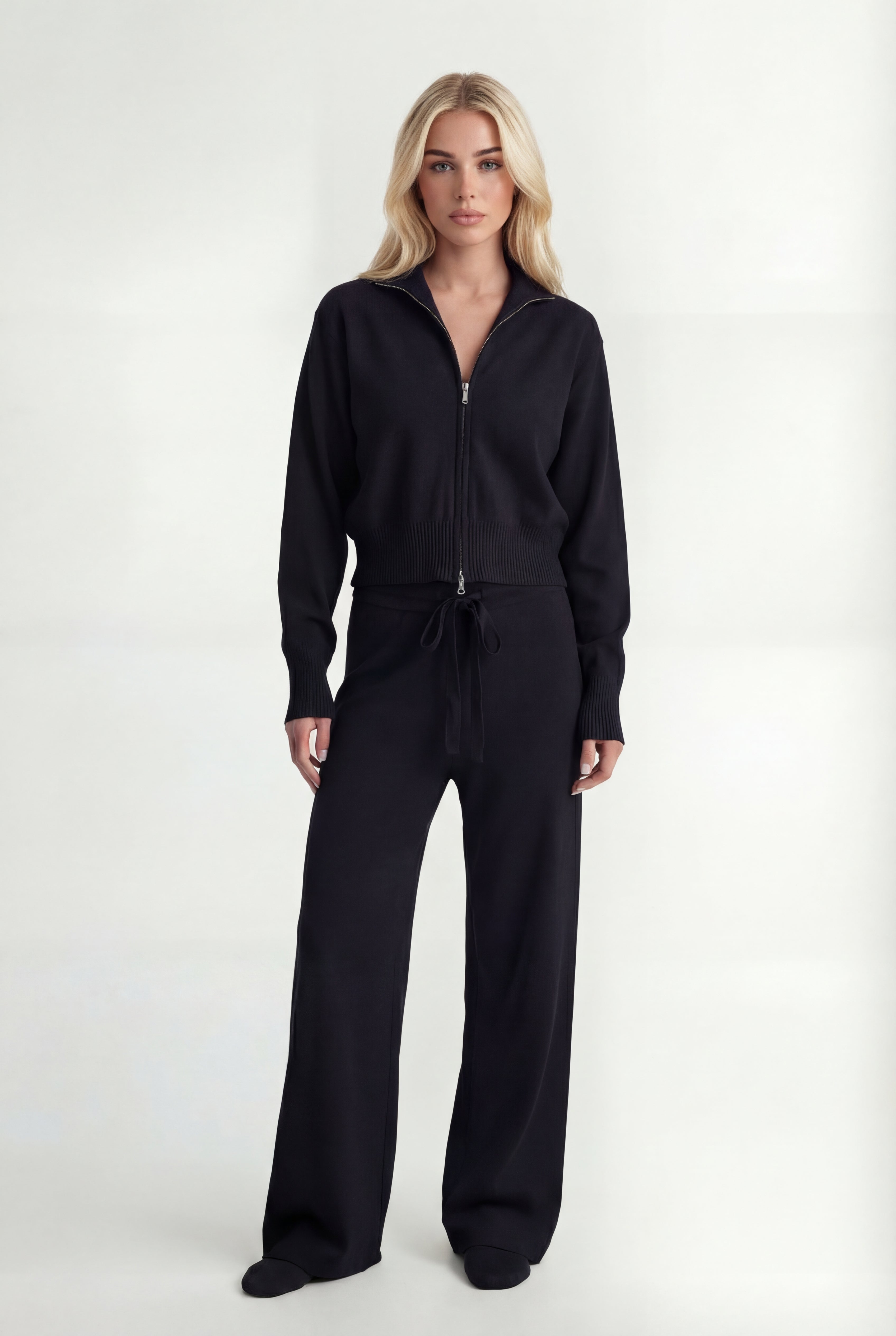 Išskirtinis atnaujinimas kasdienei aprangai. Pagamintas iš tekstūruoto mezgimo, rinkinys sudaro minimalistinę pusiau užtraukiamą megztinio dalį ir laisvus tiesius kelnes – suteikia šiuolaikinės komforto elegancijos.