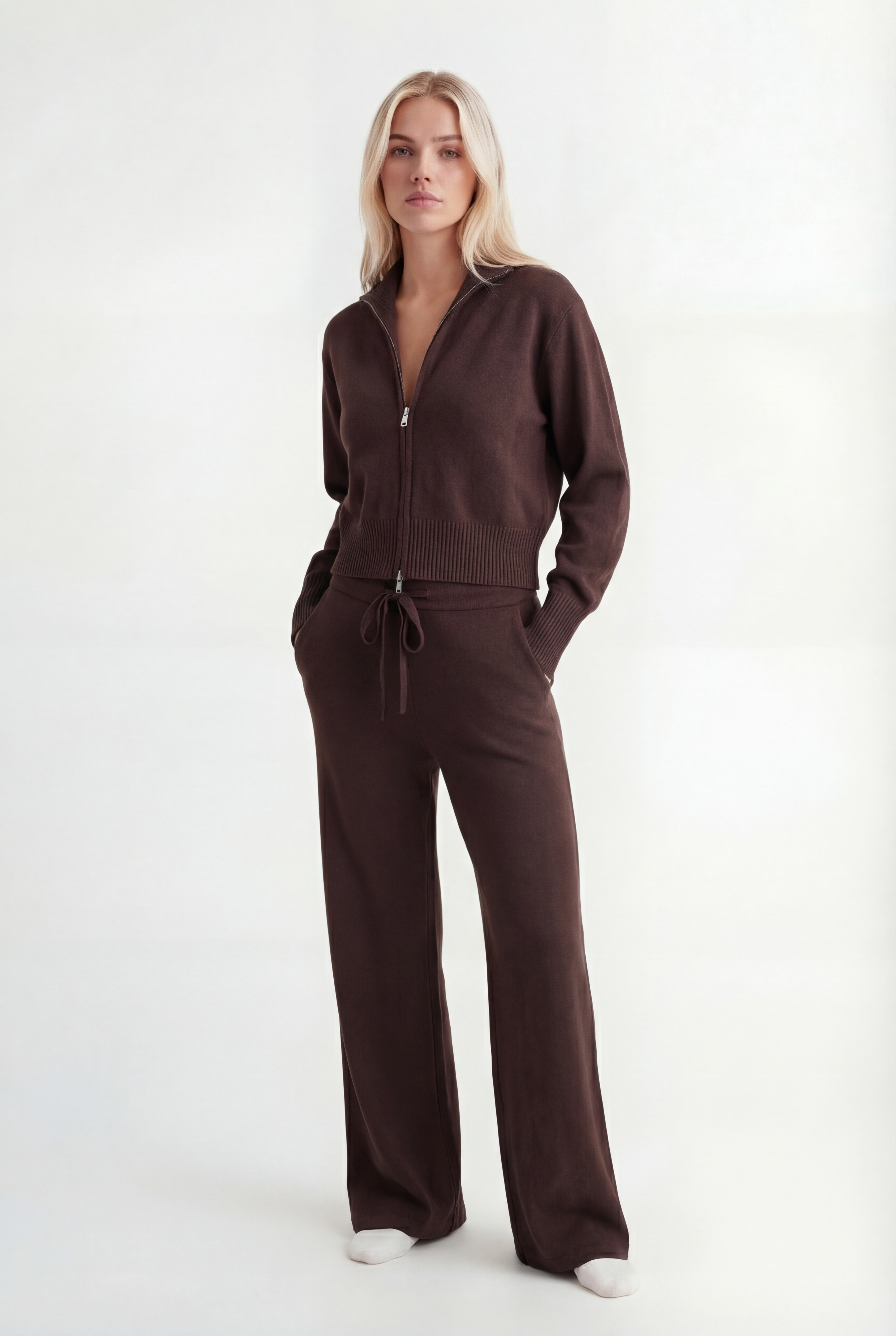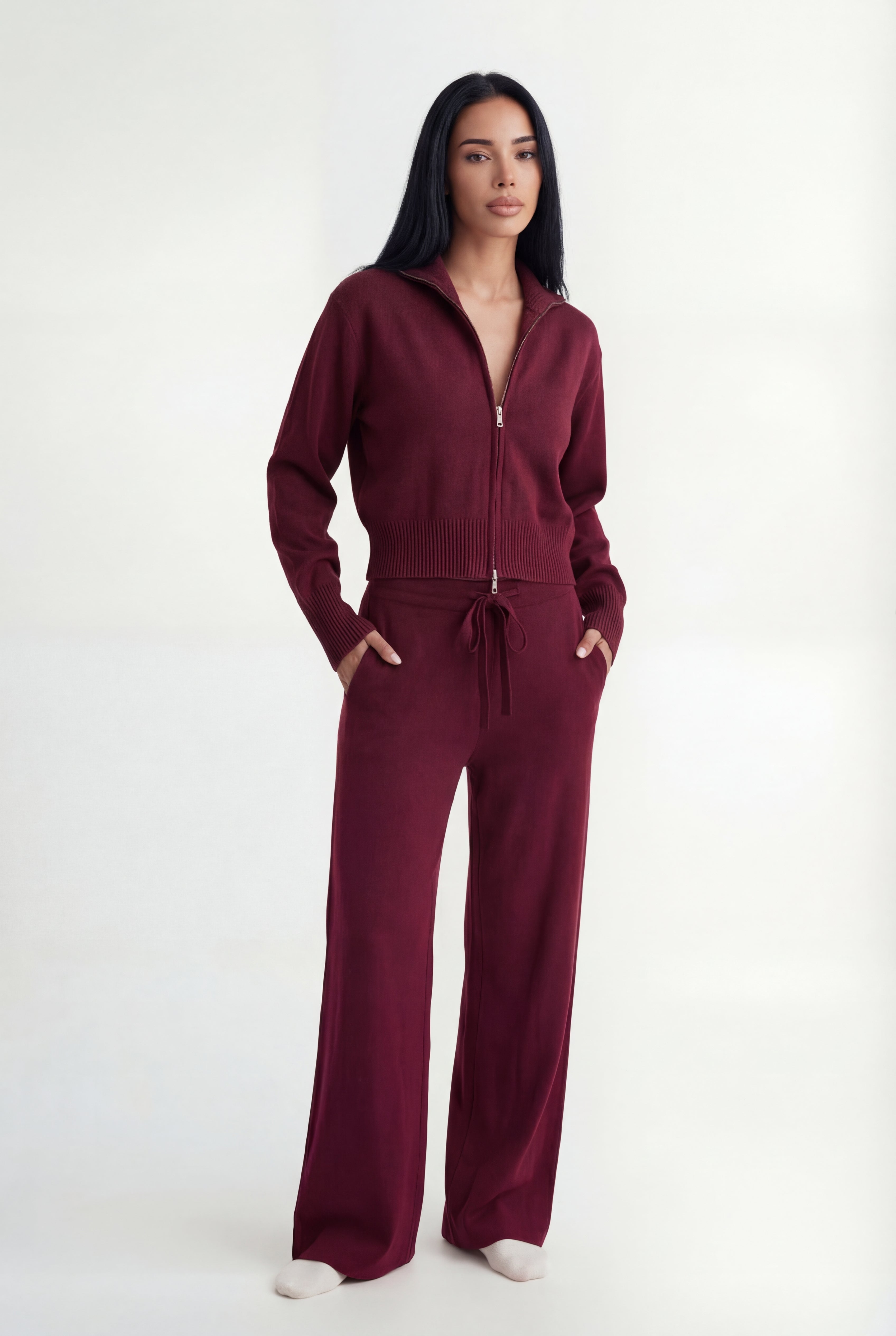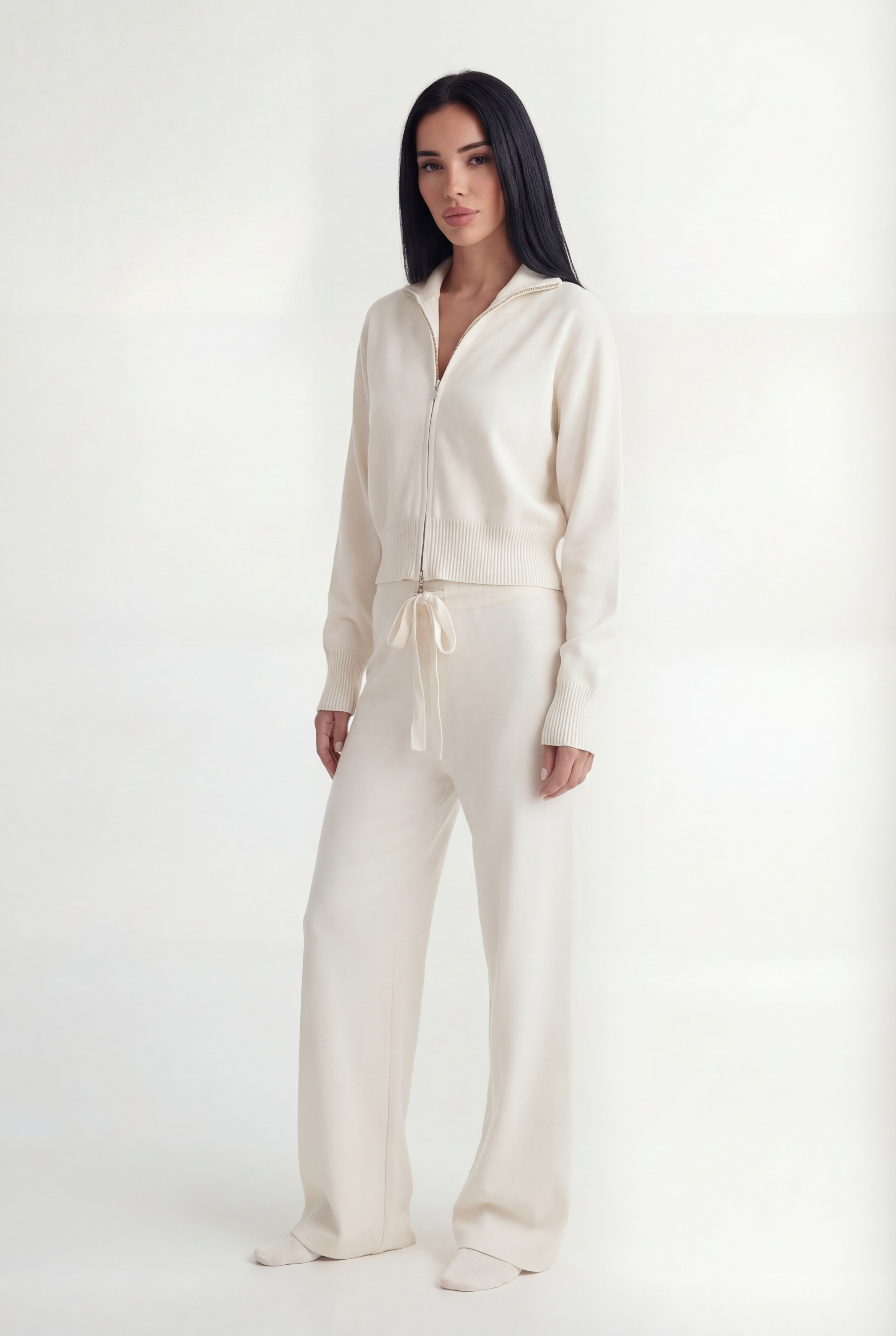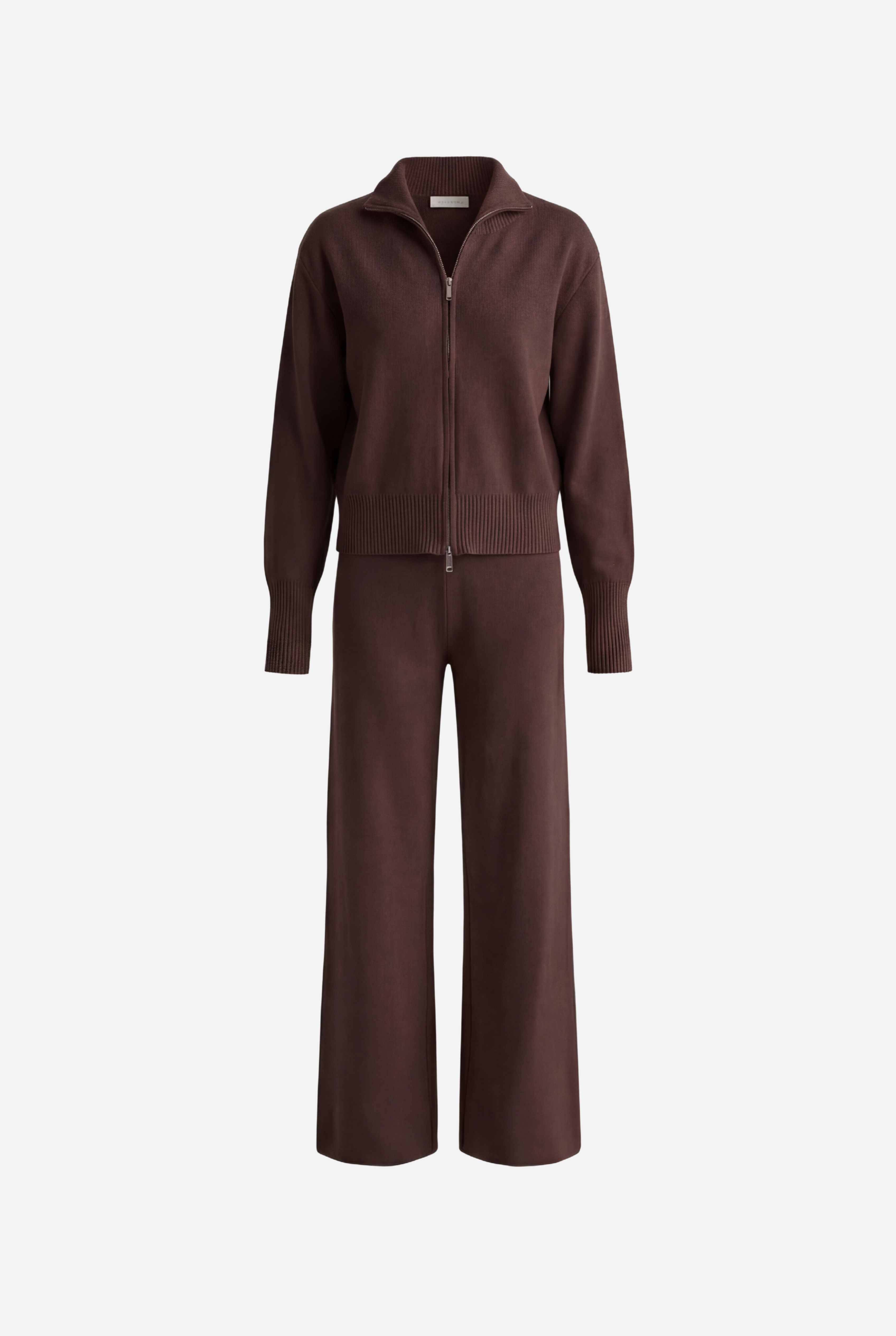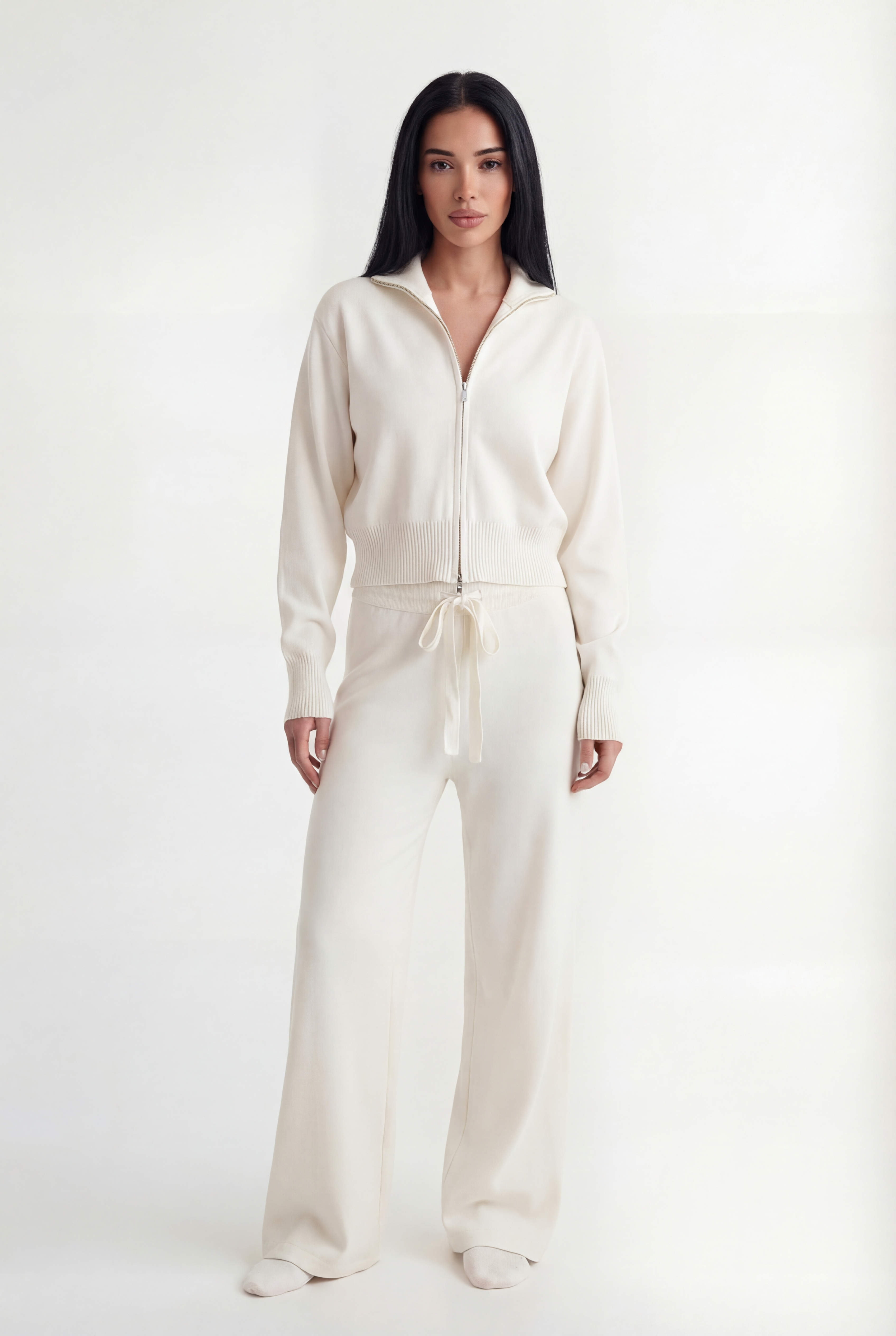 Išskirtinis atnaujinimas kasdienei aprangai. Pagamintas iš tekstūruoto mezgimo, rinkinys sudaro minimalistinę pusiau užtraukiamą megztinio dalį ir laisvus tiesius kelnes – suteikia šiuolaikinės komforto elegancijos.