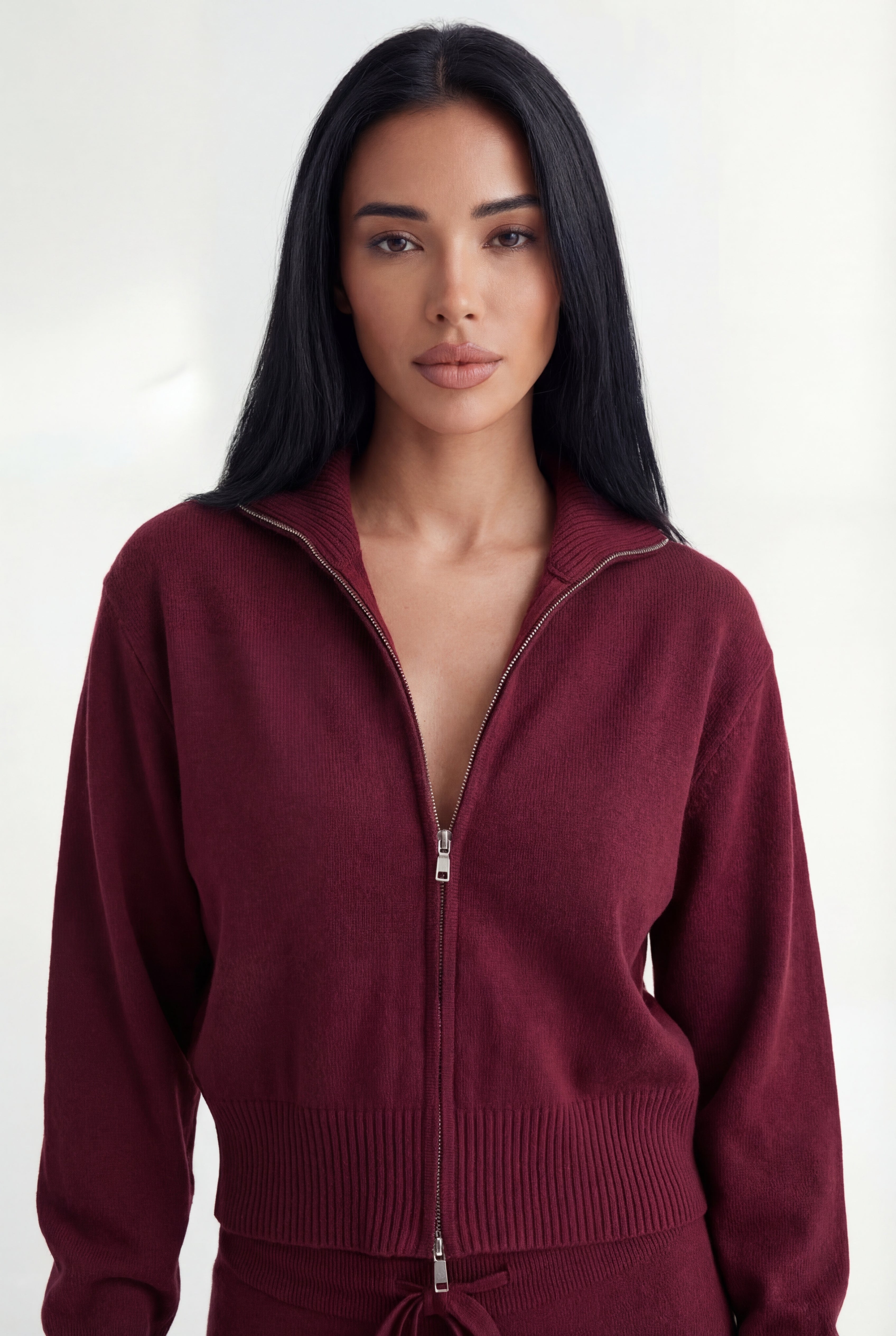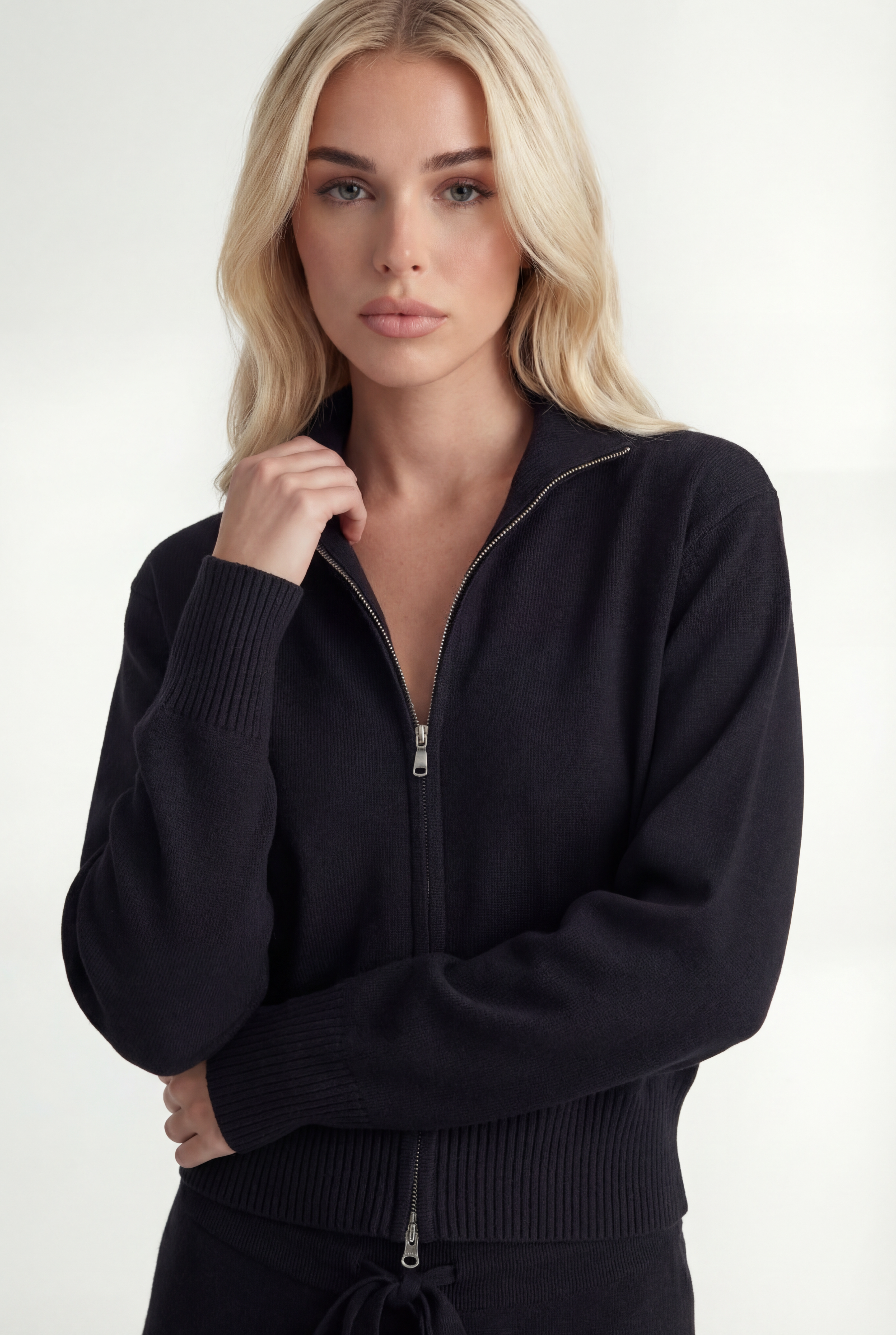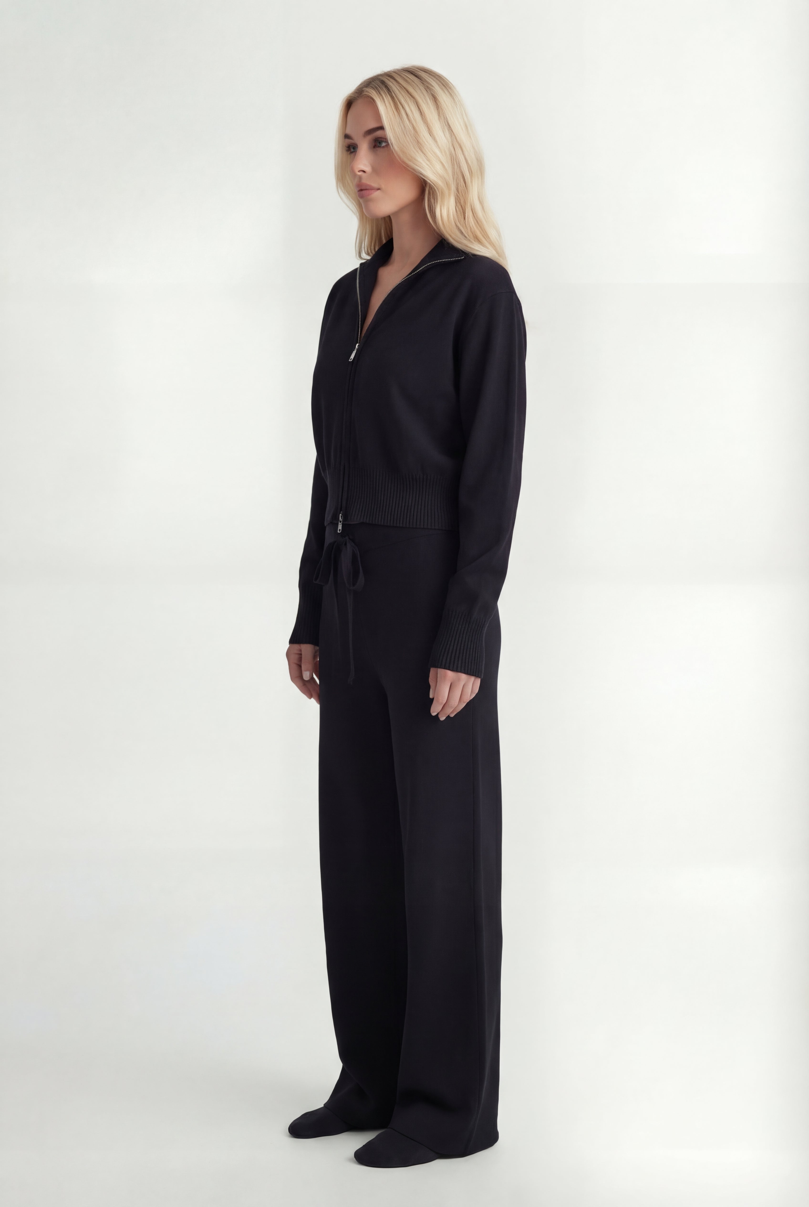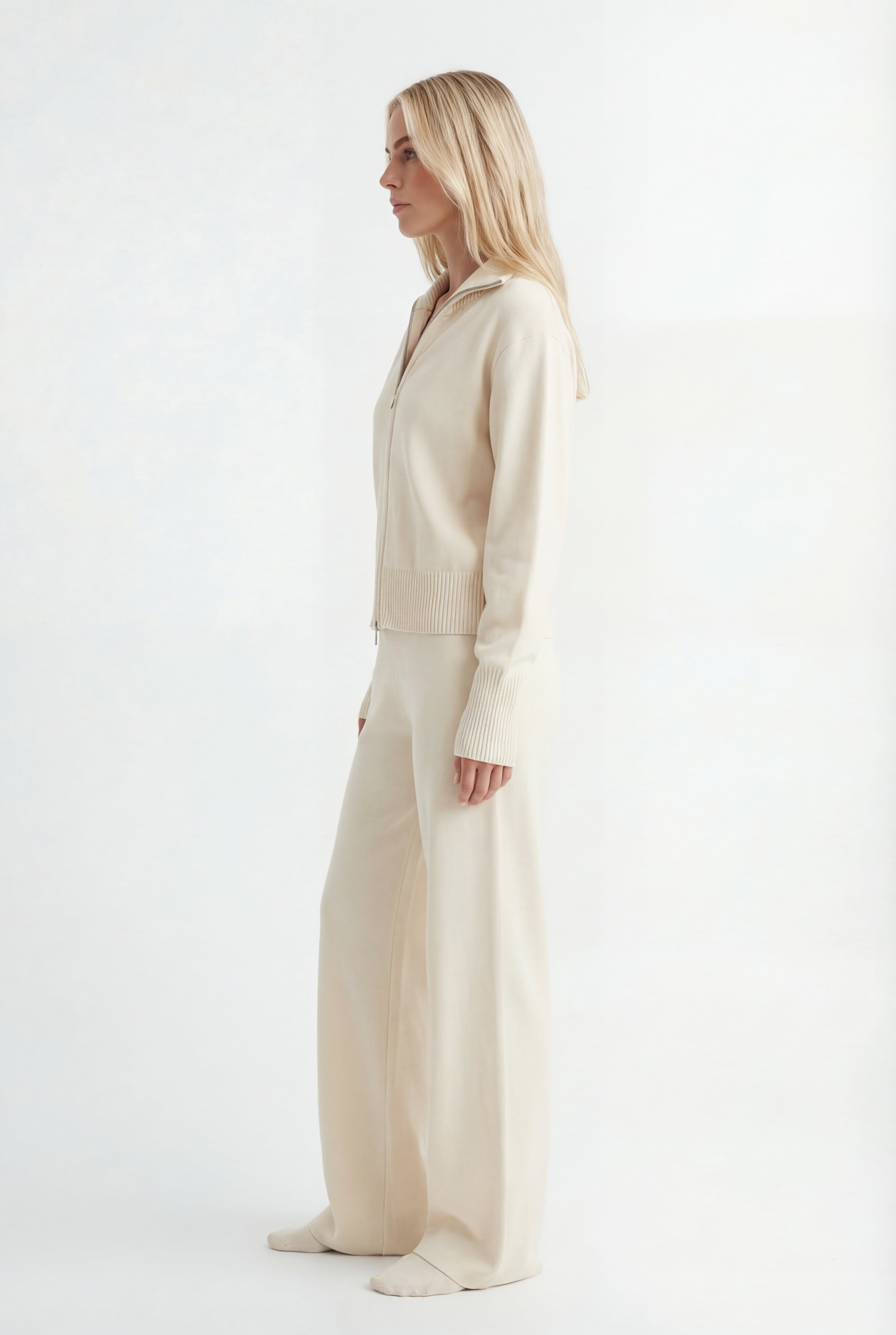 Išskirtinis atnaujinimas kasdienei aprangai. Pagamintas iš tekstūruoto mezgimo, rinkinys sudaro minimalistinę pusiau užtraukiamą megztinio dalį ir laisvus tiesius kelnes – suteikia šiuolaikinės komforto elegancijos.