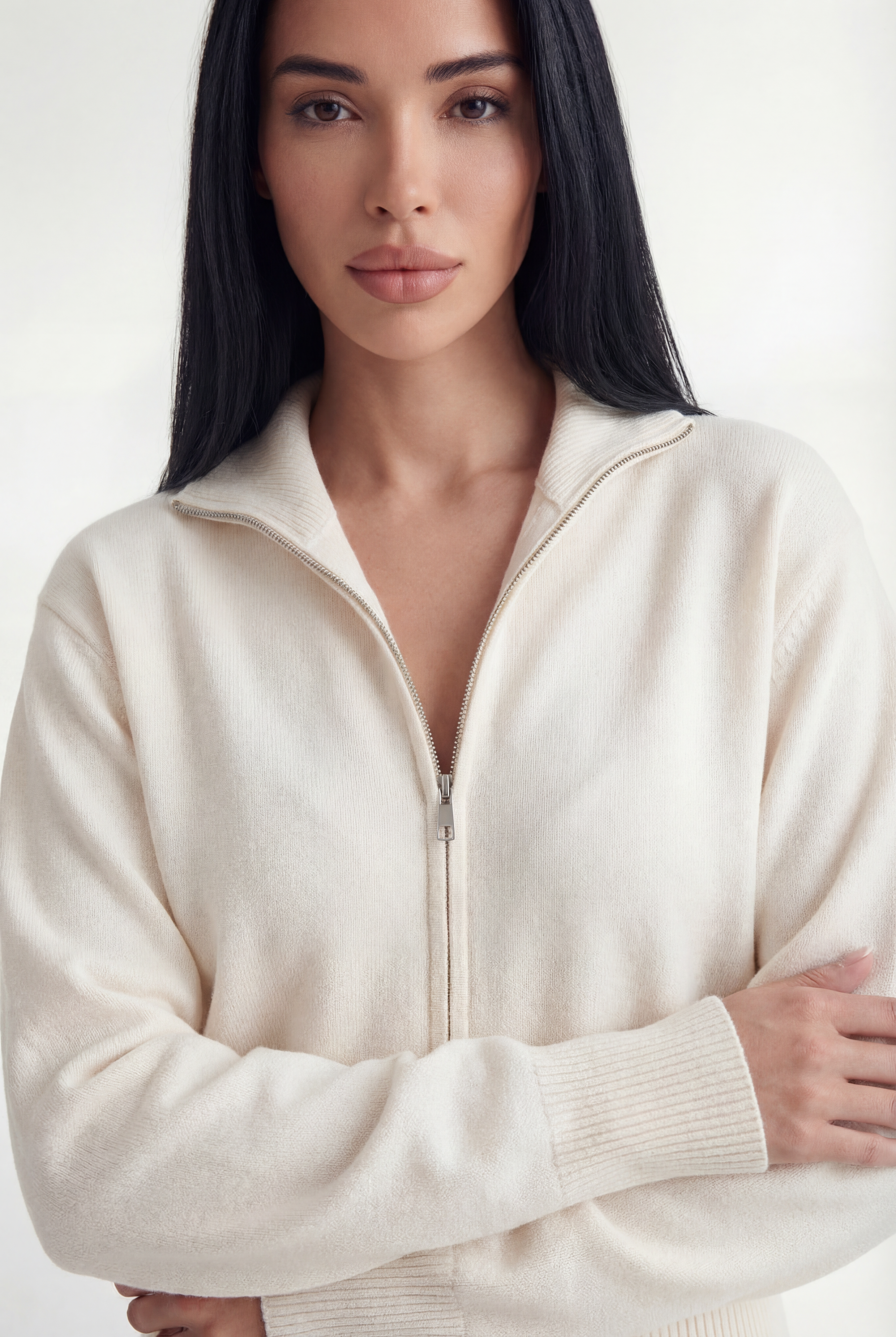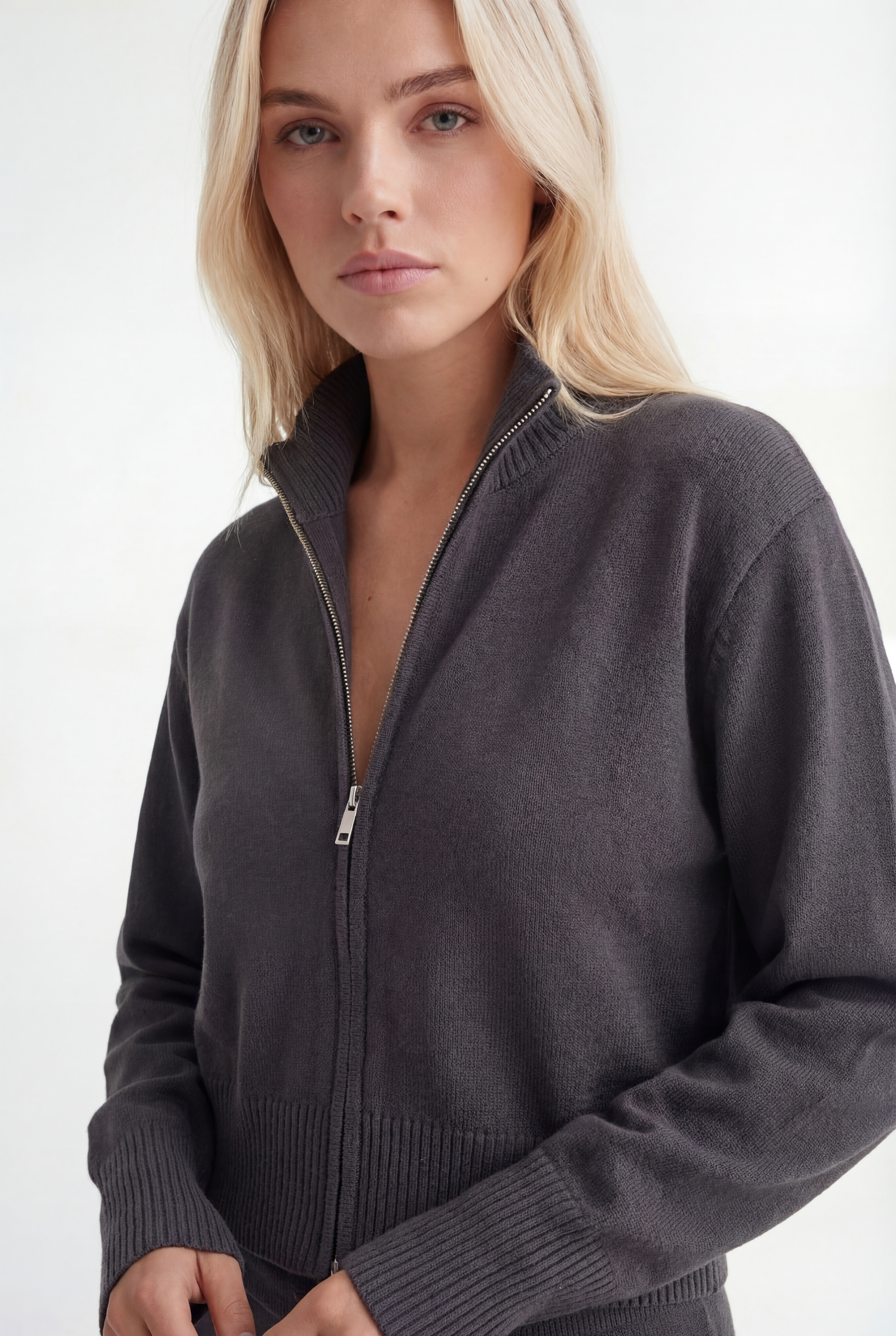 - Modernus pusiau užtraukiamas megztinio kirpimas
