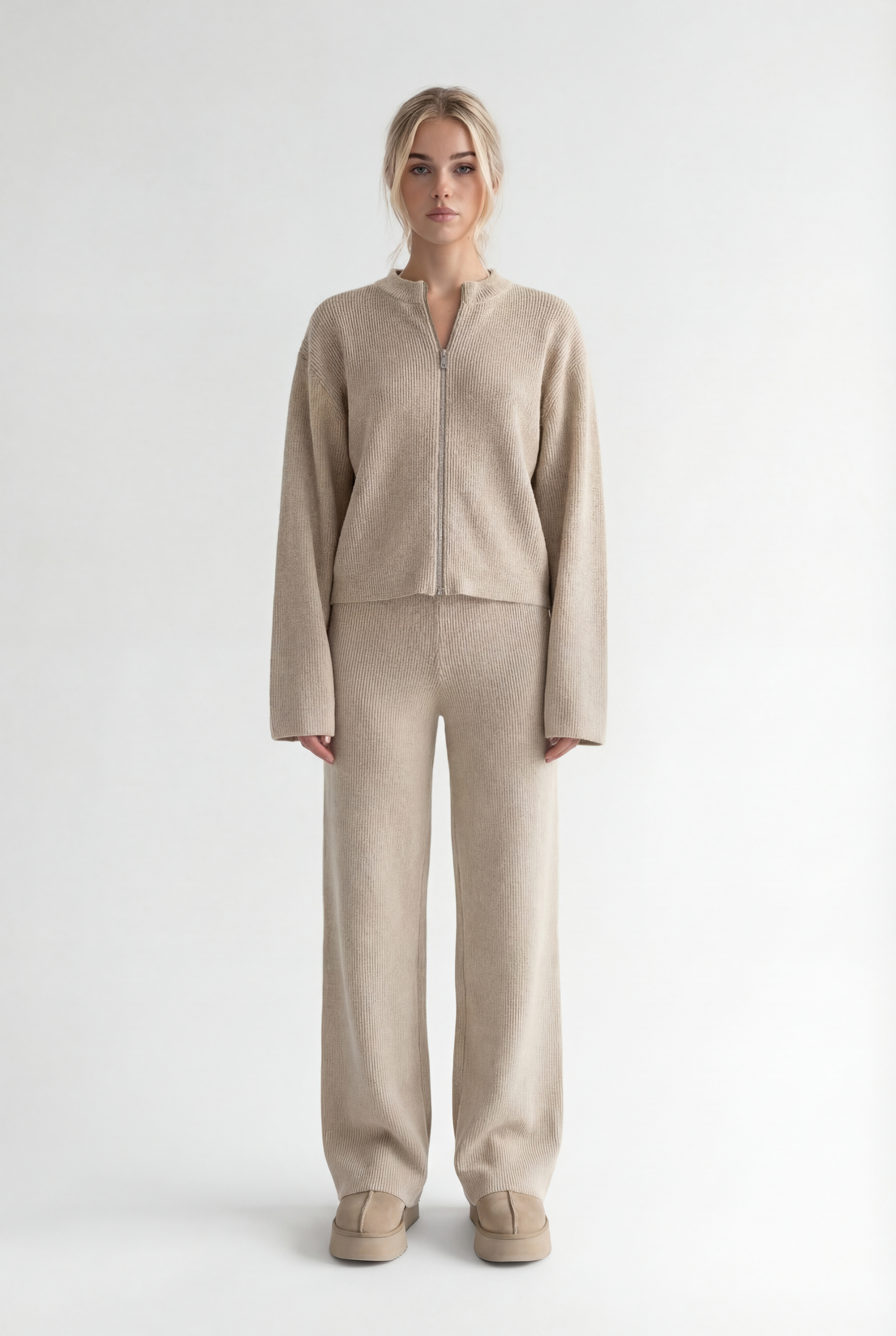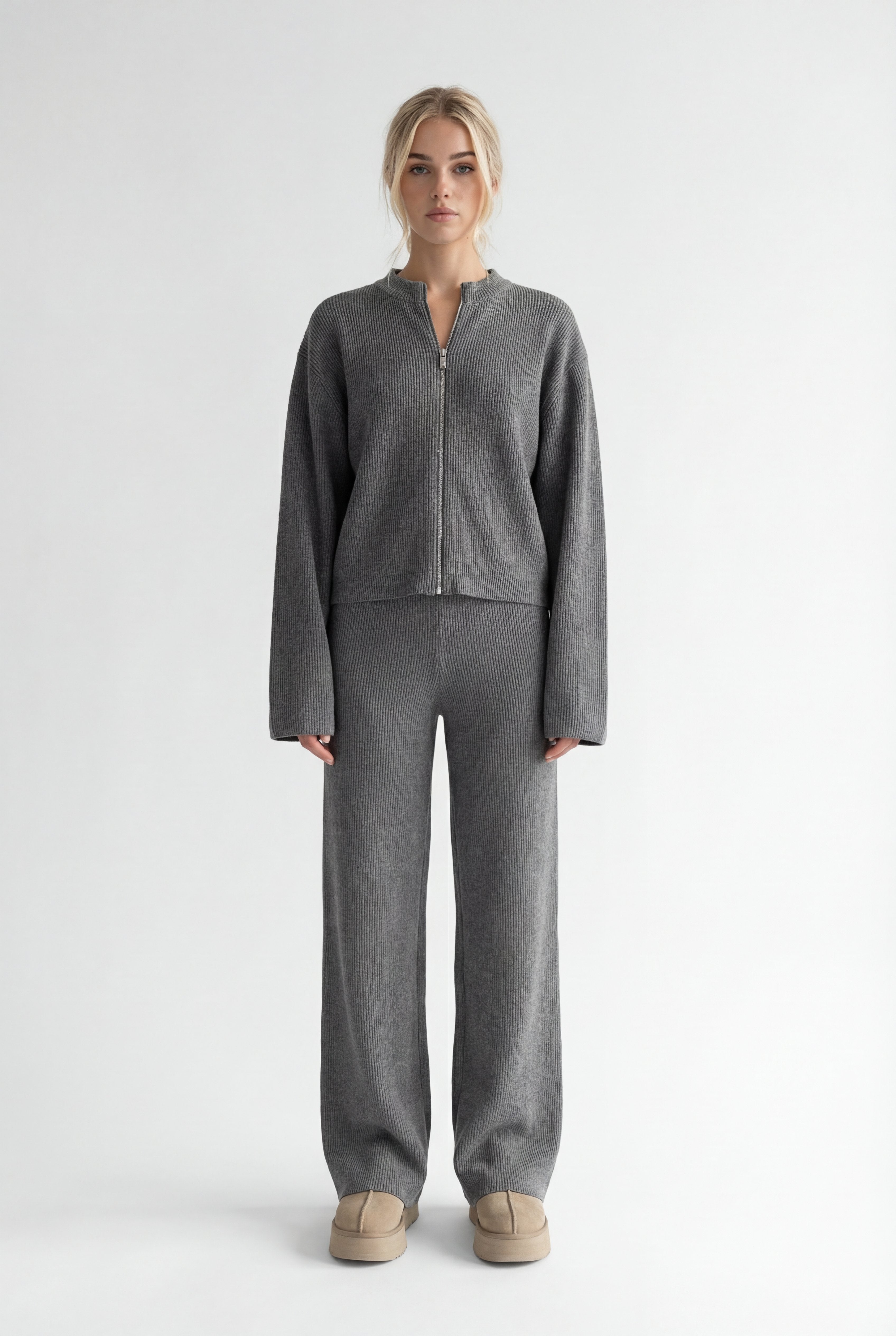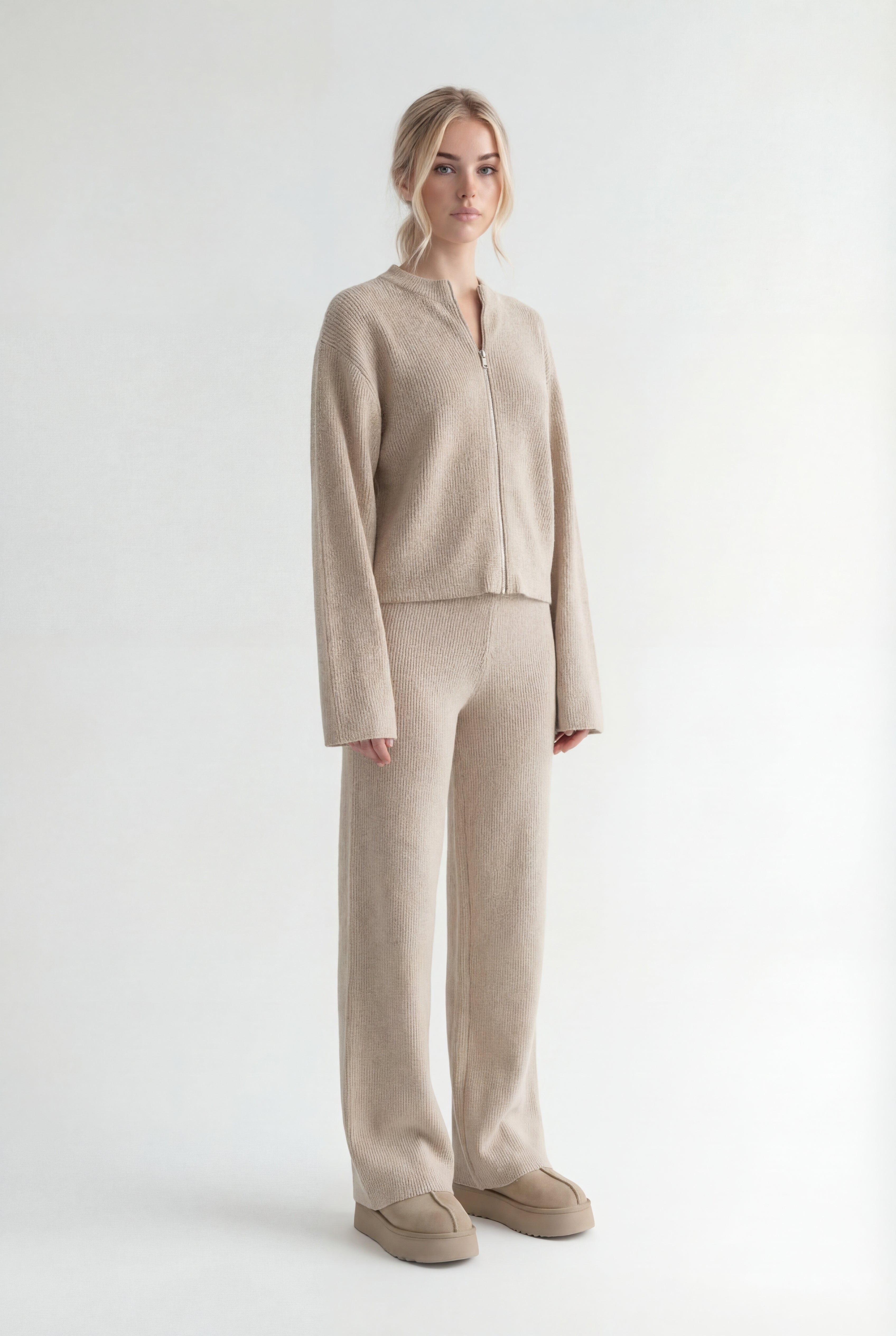 Atraskite stilių ir komfortą viename su megztu kostiumėliu „Aurélie“. Šis dviejų dalių komplektas – minimalistinis užtrauktuku segamas megztinis ir platėjančios kelnės – sukurtas moderniai moteriai, kuri vertina eleganciją bei laisvę judėti.