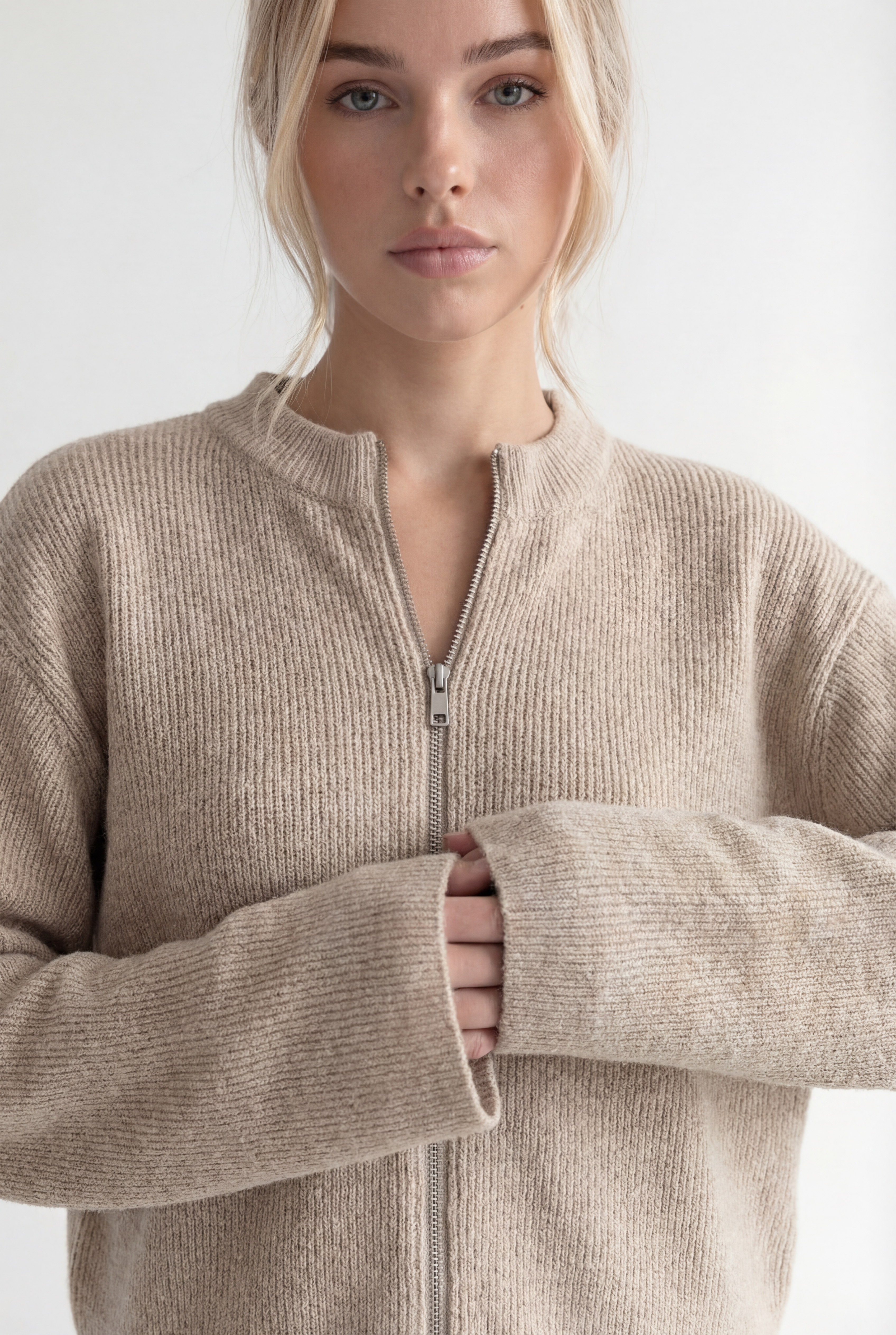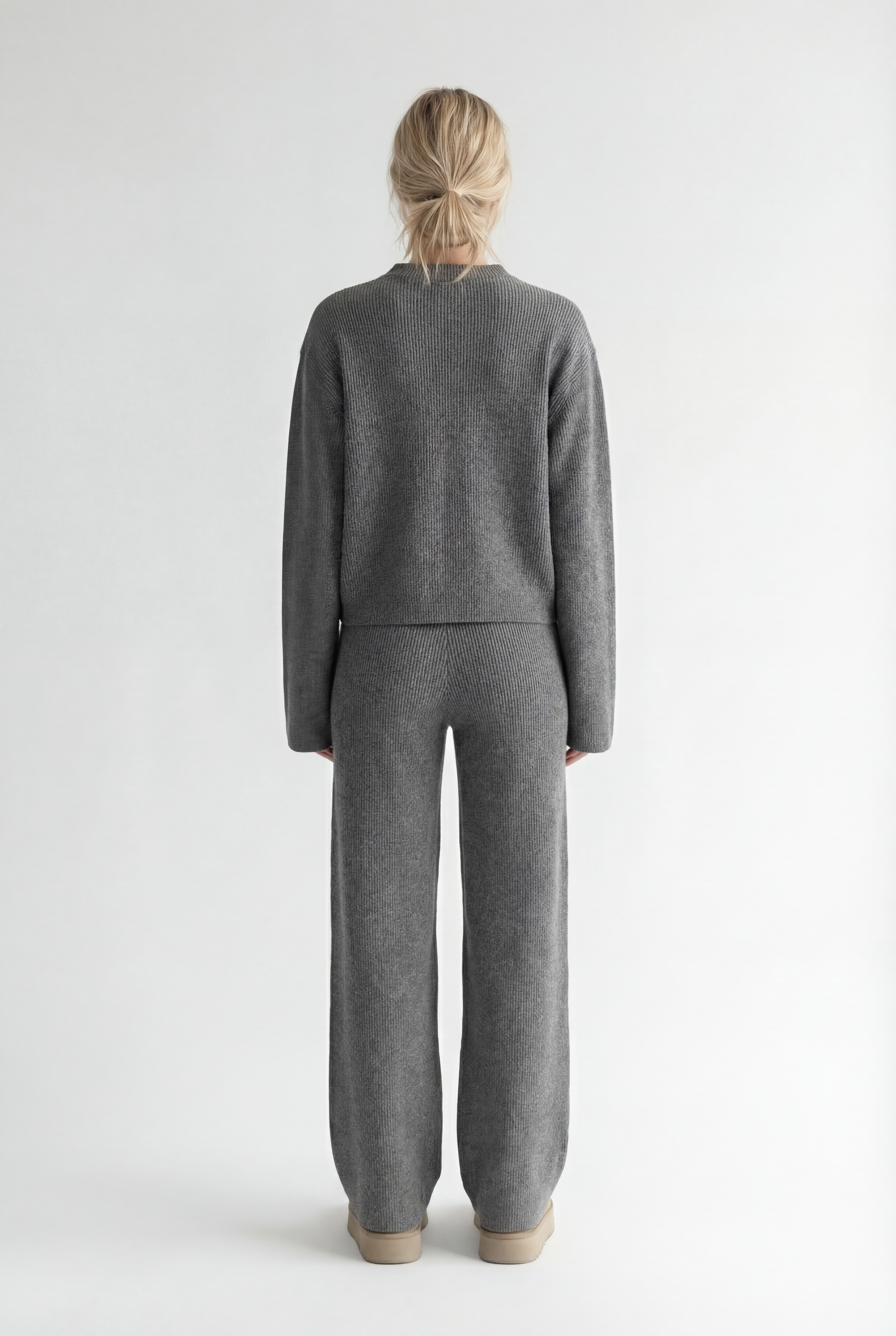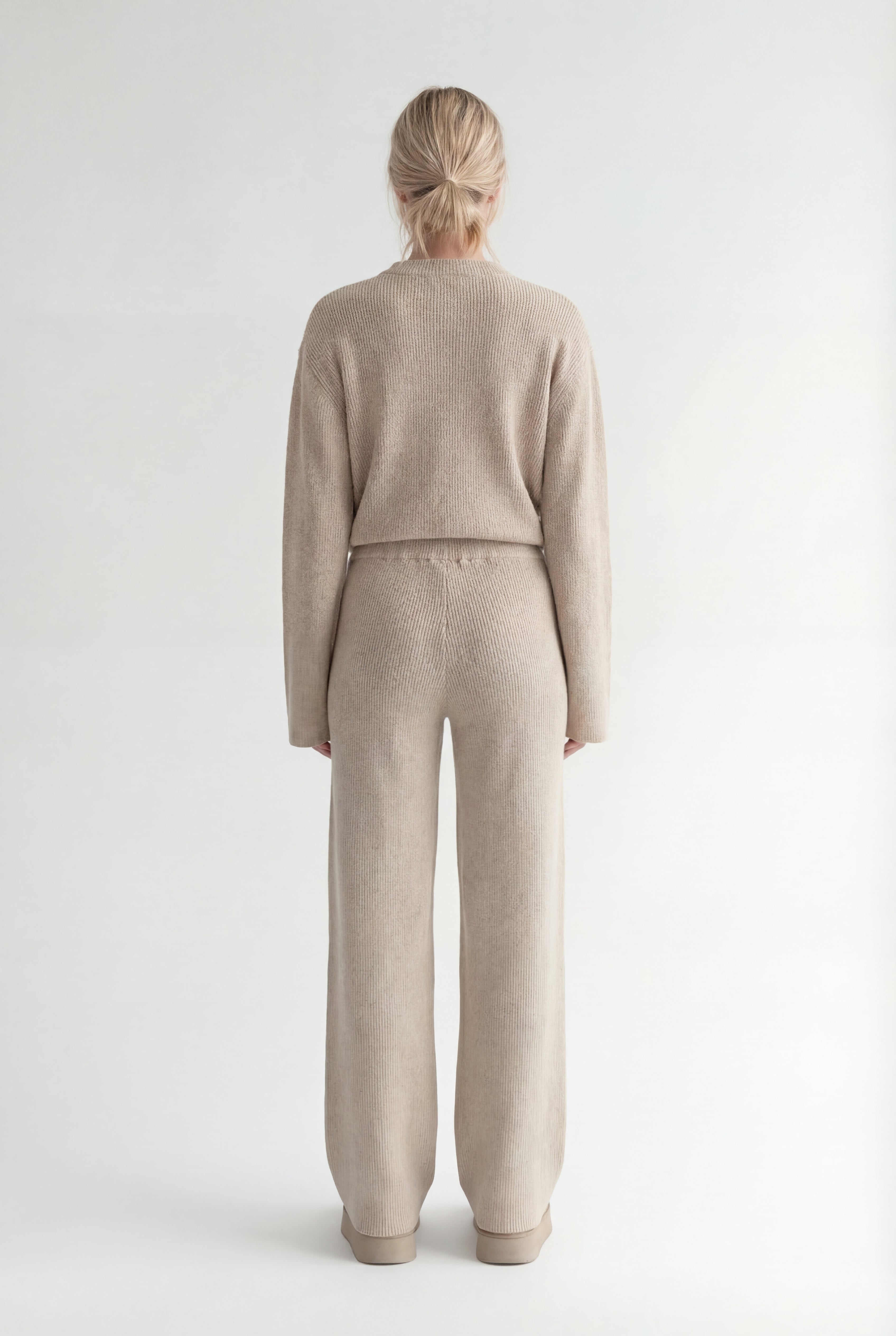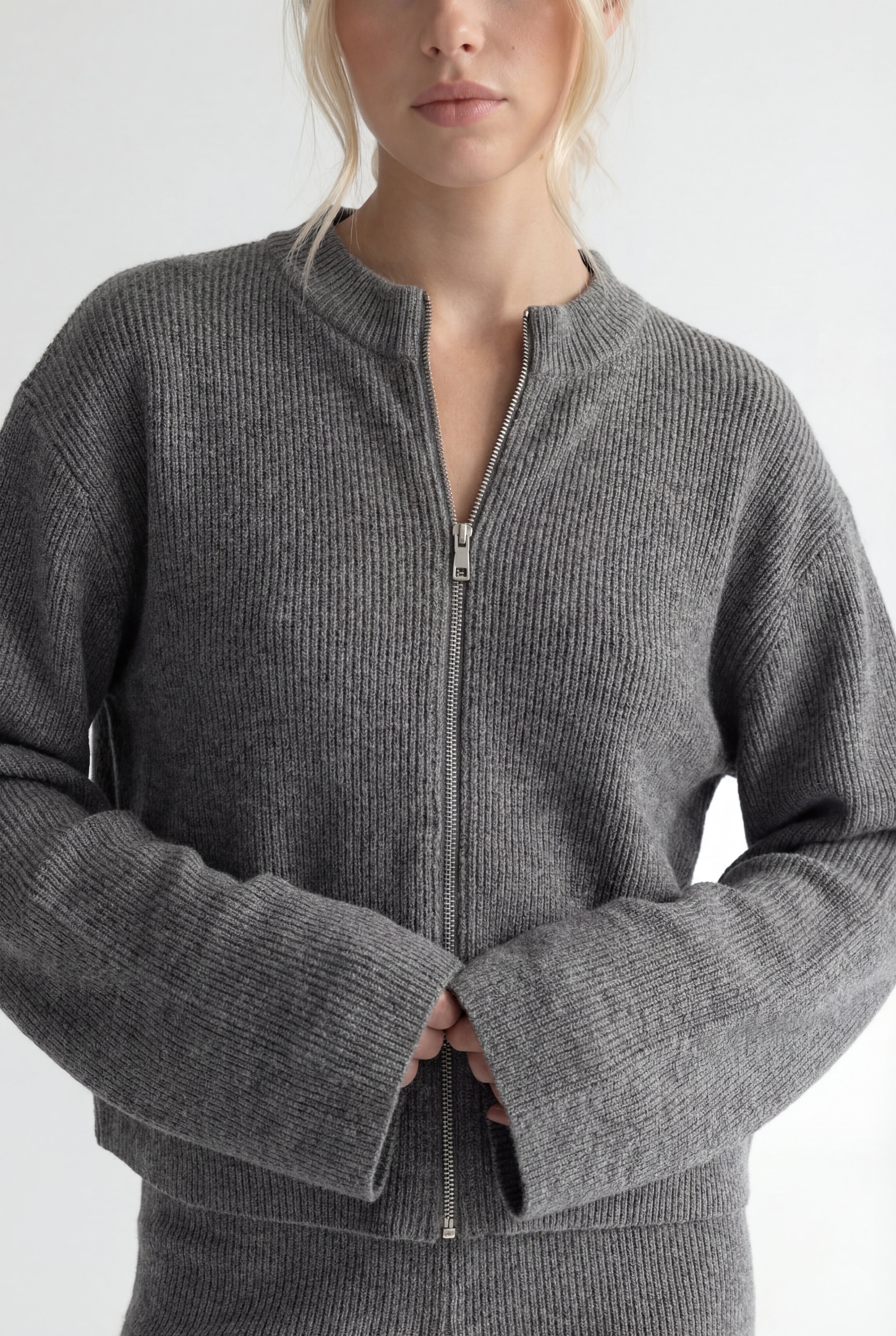 Atraskite stilių ir komfortą viename su megztu kostiumėliu „Aurélie“. Šis dviejų dalių komplektas – minimalistinis užtrauktuku segamas megztinis ir platėjančios kelnės – sukurtas moderniai moteriai, kuri vertina eleganciją bei laisvę judėti.