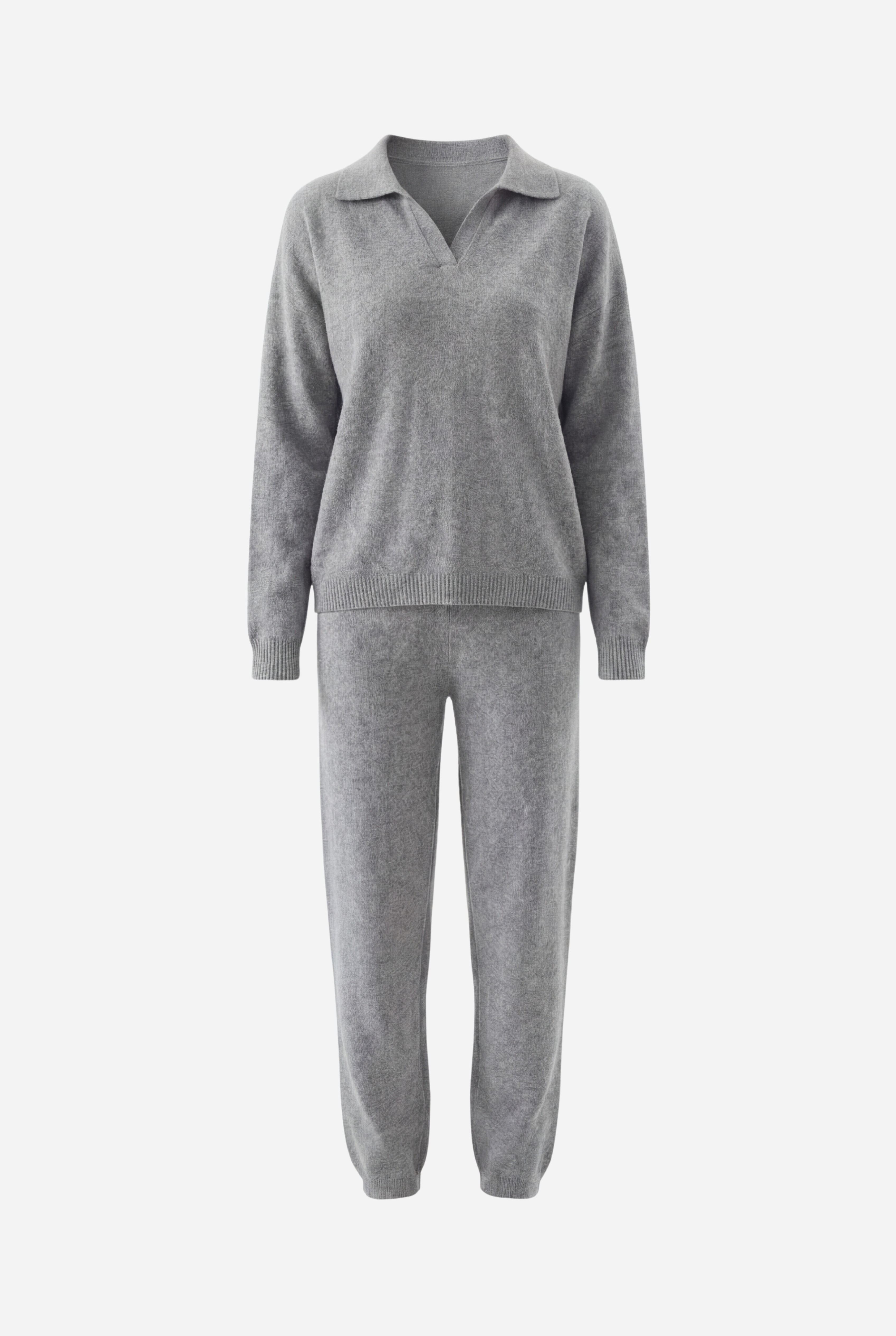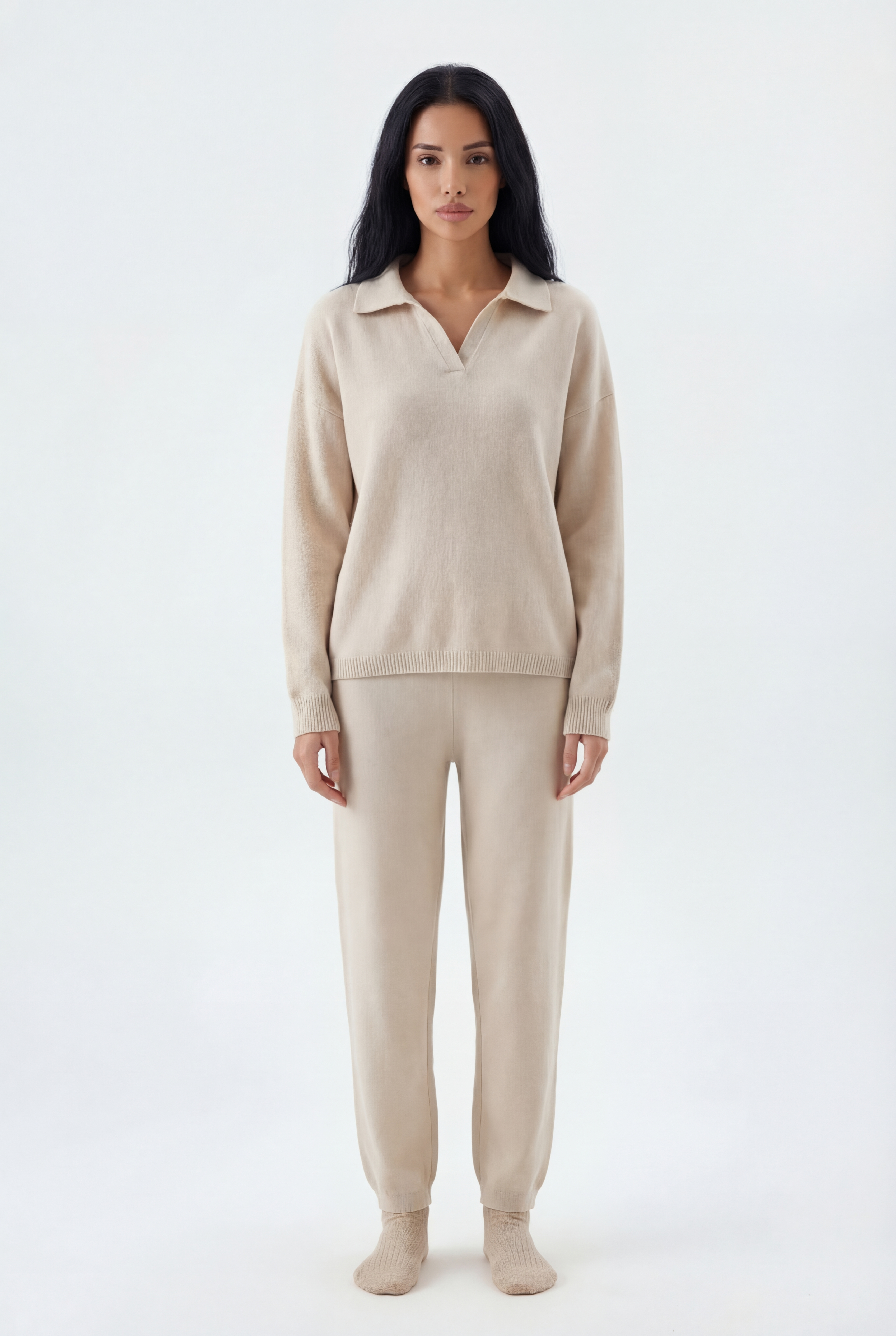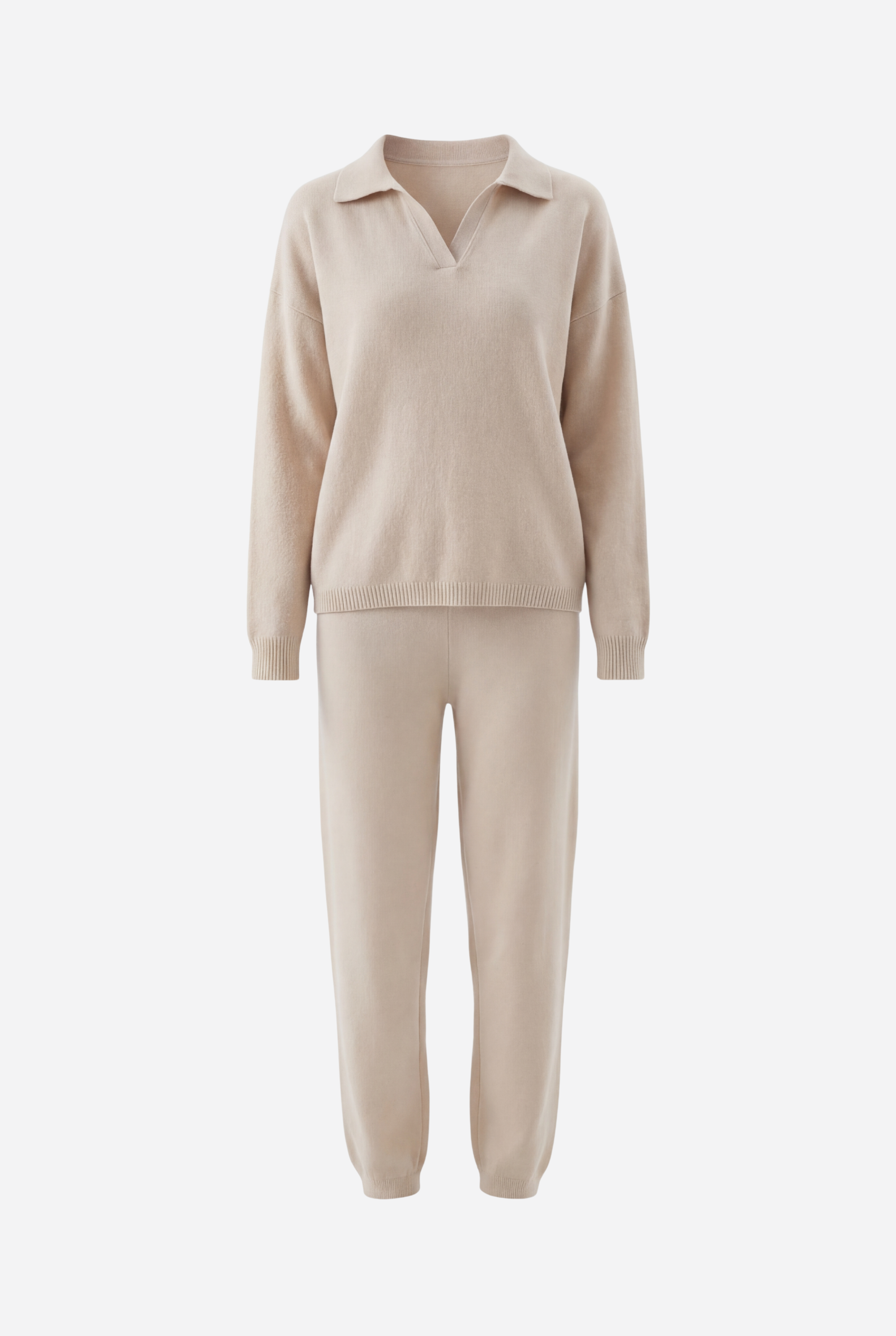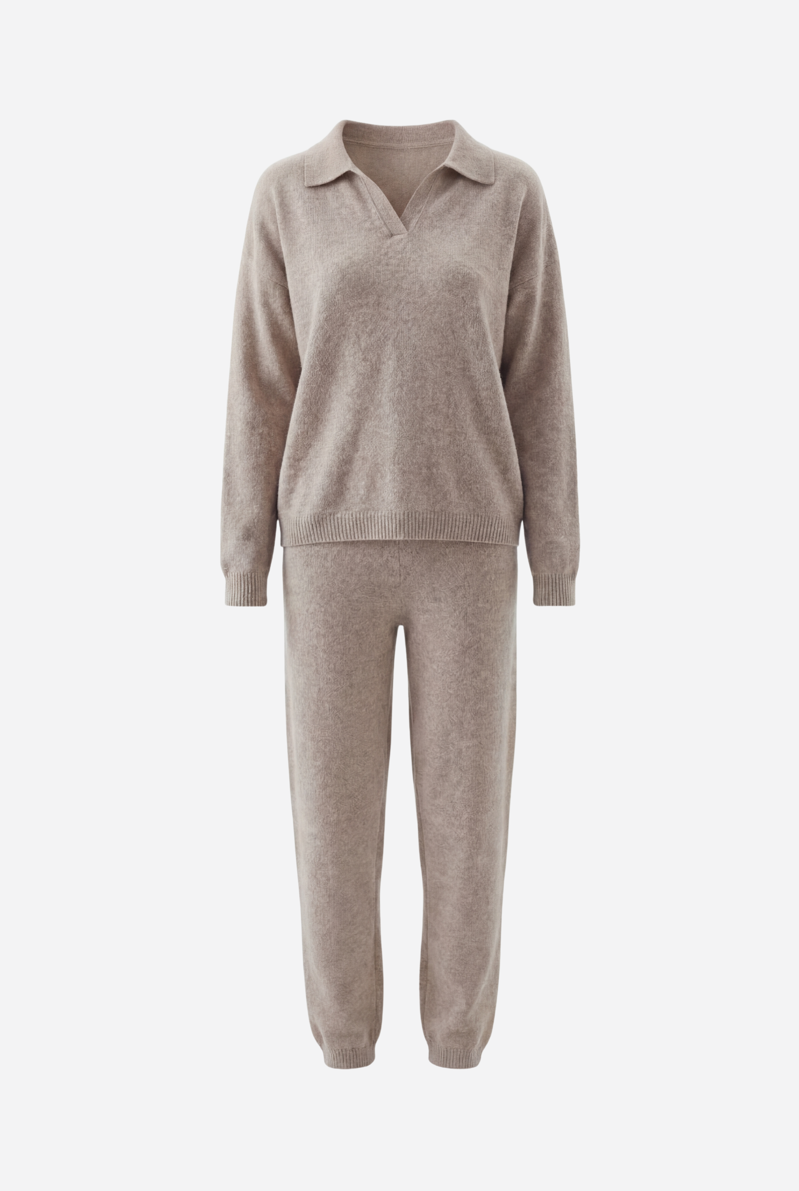 Šis dviejų dalių megztas komplektas sukurtas jaukiam, stilingam komfortui: laisvo kirpimo megztinis derinamas su tiesiomis megztomis kelnėmis, pagamintas iš švelnaus ir tamprio mezgimo audinio.