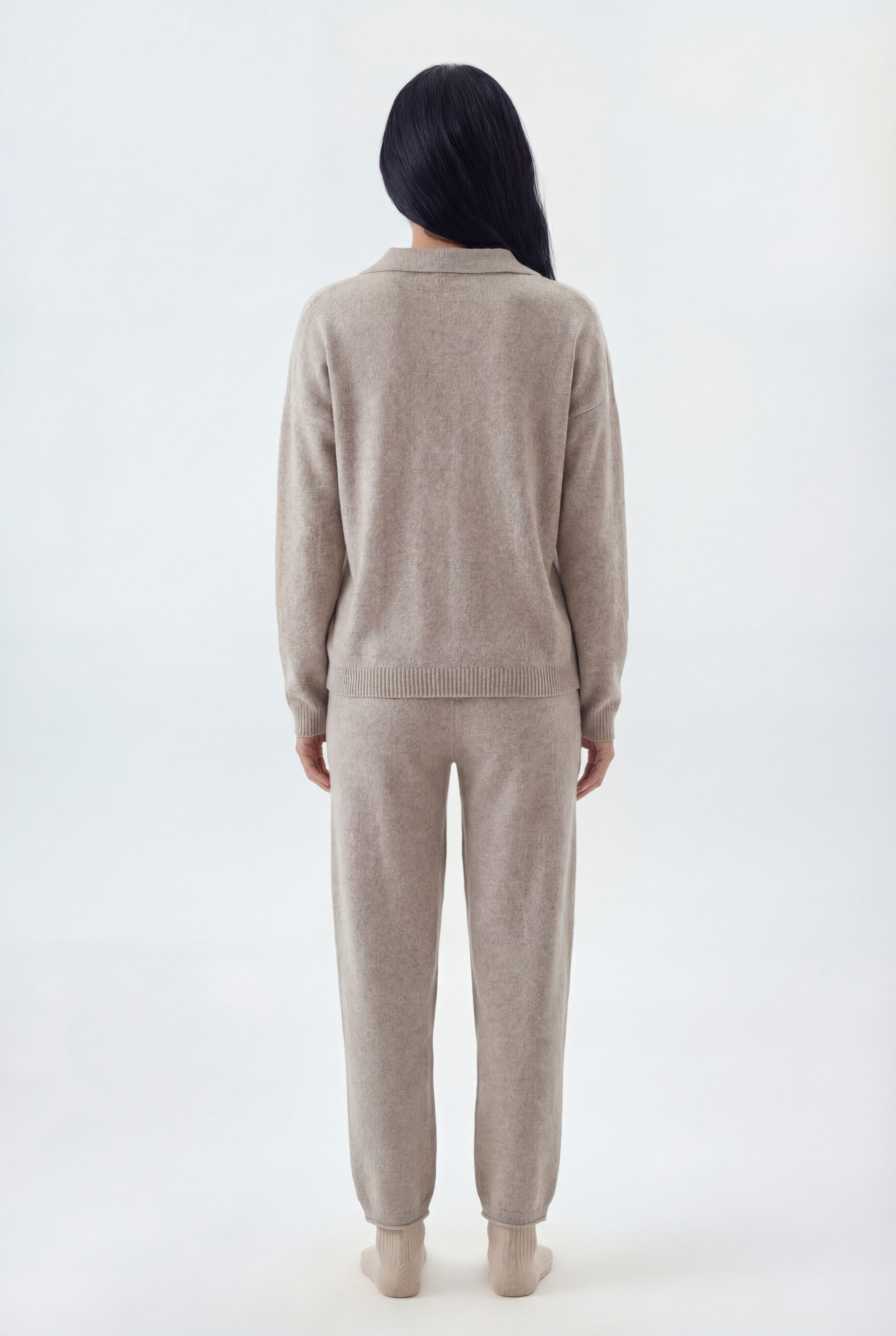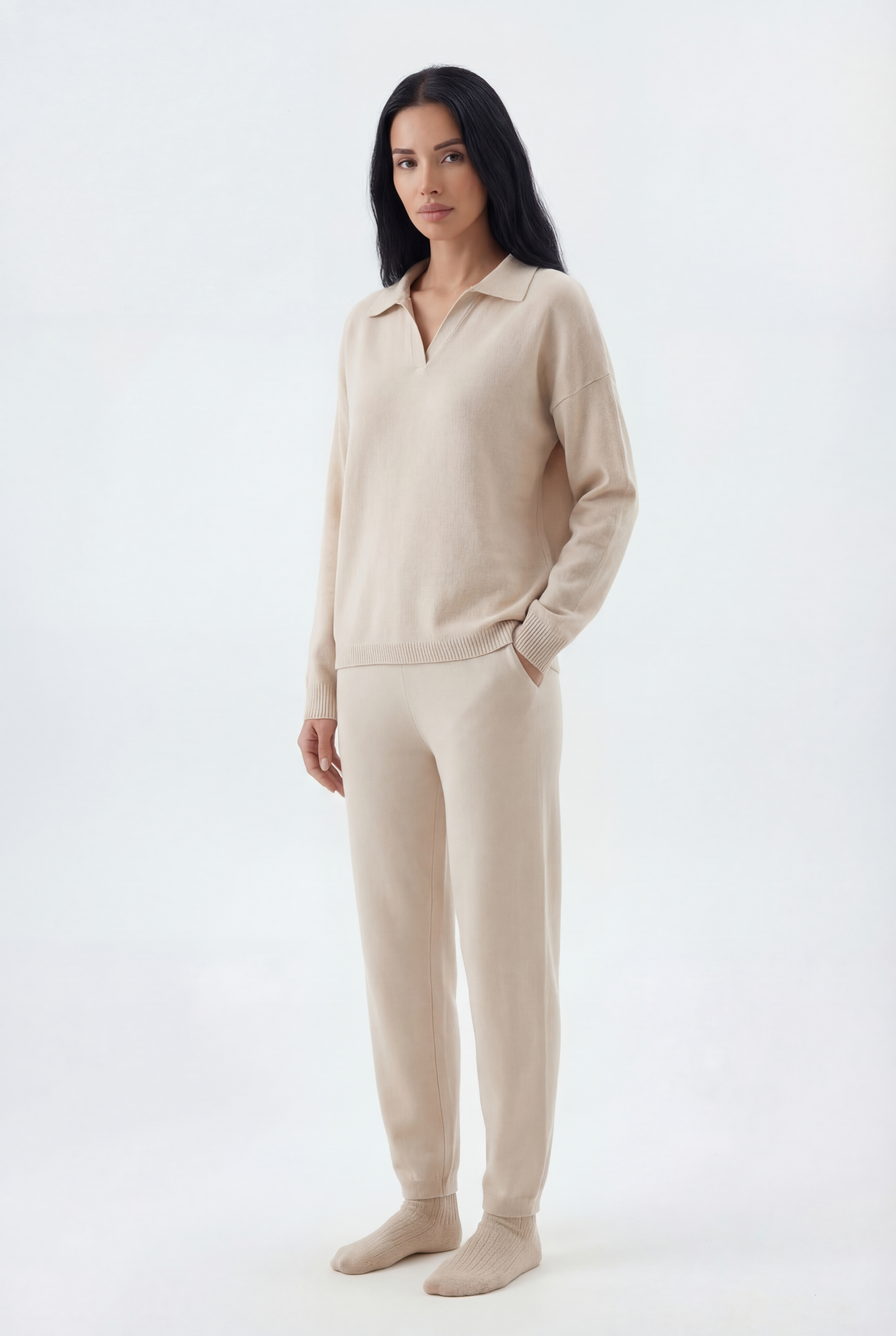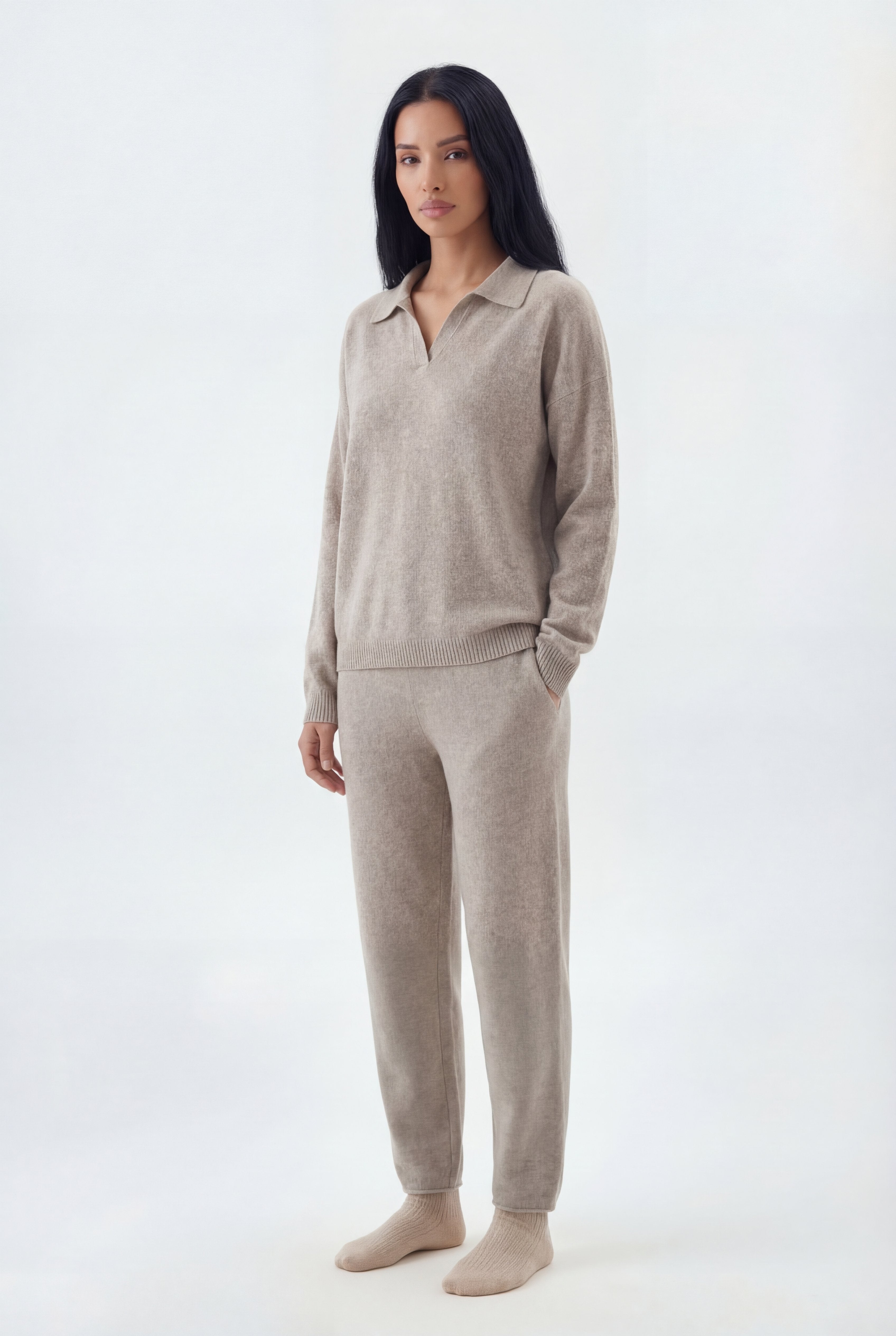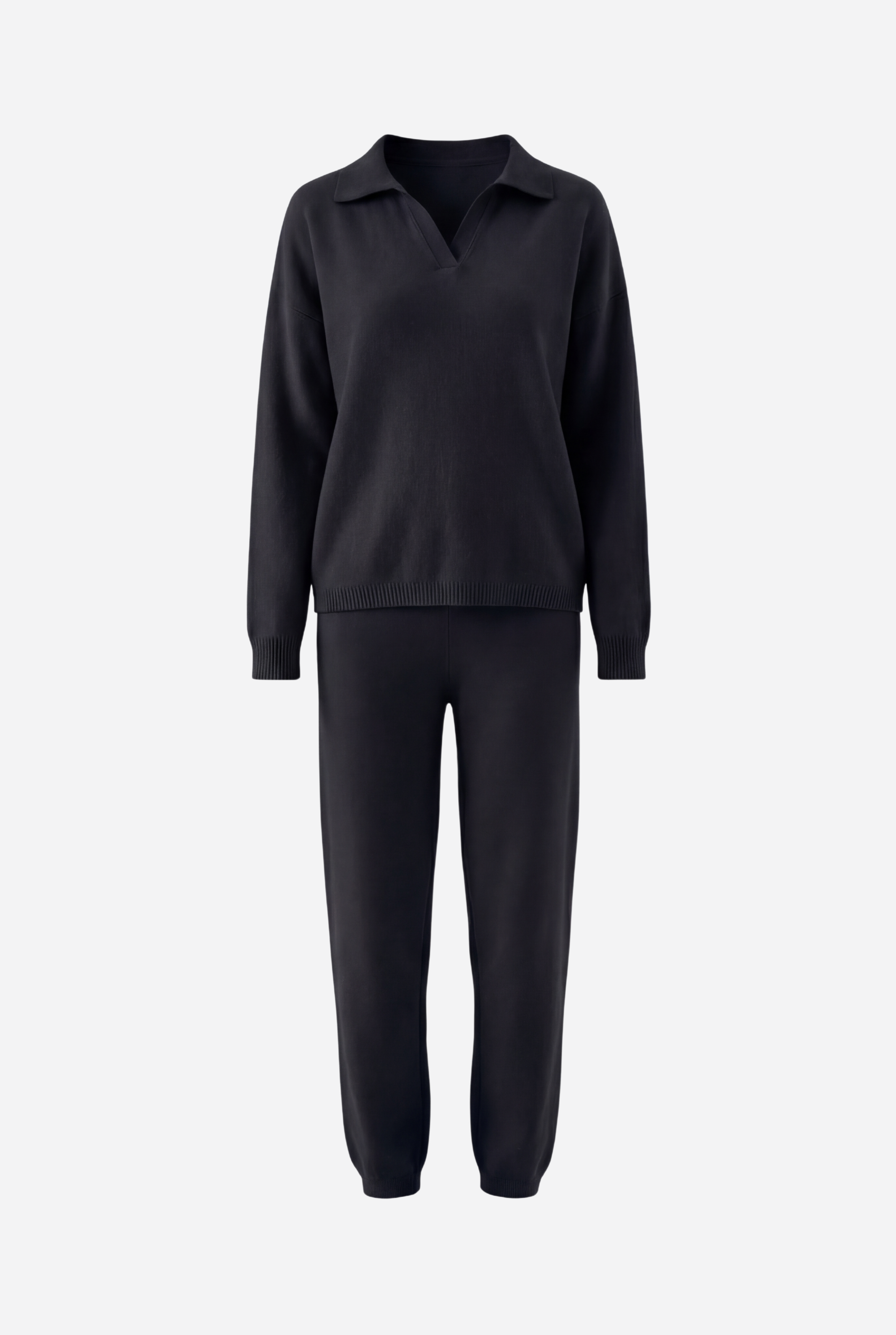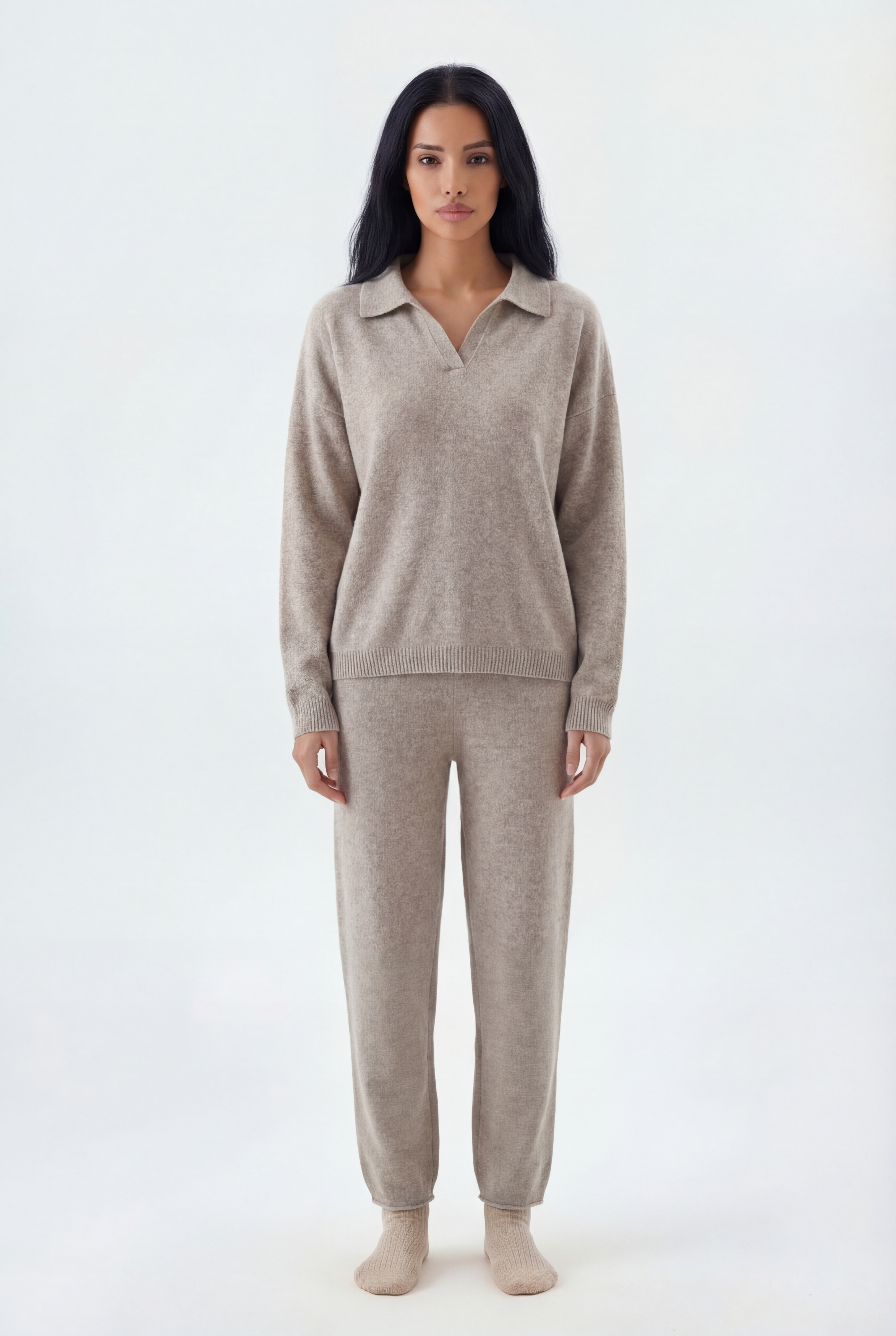 Šis dviejų dalių megztas komplektas sukurtas jaukiam, stilingam komfortui: laisvo kirpimo megztinis derinamas su tiesiomis megztomis kelnėmis, pagamintas iš švelnaus ir tamprio mezgimo audinio.
