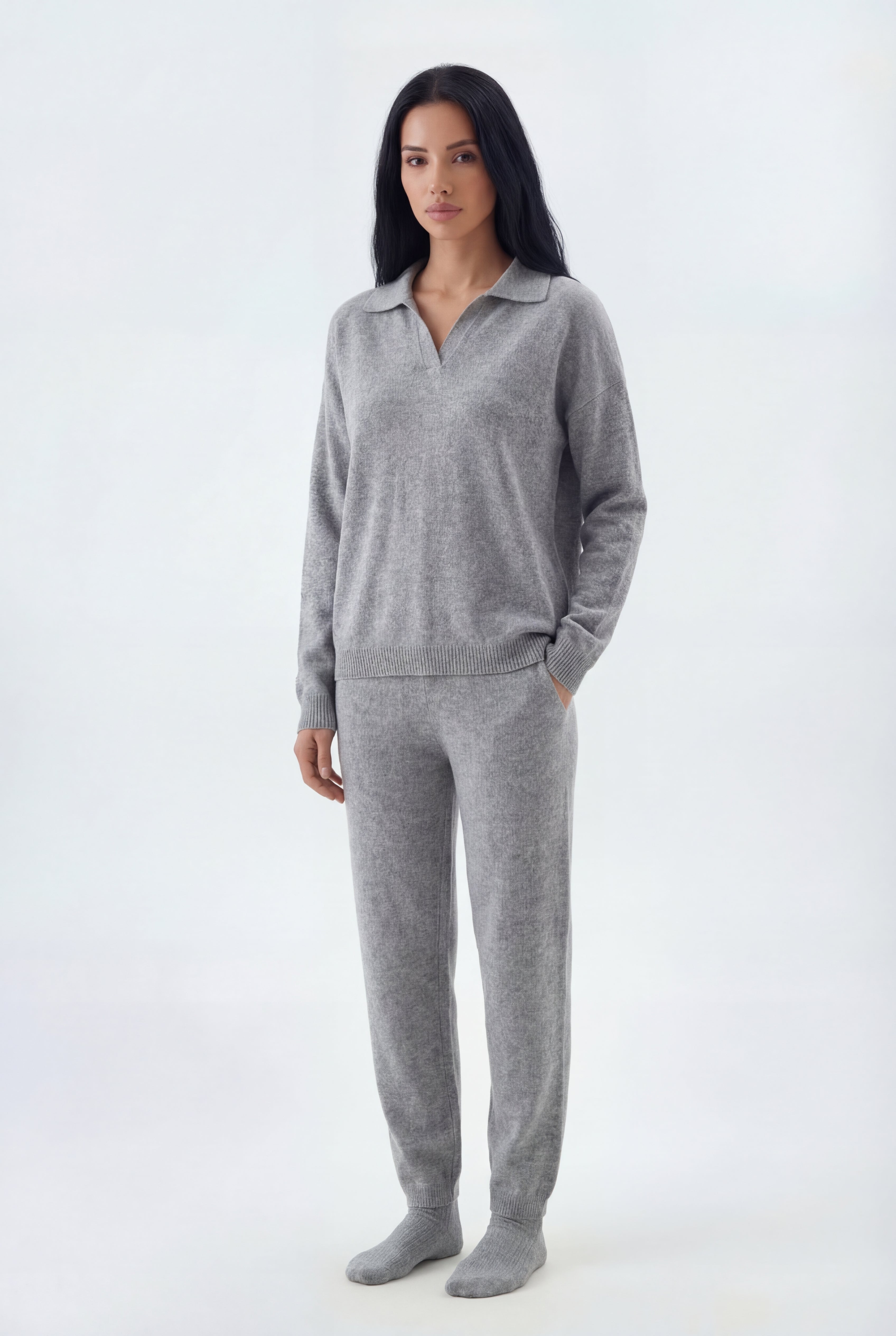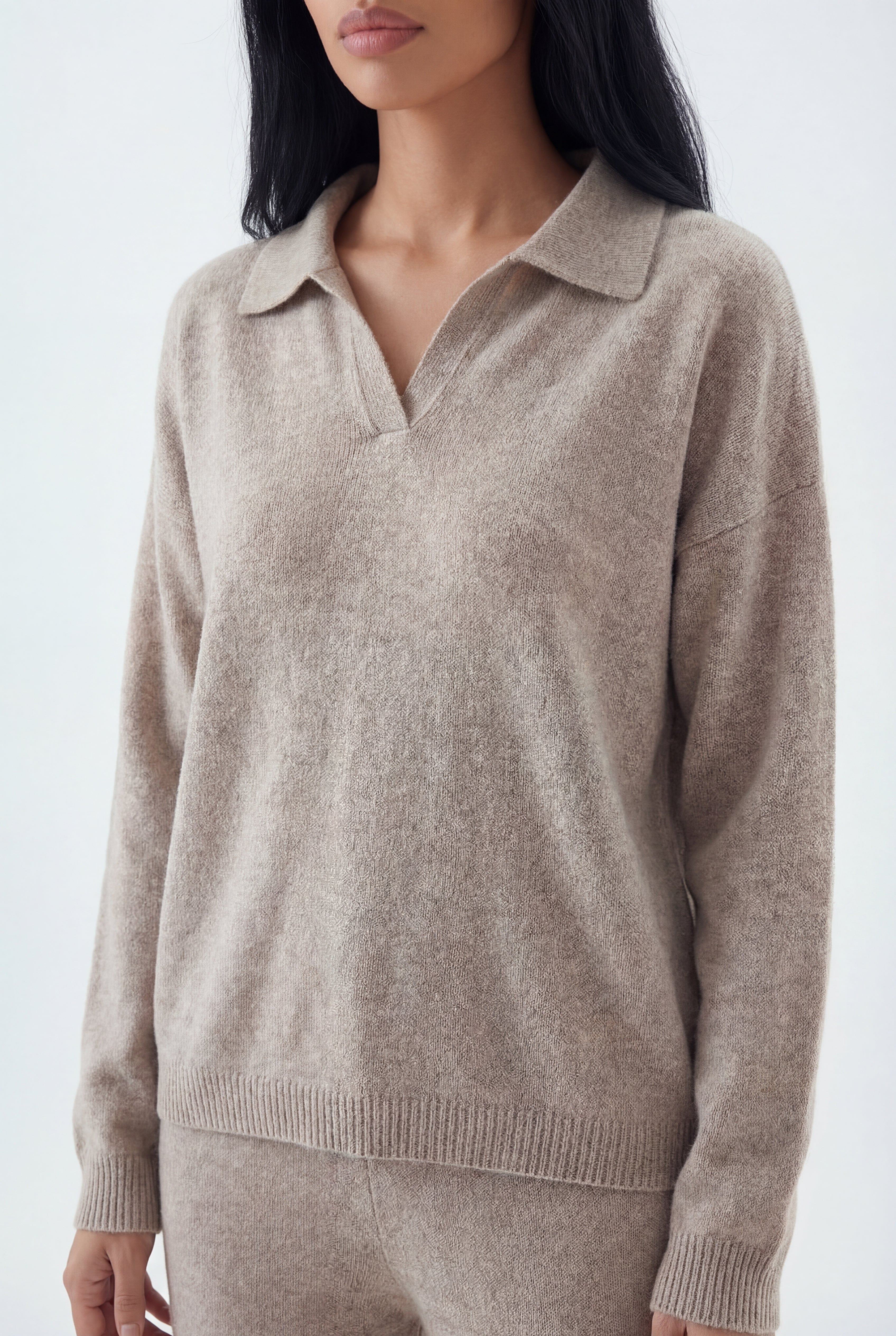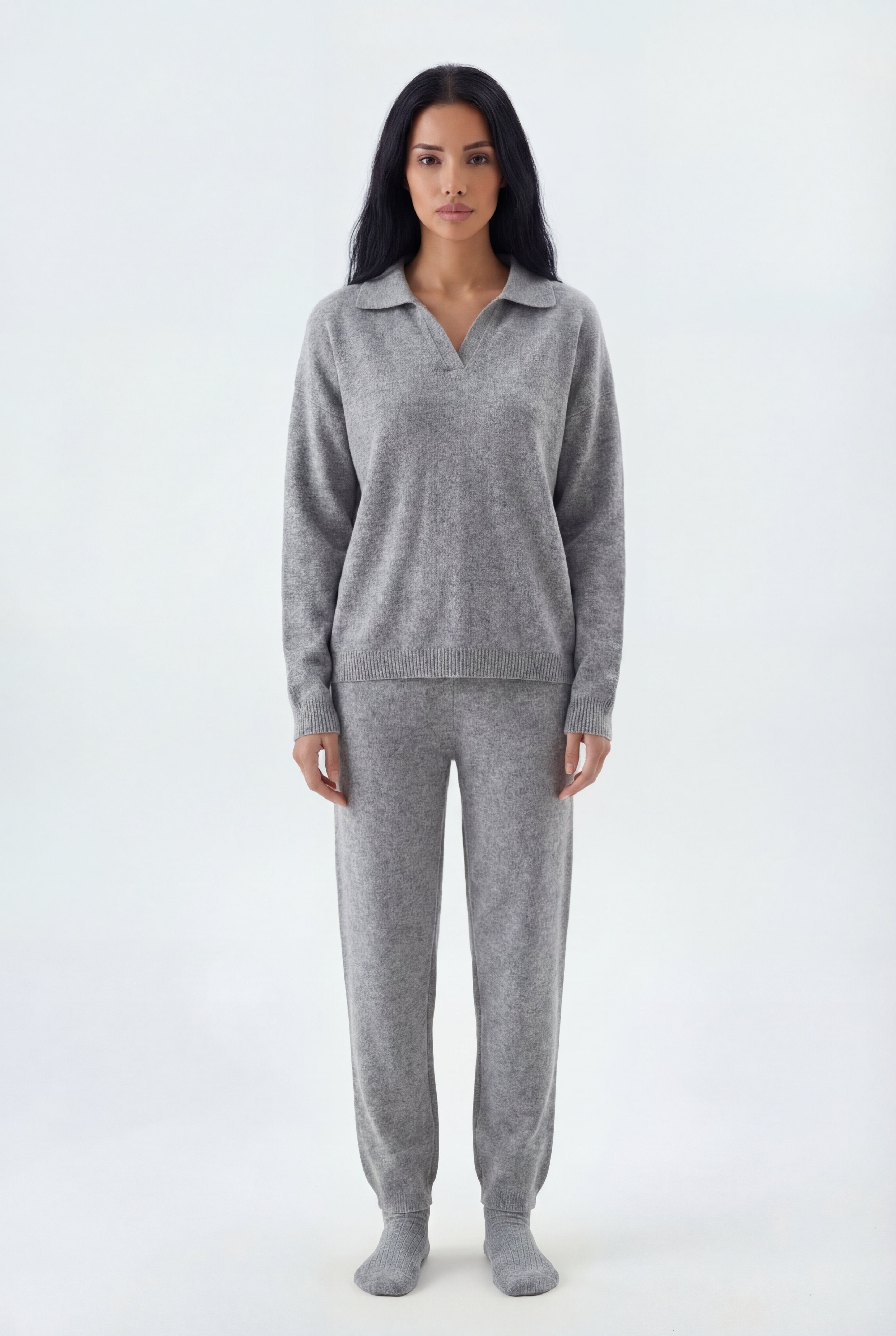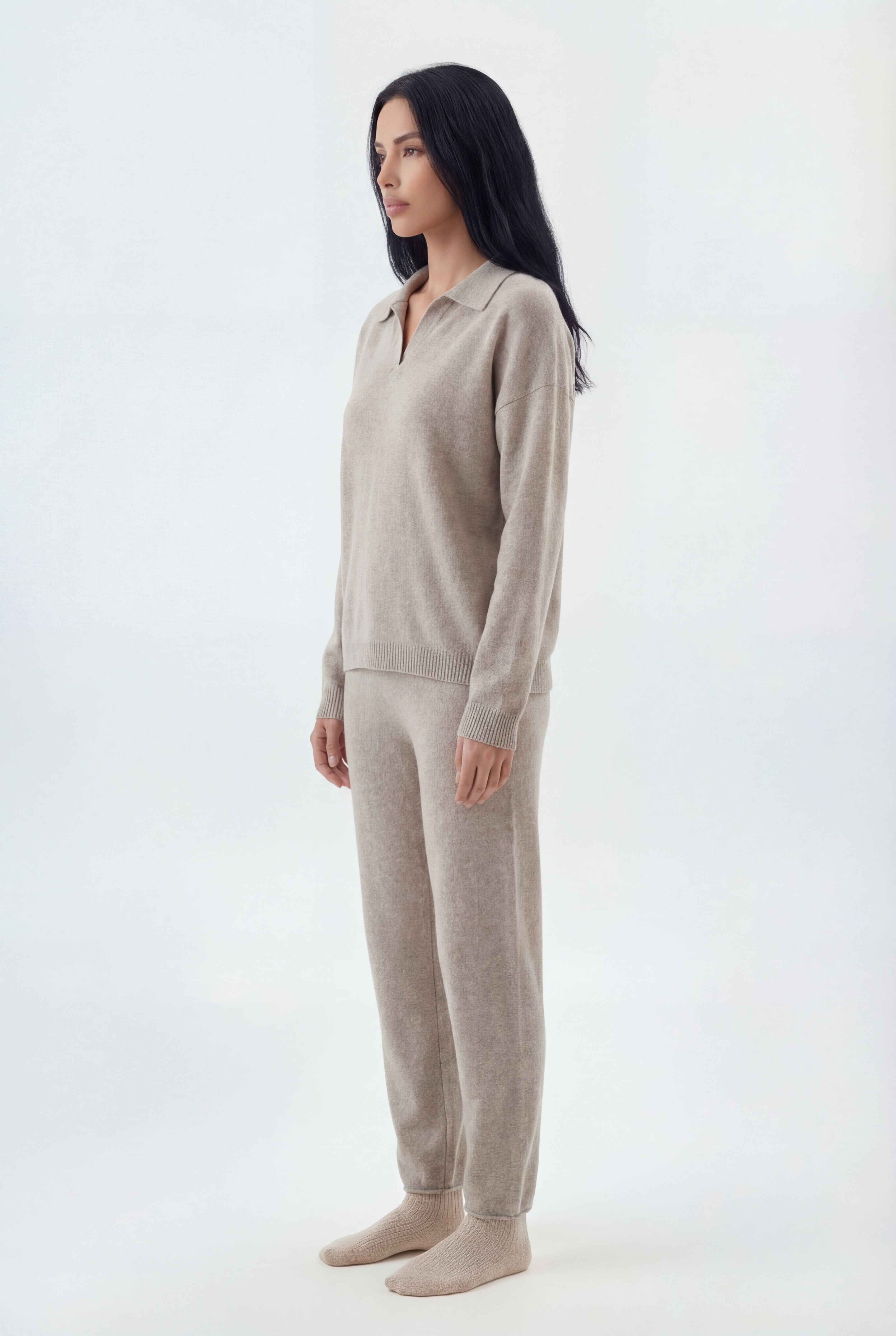 Šis dviejų dalių megztas komplektas sukurtas jaukiam, stilingam komfortui: laisvo kirpimo megztinis derinamas su tiesiomis megztomis kelnėmis, pagamintas iš švelnaus ir tamprio mezgimo audinio.