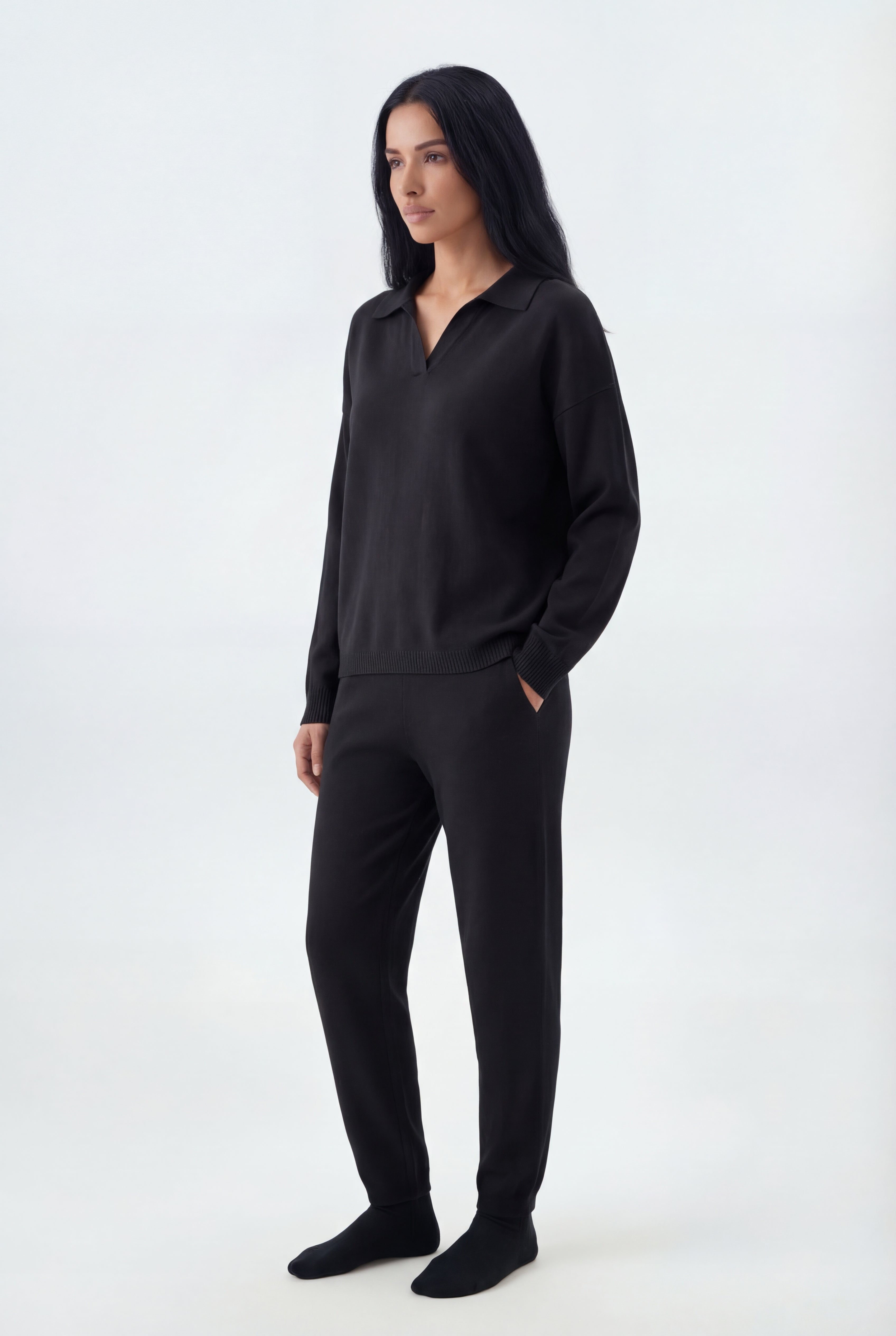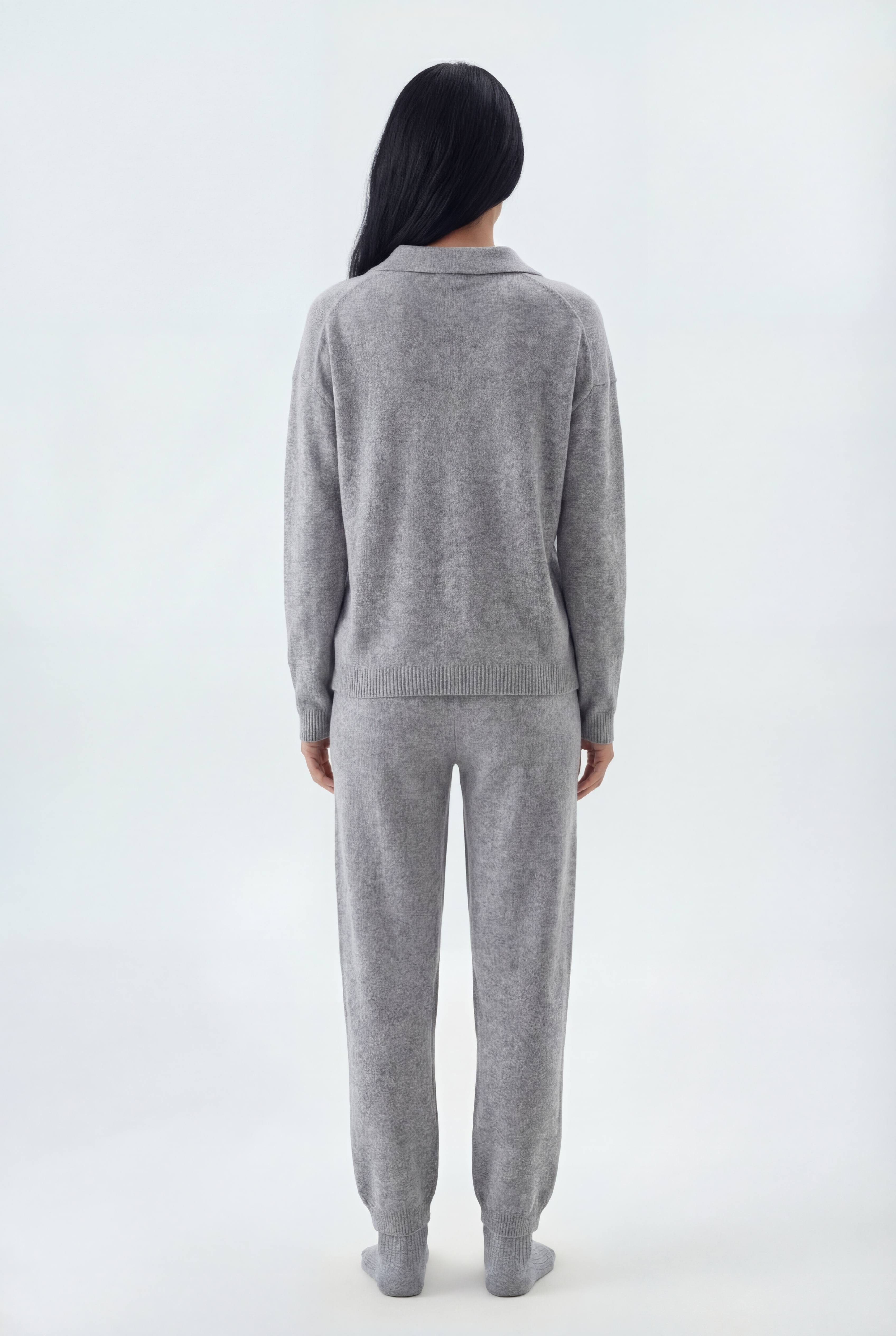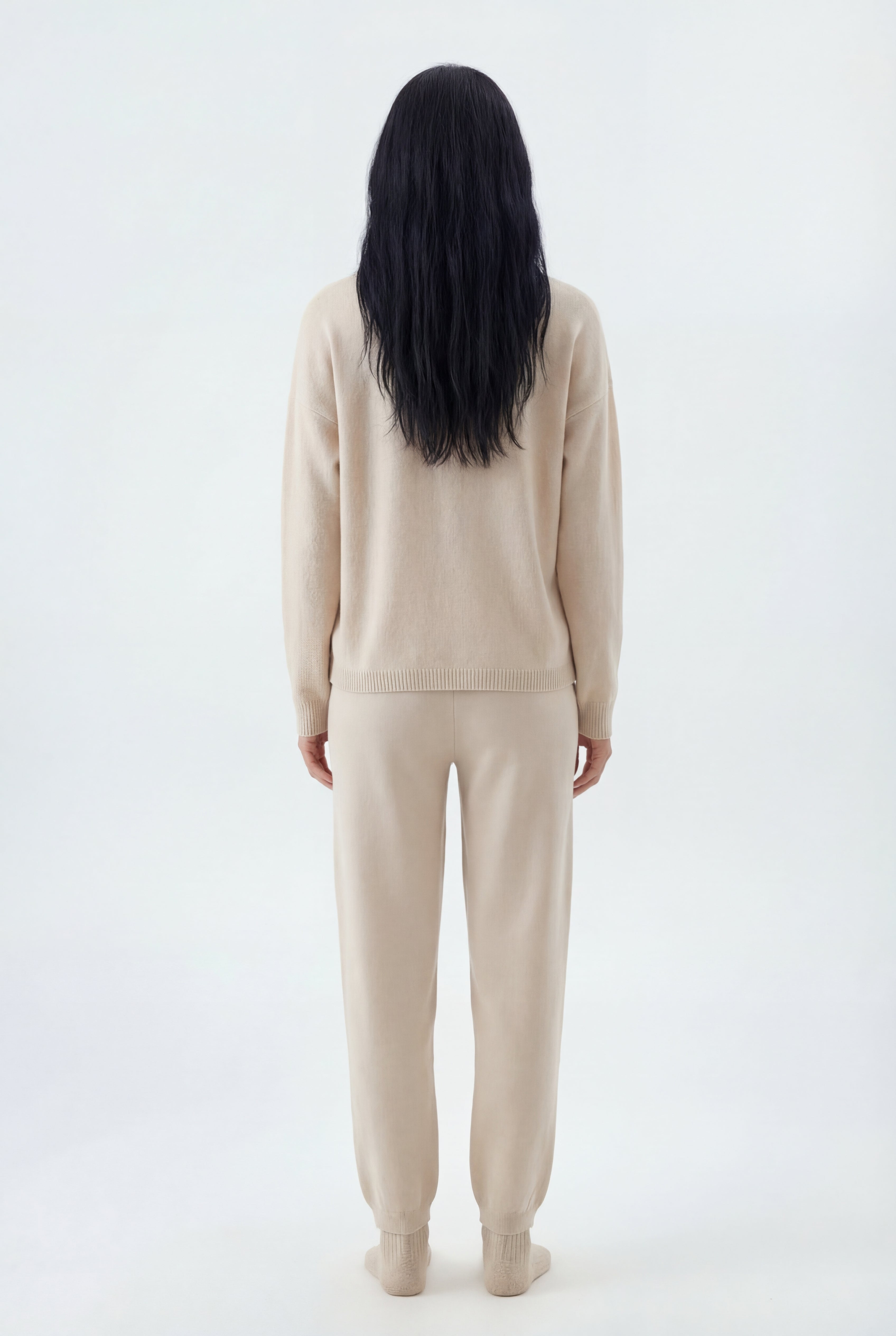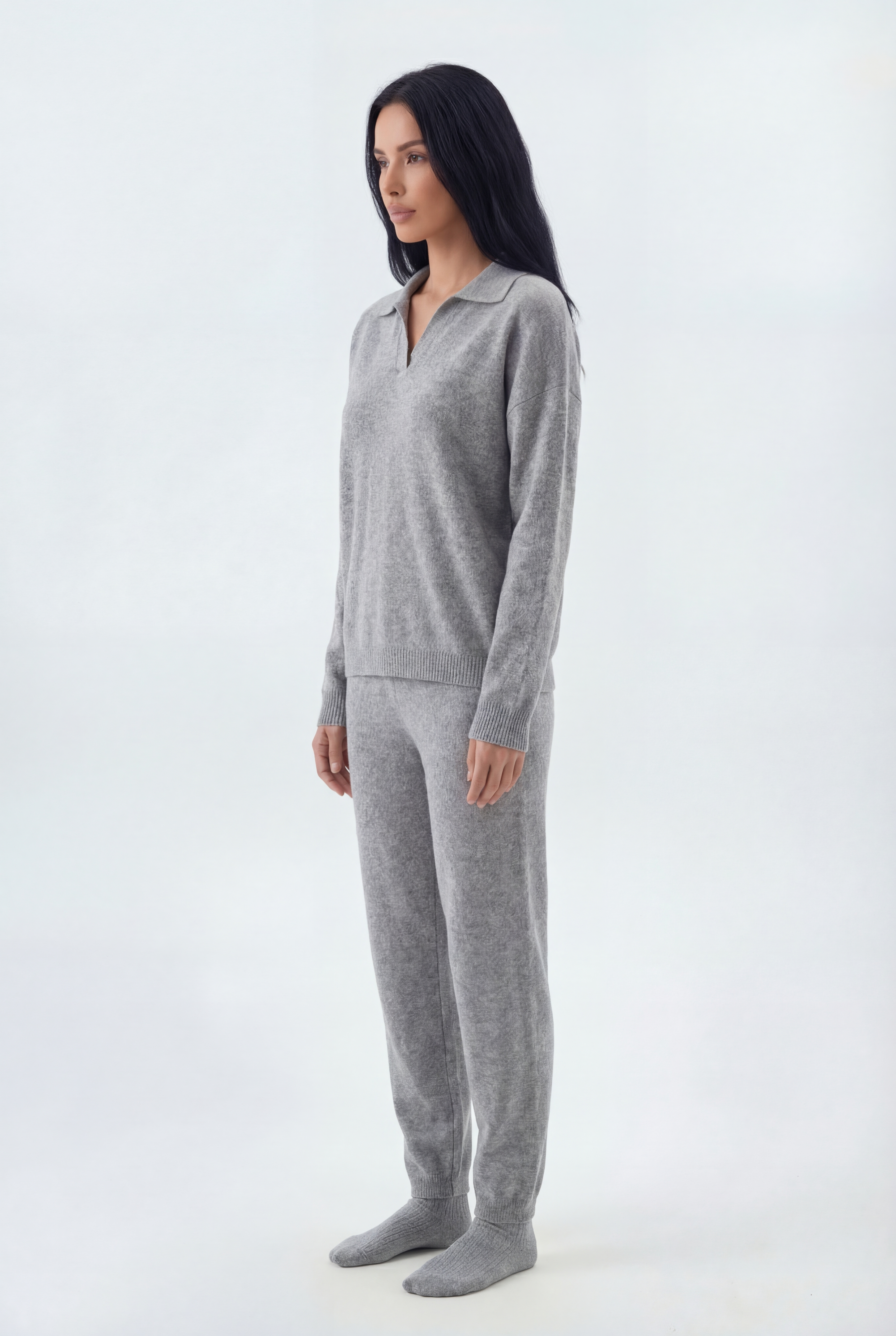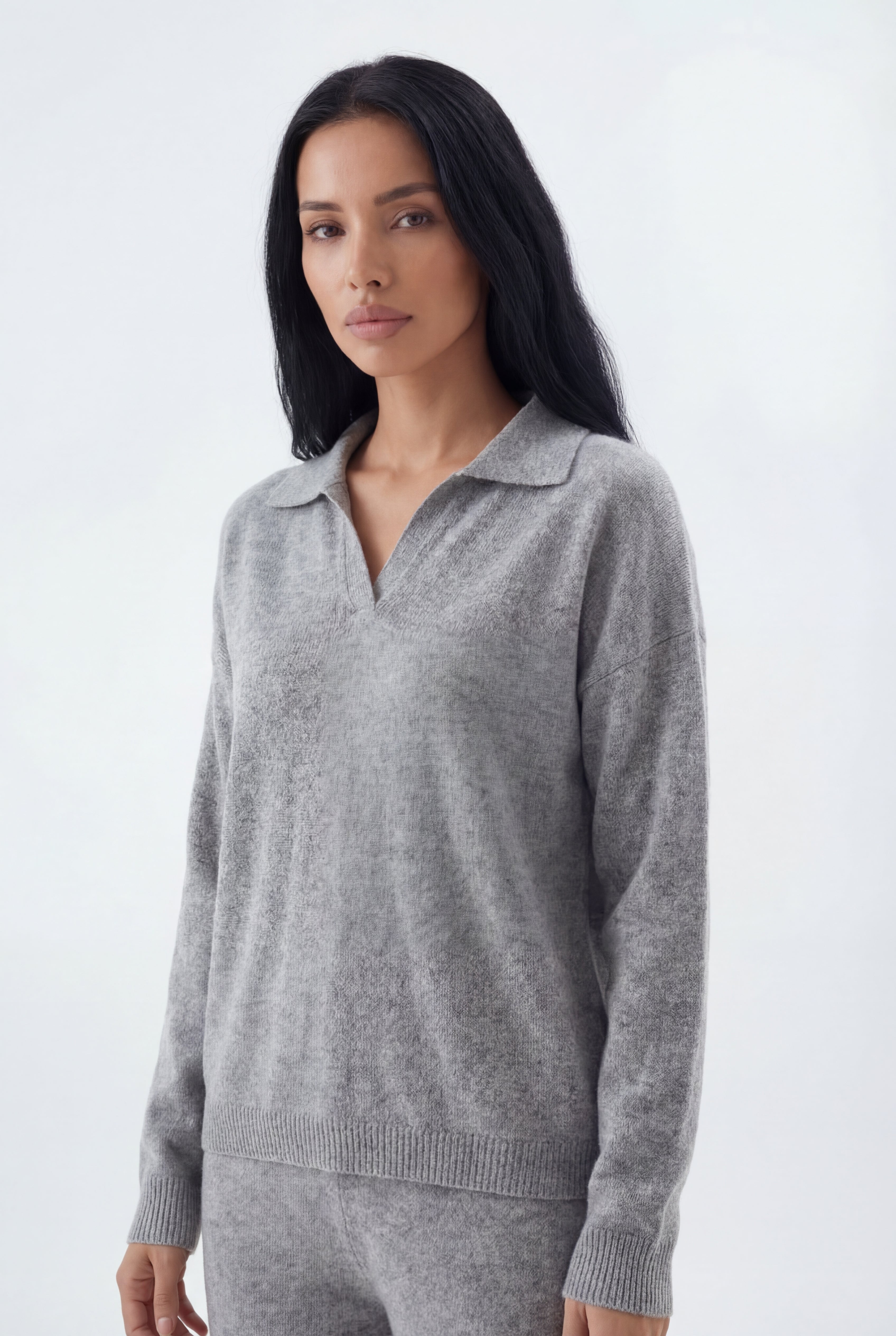 Šis dviejų dalių megztas komplektas sukurtas jaukiam, stilingam komfortui: laisvo kirpimo megztinis derinamas su tiesiomis megztomis kelnėmis, pagamintas iš švelnaus ir tamprio mezgimo audinio.