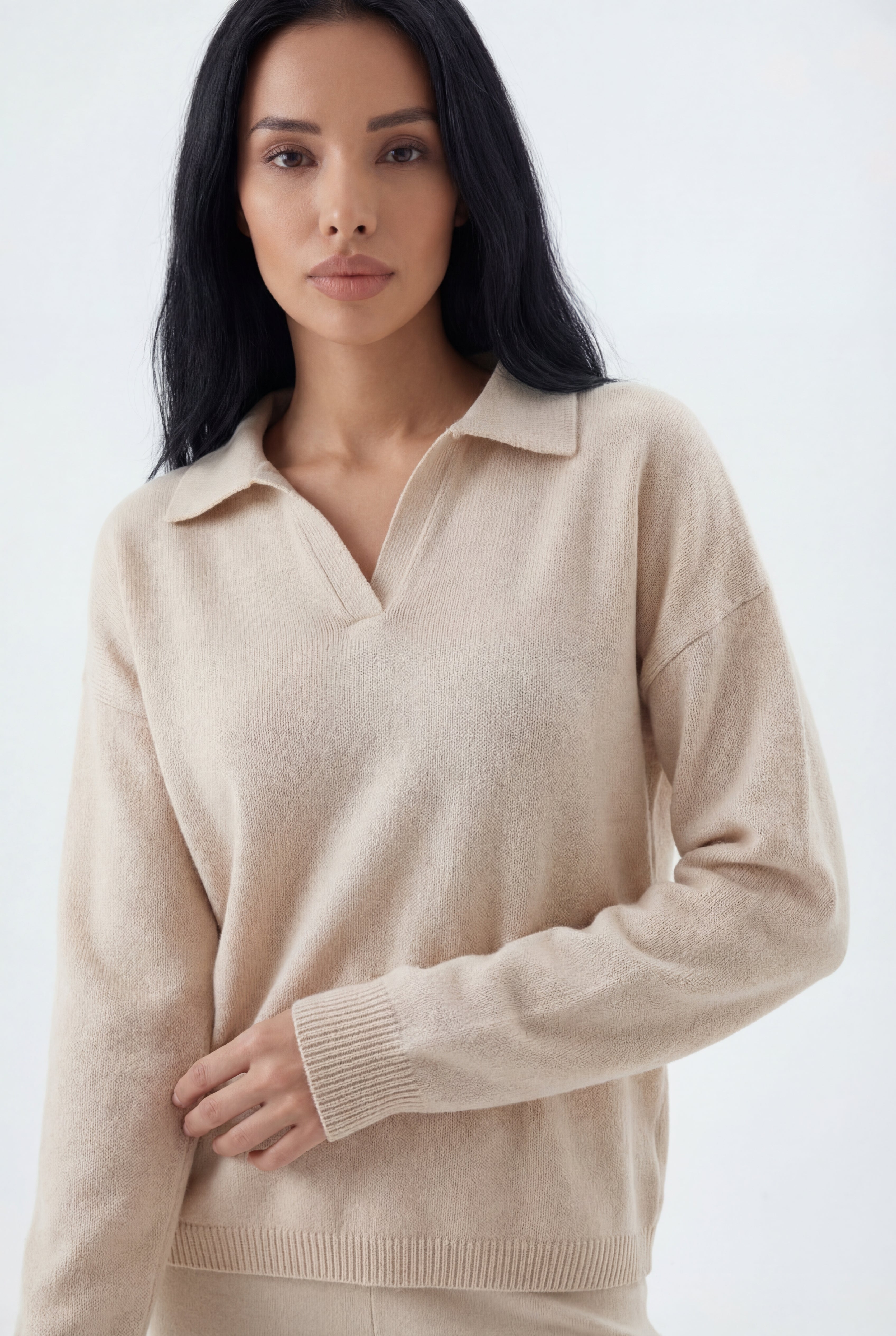 Įkvėptas šiuolaikinio miesto stiliaus, šis komplektas sujungia jaukų, prabangų pojūtį su minimalistiniu dizainu — megztinis su subtiliai išreikšta tekstūra derinamas su laisvo silueto kelnėmis.